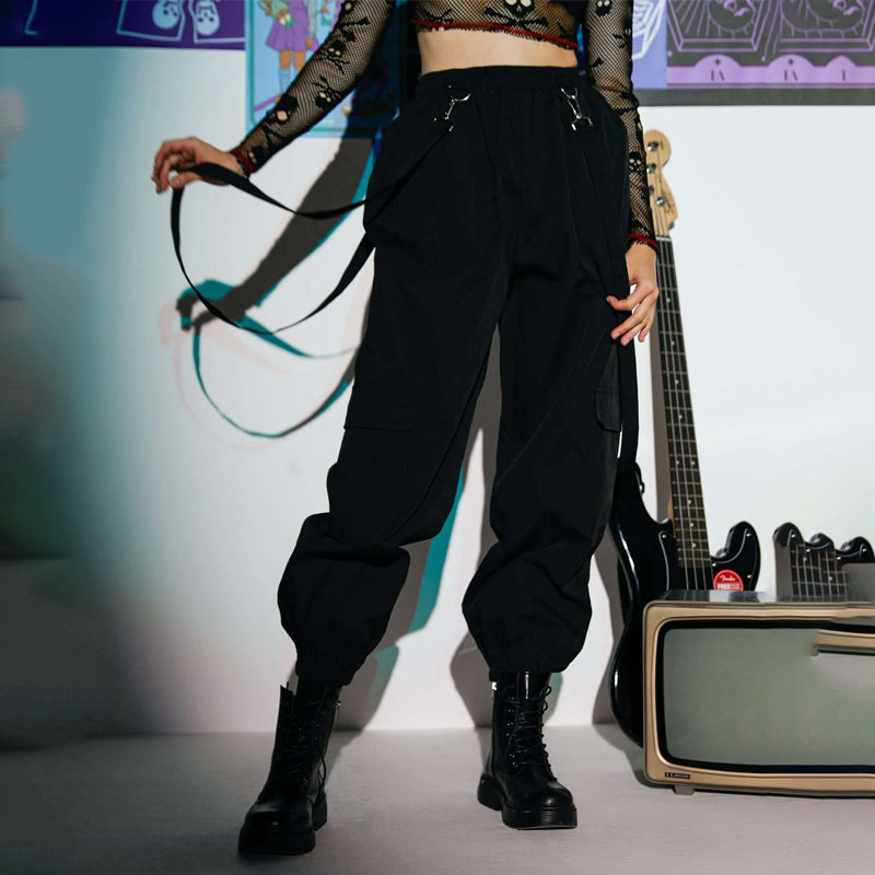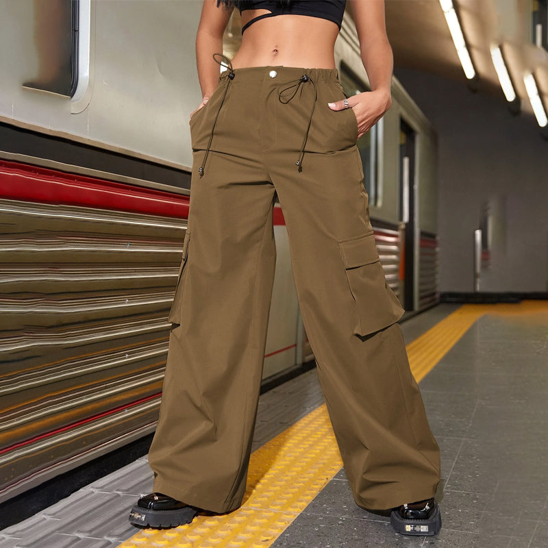 Street Drawstring Waist Flap Pockets Wide Leg Parachute Cargo Pants