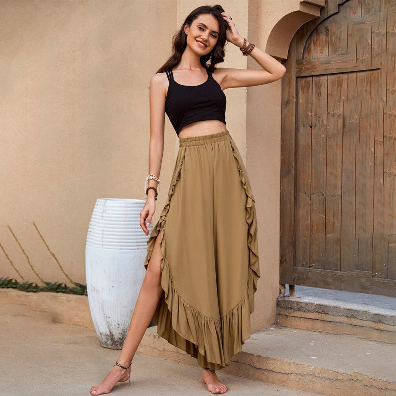 Elastic Waist Ruffle Hem Wide Leg Pants