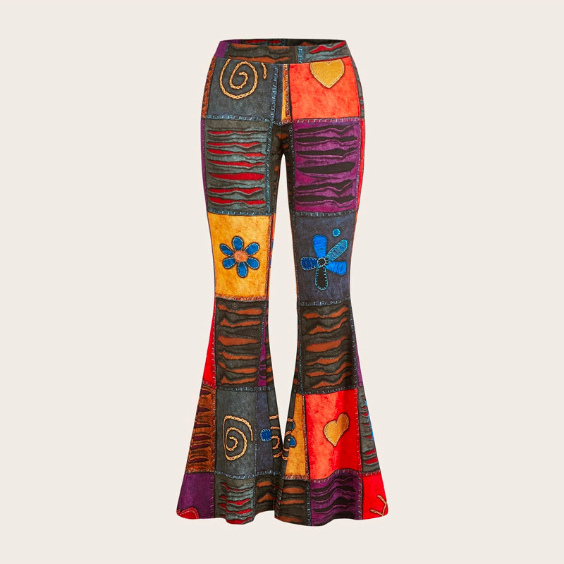 Grunge Patchwork Print Flare Leg Pants