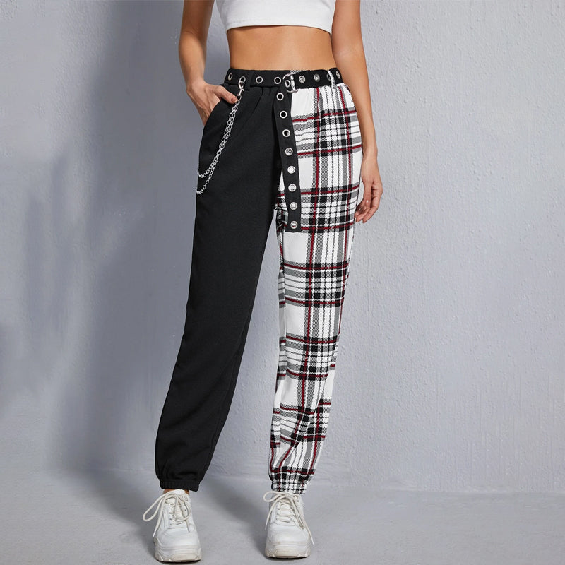 Color Block Tartan Chain Detail Belted Pants