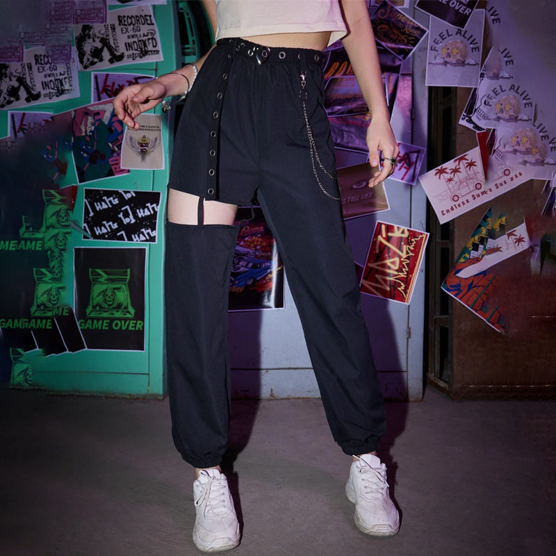 Grunge Punk Solid Belted Chain Cut-out Pants