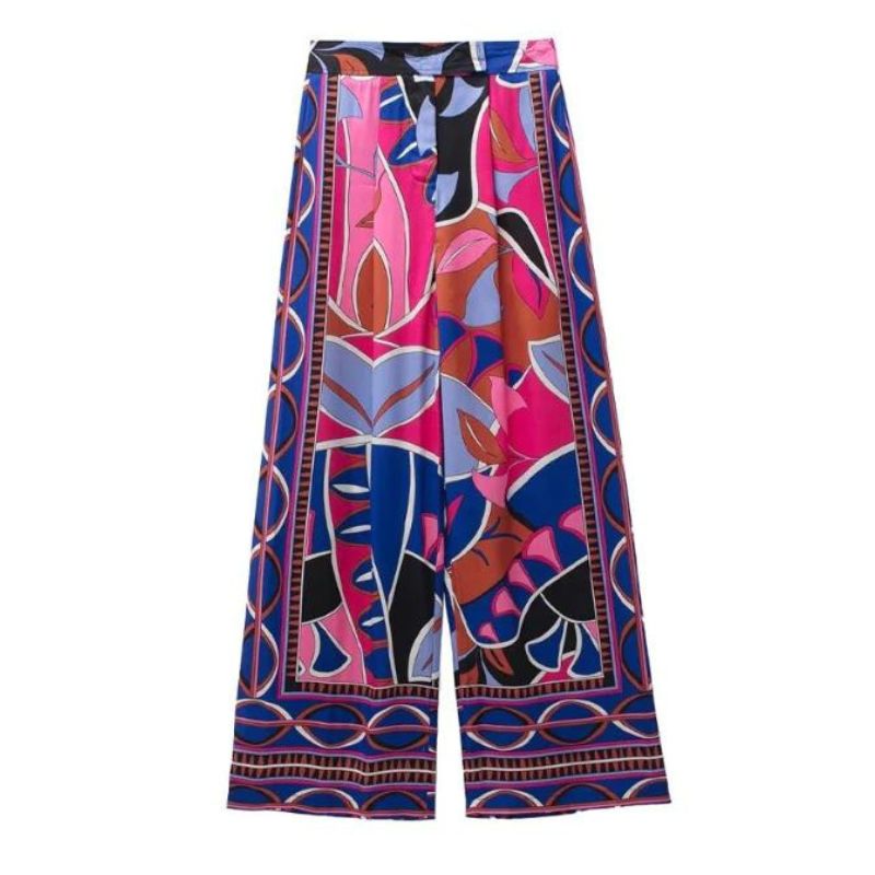 Vintage High Waist Back Elastic Printed Wide Leg Pants