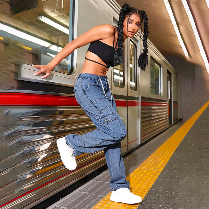 90s Street Drawstring Waist Flap Pocket Cargo Jeans give you a vintage feeling and a classy look. The jeans have a drawstring, pocket, zipper, and button that makes them very convenient to wear. You can pair it up with any kind of top of your choice. You don't have to worry about the color getting faded while washing it.