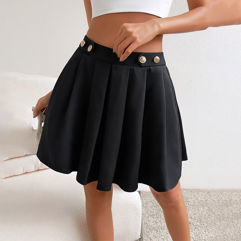 Button Detail Pleated Skirt is made from a flattering, durable fabric that fits like a glove. This lightweight flared skirt features a button front and a loose fit through the waistband, which makes it easy to move in. The full-length back slit offers plenty of room for movement on the dance floor or for just getting around in style.