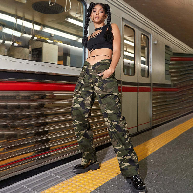 Camo Print Flap Pocket Waist Cargo Pants are perfect for wearing with a maxi dress and sneakers or do all-in-one as your work pant. These pants feature a drop waist, and pockets, it is a must-have in every woman’s closet, stylish and comfortable at the same time. The drawstring waist makes them perfect for every occasion.