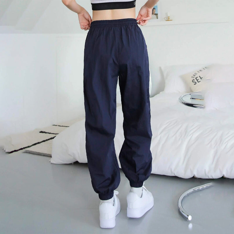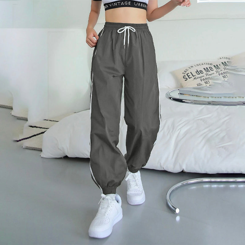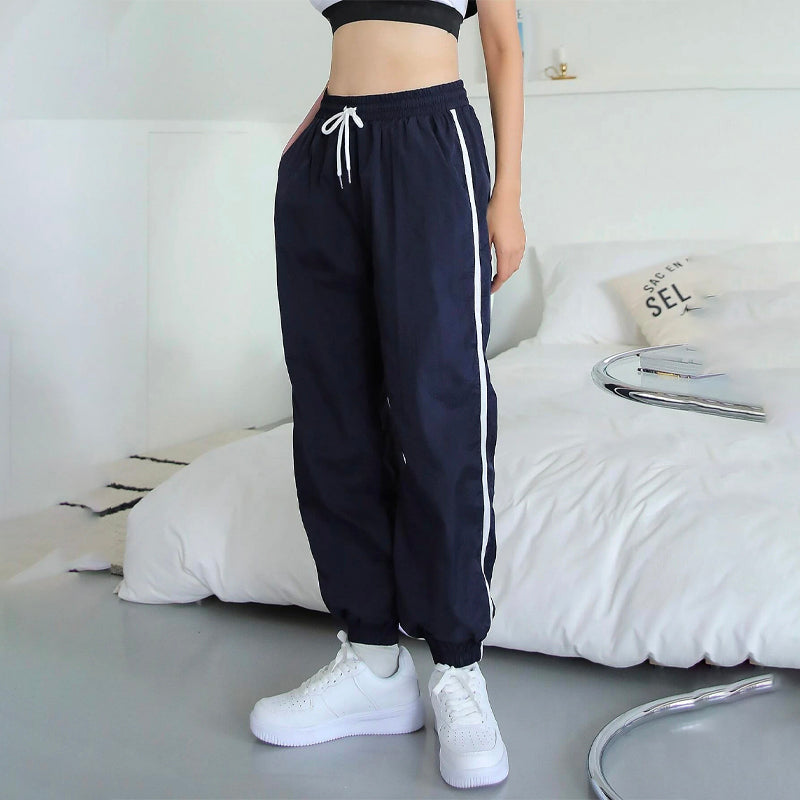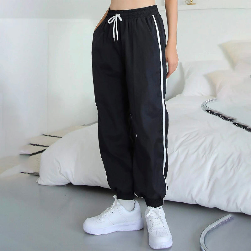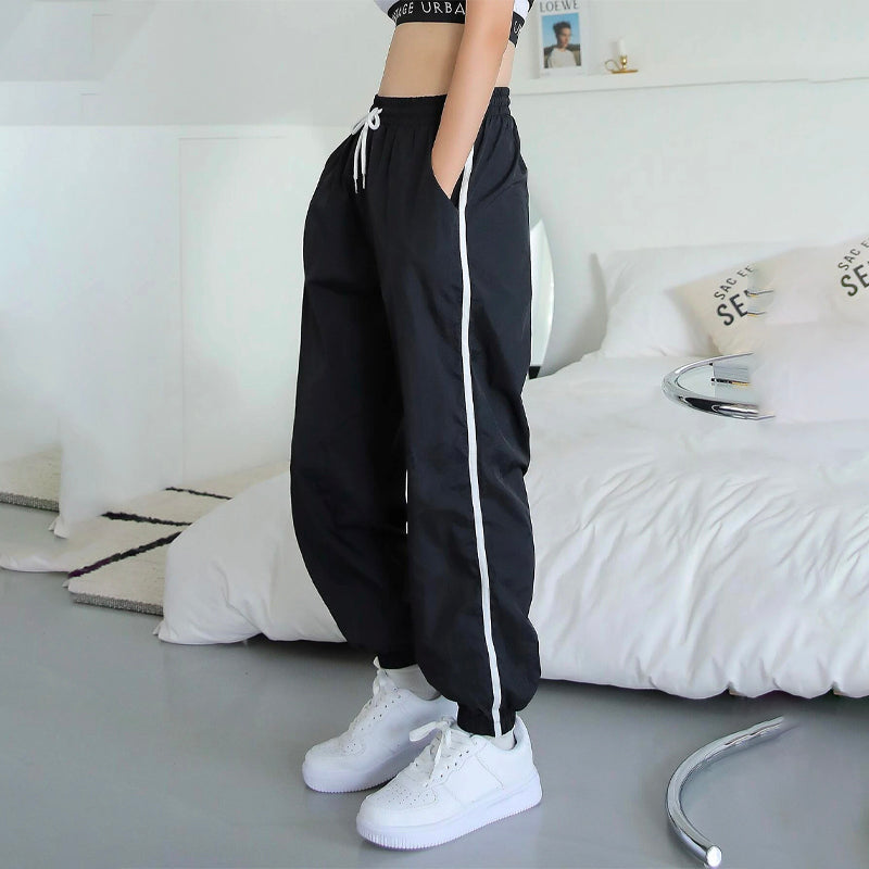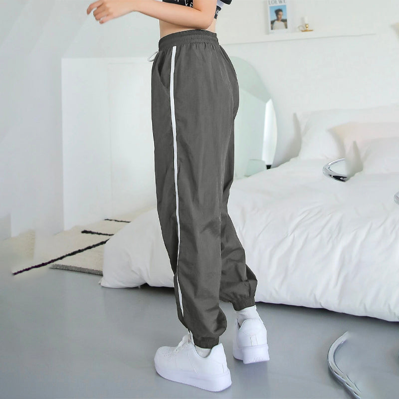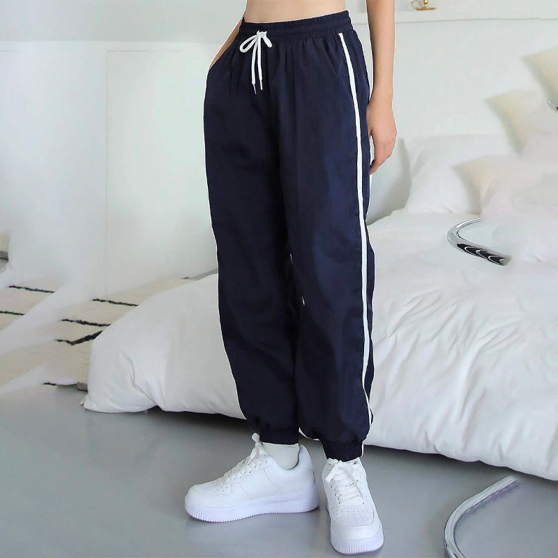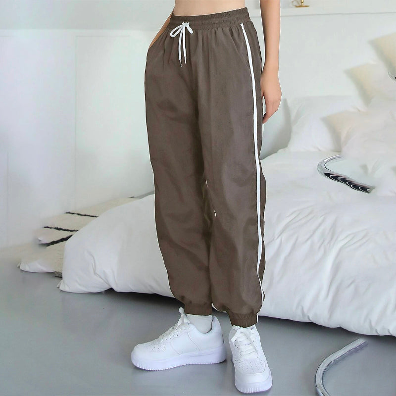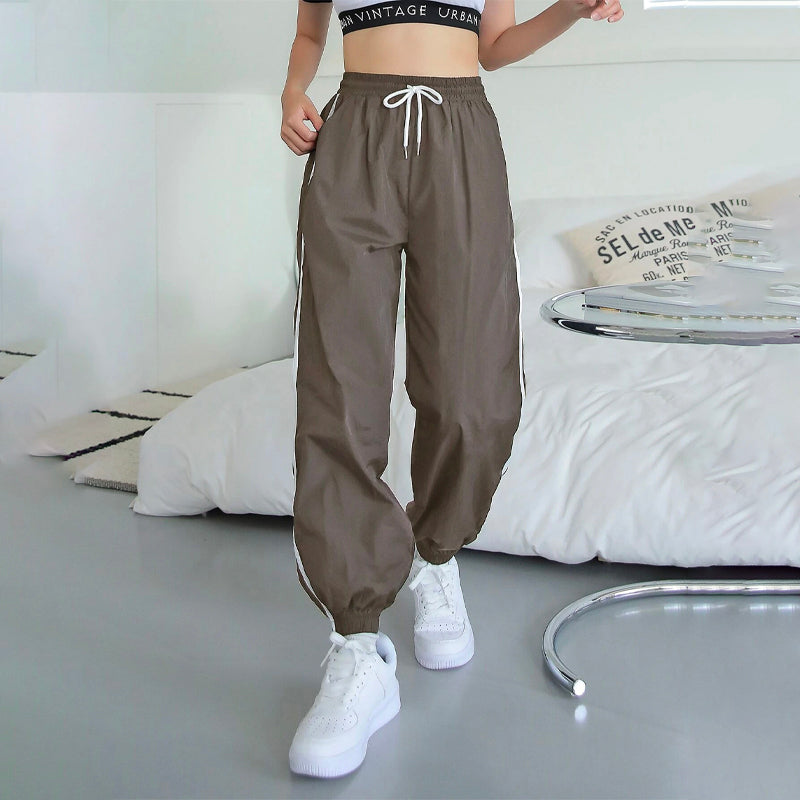Contrast Tape Drawstring Waist Joggers Pants are a perfectly relaxed fit that looks great on day or night. These soft, lightly washed straight-leg pants are made from our durable and 100% nylon fabric and feature an elasticized drawstring waistband with a side strip. They're perfect for those days when you want to wear a casual look.