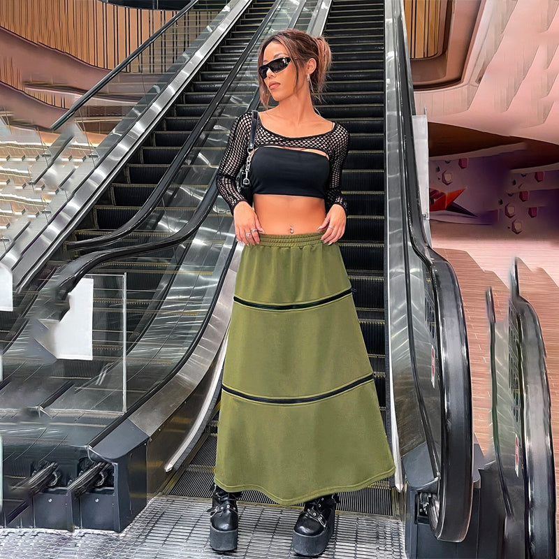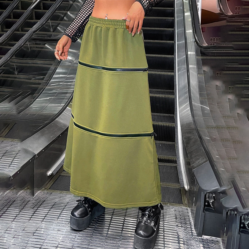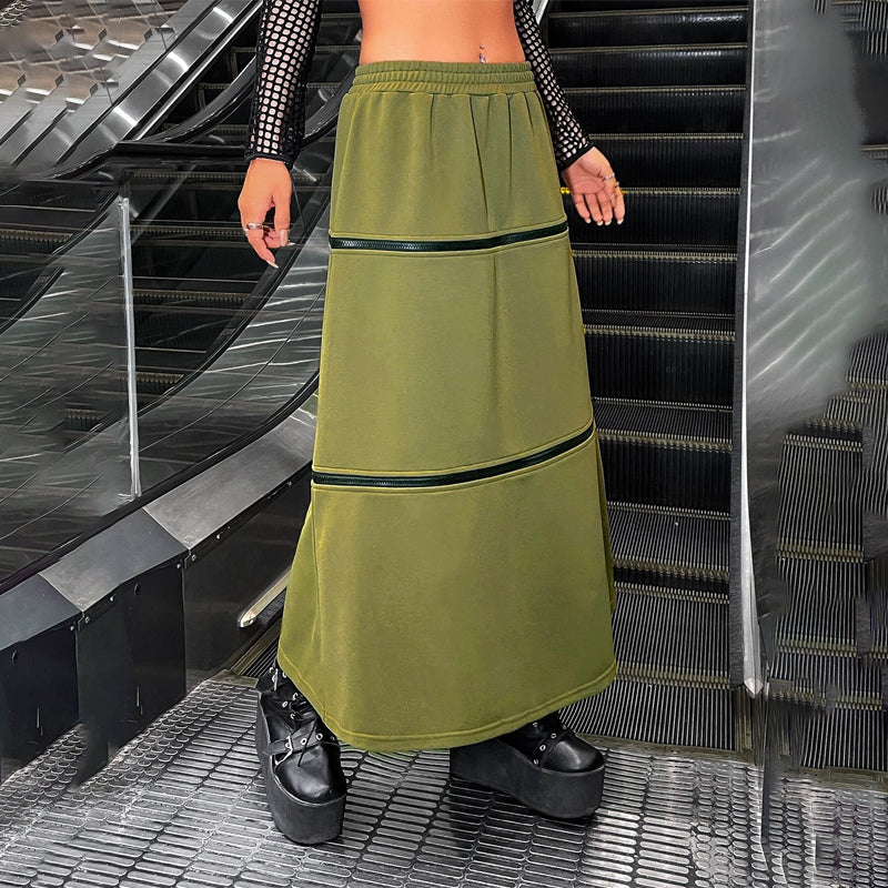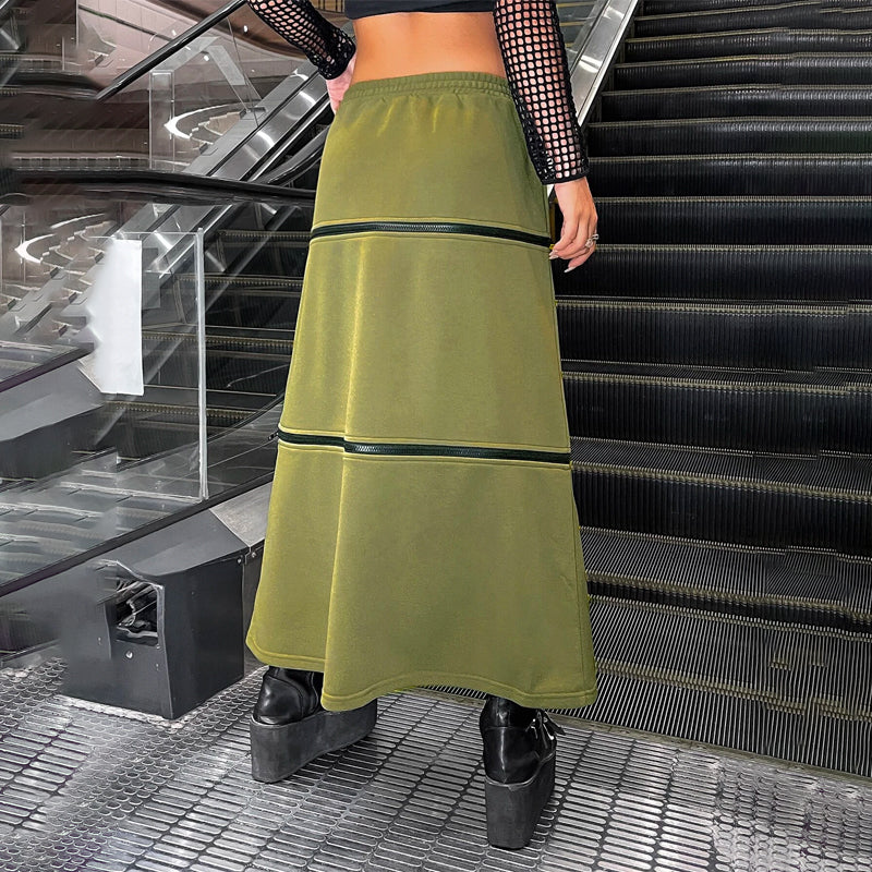 The Contrast Zipper Tape Maxi Skirt is the perfect piece to add a unique touch to your wardrobe. This long and flowy skirt is made of light and airy fabric, making it comfortable and perfect for warm weather. Feature two-tone contrast ribbon zippers, this skirt makes a statement with its bold design. The adjustable waistband allows for a perfect fit, while the maxi length gives you coverage. The skirt can be dressed up or down and is the perfect addition to any wardrobe.