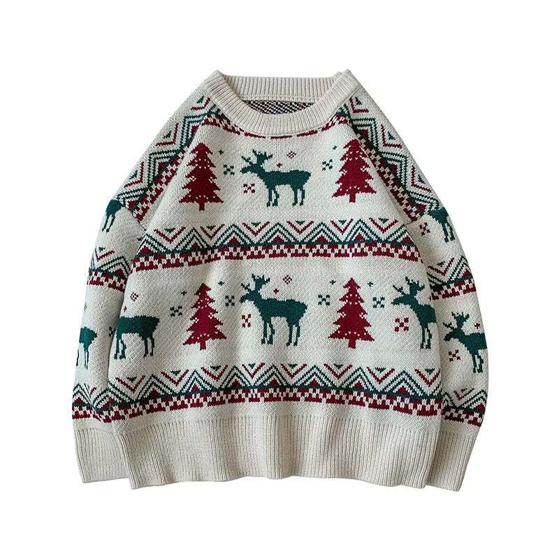 Adorned with adorable moose and Christmas tree prints, this sweater adds a whimsical and spirited touch to your holiday attire.