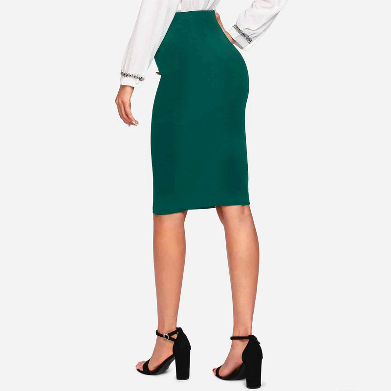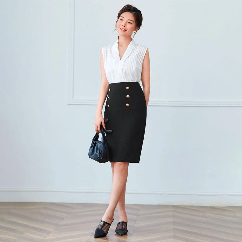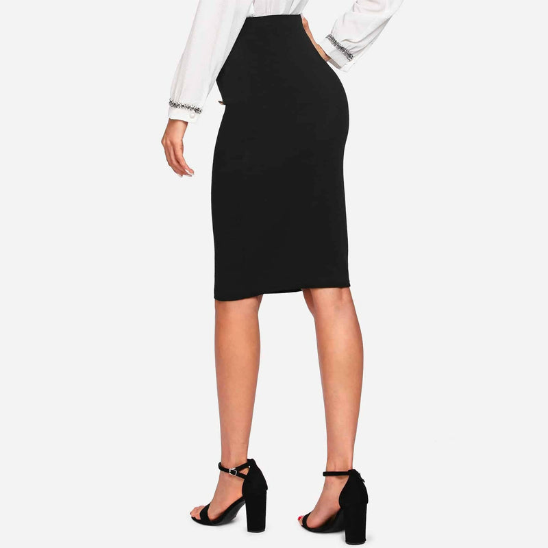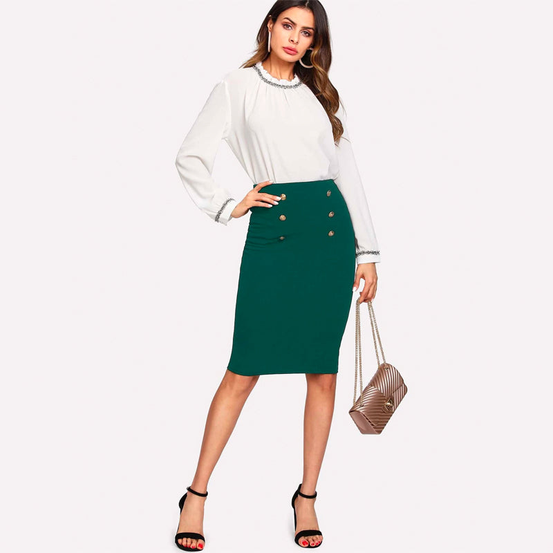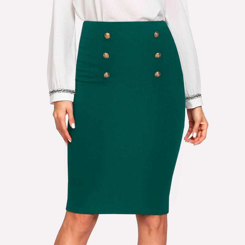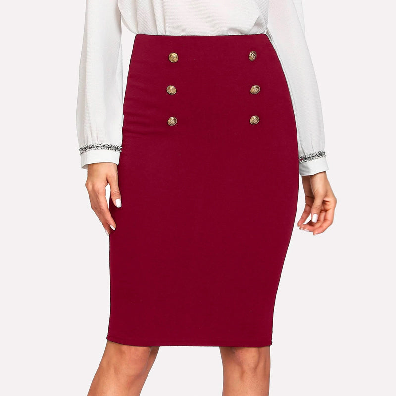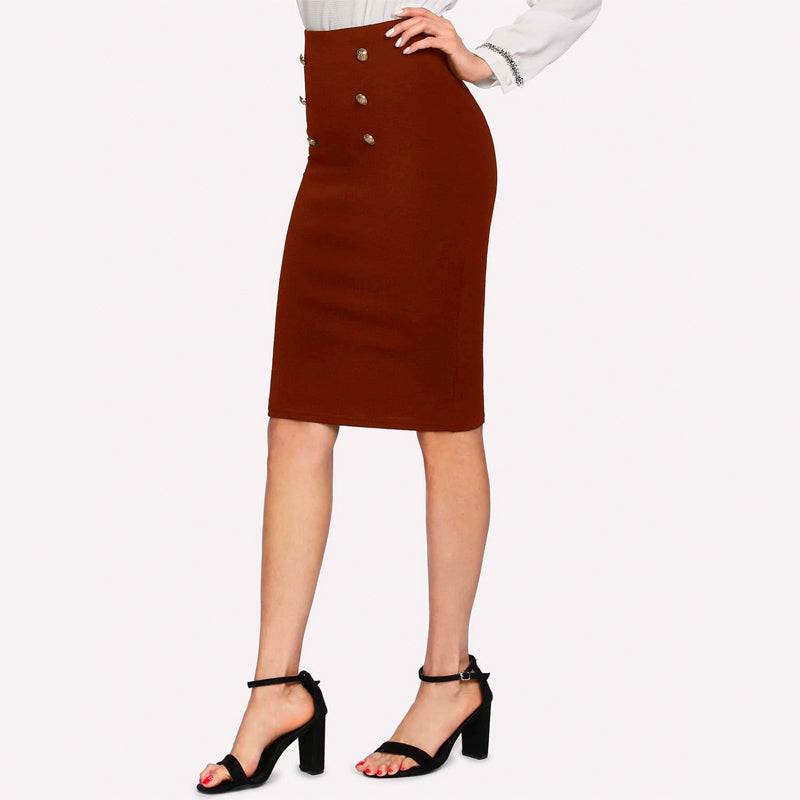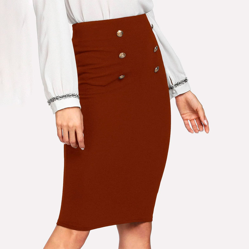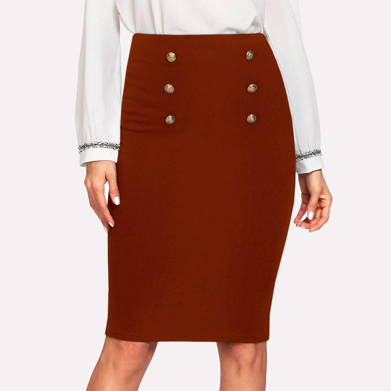 This Double Button Pencil Skirt is the perfect way to make a stylish statement. Cut from a lightweight, breathable fabric, this skirt falls to mid-calf length and features two front buttons for a classic look. The waistband is designed to flatter the figure, while the back features a subtle slit for ease of movement. Wear this skirt with a simple blouse and pointed-toe heels for an effortlessly chic look.