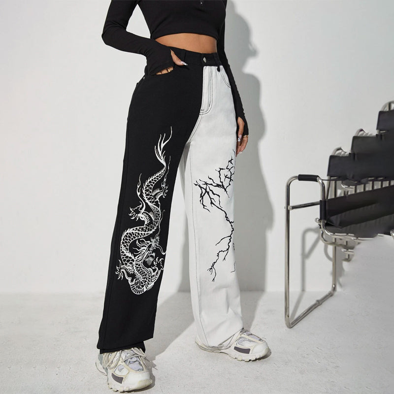 Dragon & Lightning Print Wide Leg Jeans have an animal pattern which makes it very unique. These jeans are made of pure cotton and non-stretch fabric making them very light and comfortable to wear. You can easily wash it in the machine without worrying about the color getting faded.