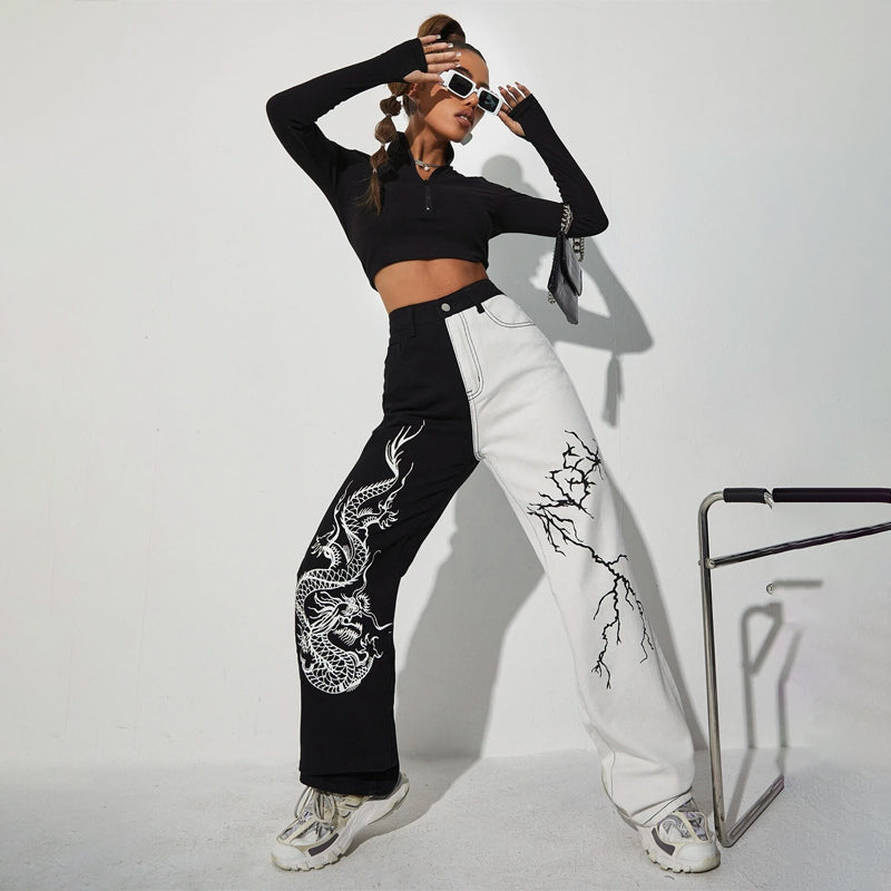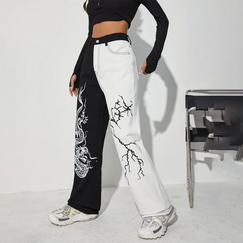 Dragon & Lightning Print Wide Leg Jeans