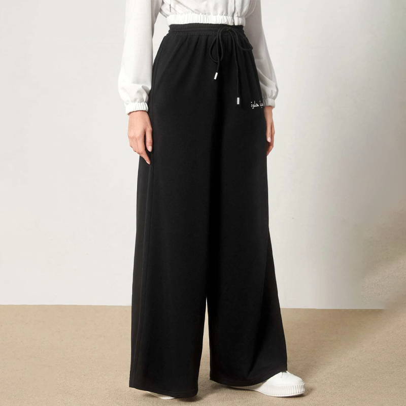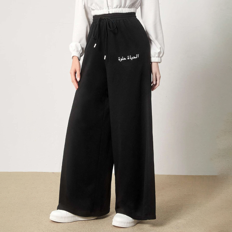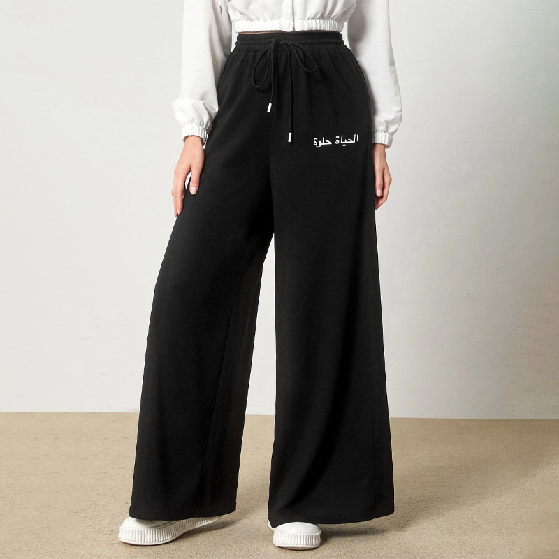 Drawstring Waist Slogan Graphic Wide Leg Pants will keep you stylish and comfortable. The fabric is soft and comfortable, which makes it an ideal choice for casual wear. The drawstring waistband adds a touch of feminine flair and the wide leg creates a stylish detail at the side panels of the pants.