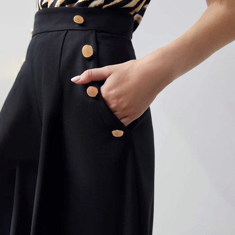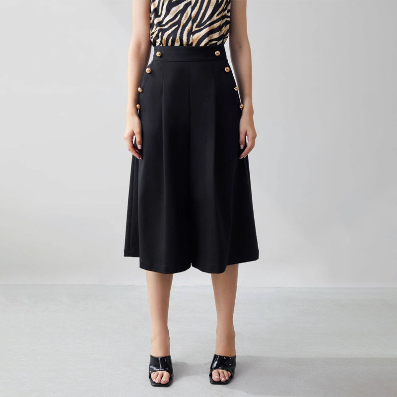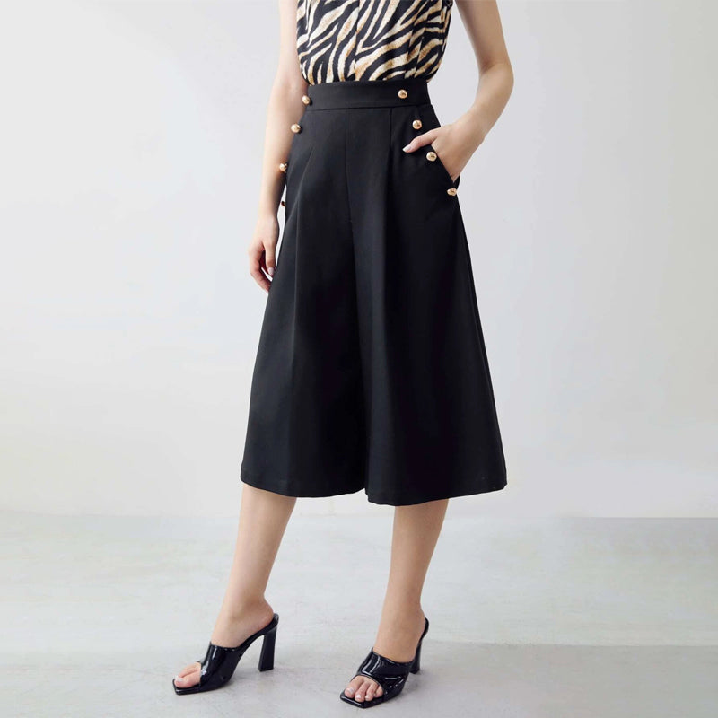 Get the look of a comfortable but fitted midi length wide leg Easy Wear Flowy Capris Pants in an easy care fabric. This low-slung top has a relaxed fit and a lightweight, comfortable feel. Pair these pants with a turtleneck or your favorite tops for a contemporary look. These pants come in elegant style and button details.