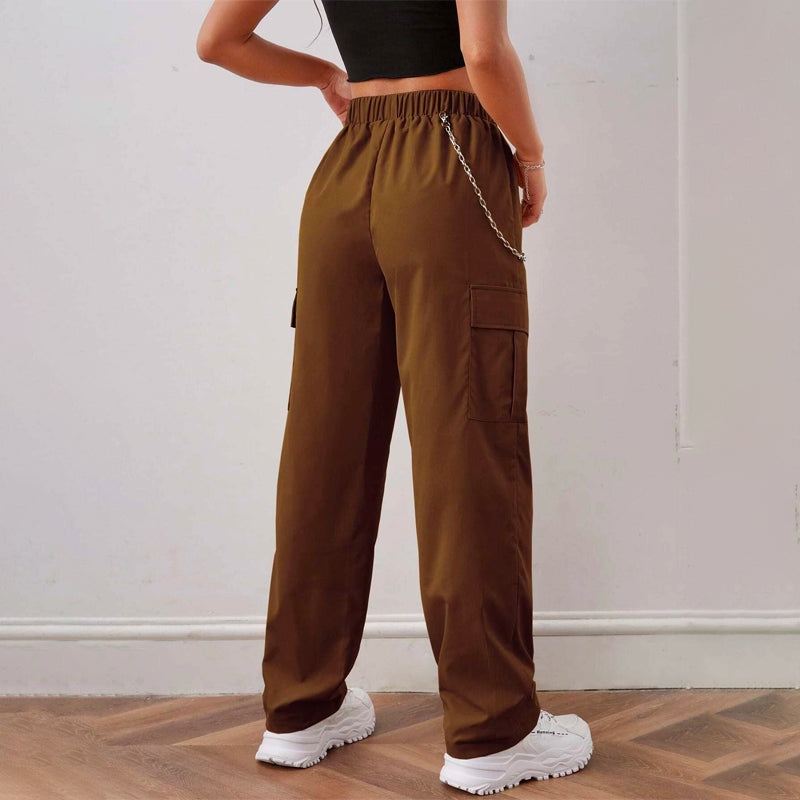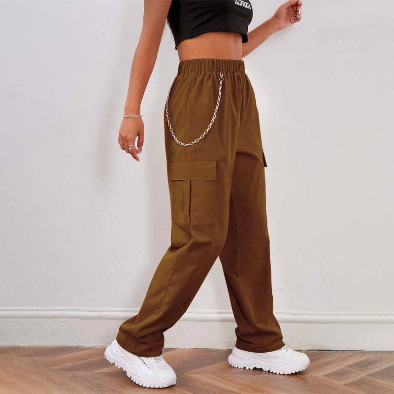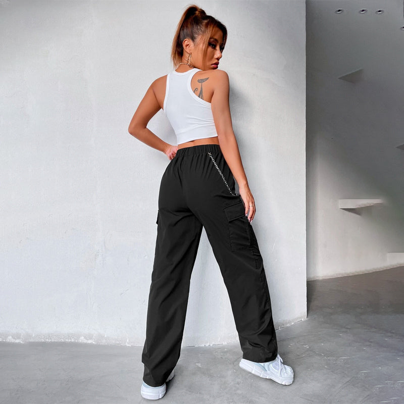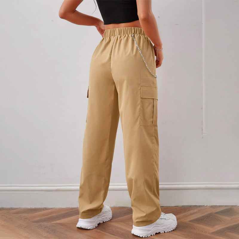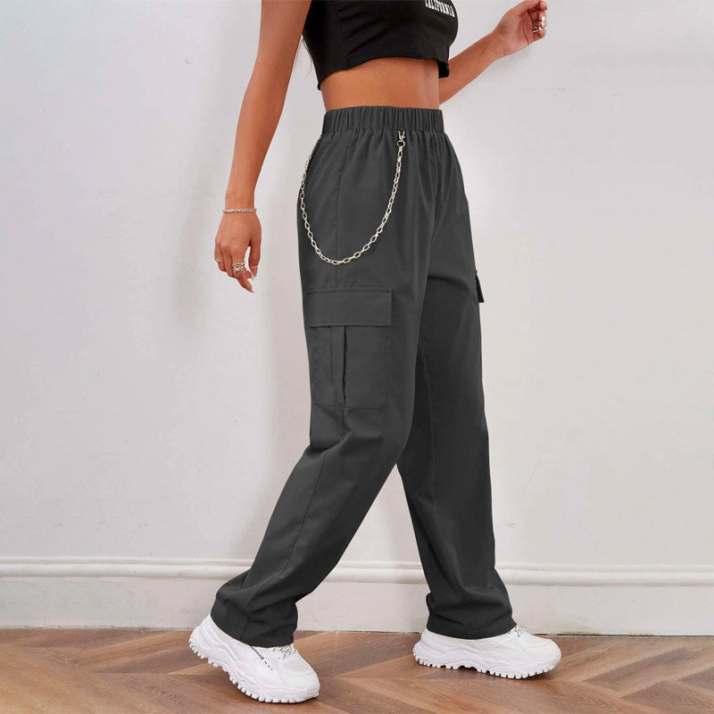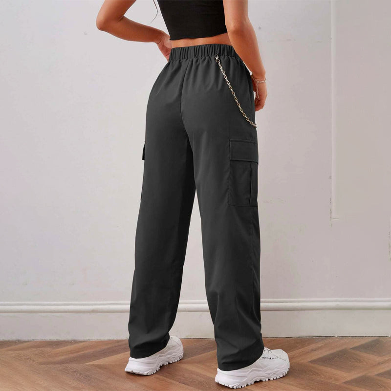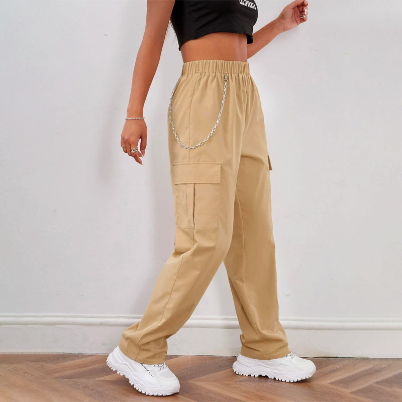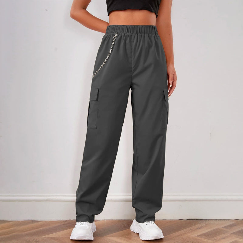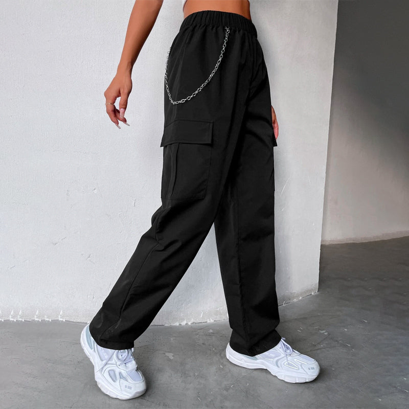 Elastic Waist Cargo Pants With Chain