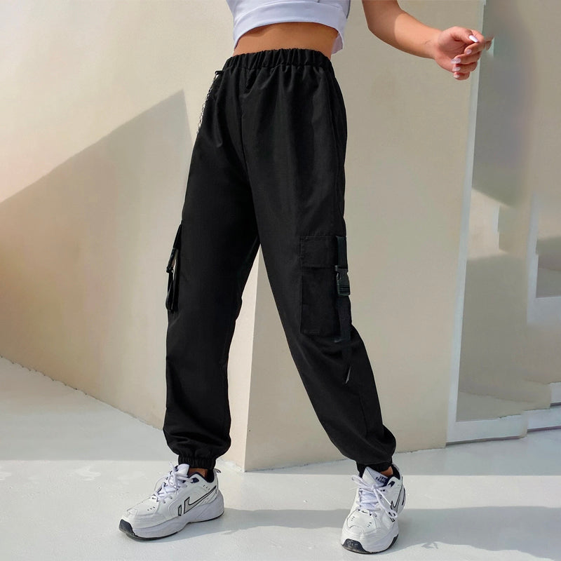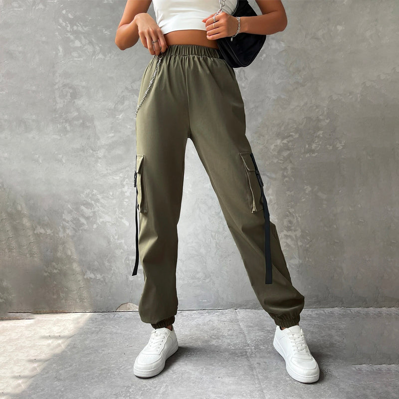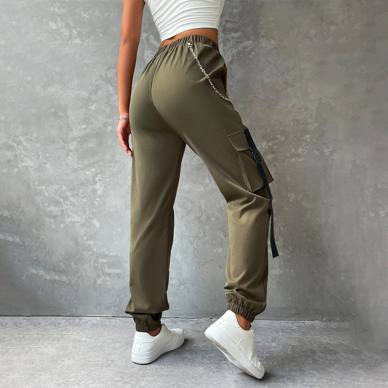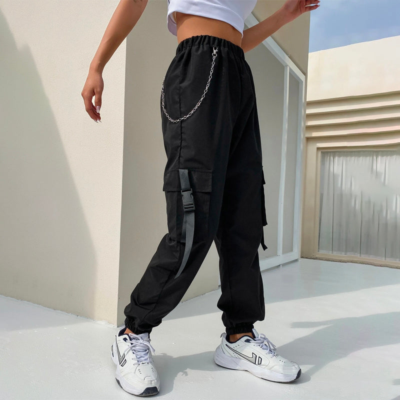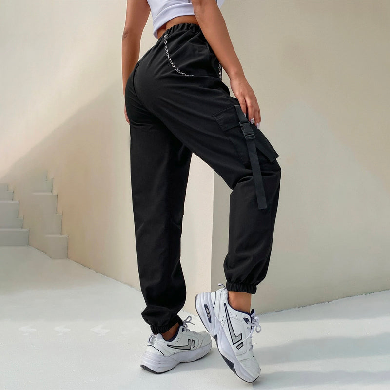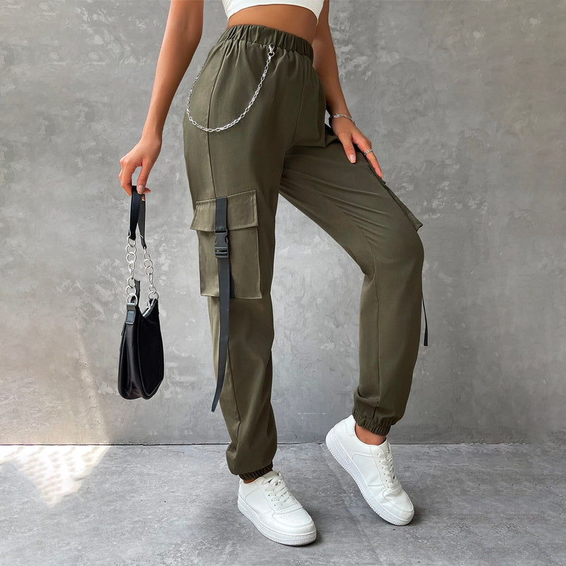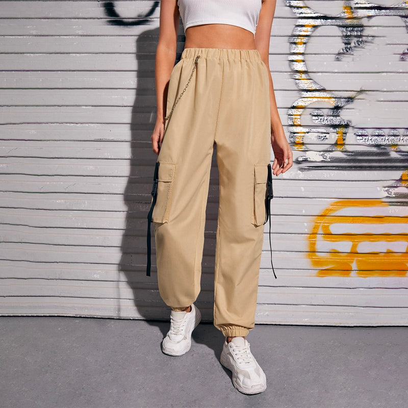 Flap Pocket Buckle Tape Cargo Pants With Chains are designed to make you feel stylish and comfortable. These pants are unlined and feature a relaxed fit, you can expect these to be easy to wear. The cargo pants' inner waistband has a stylish chain detail. These pants are perfect for everyday casual wear.