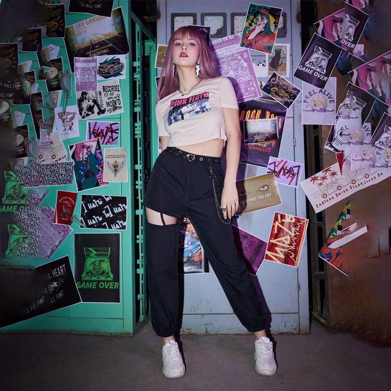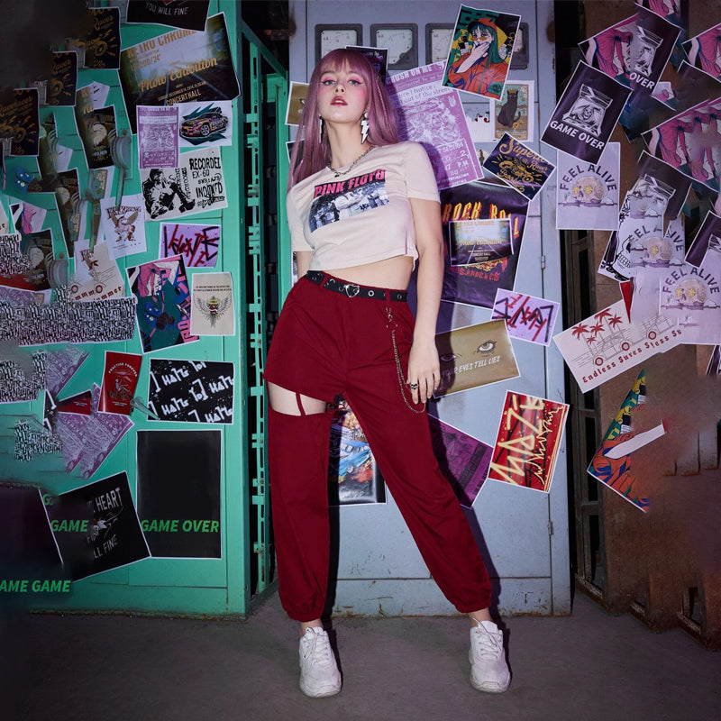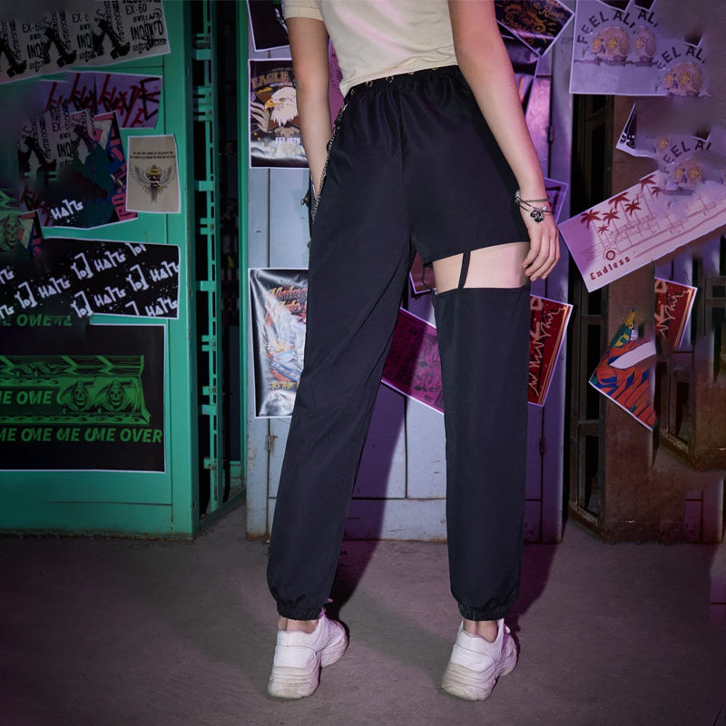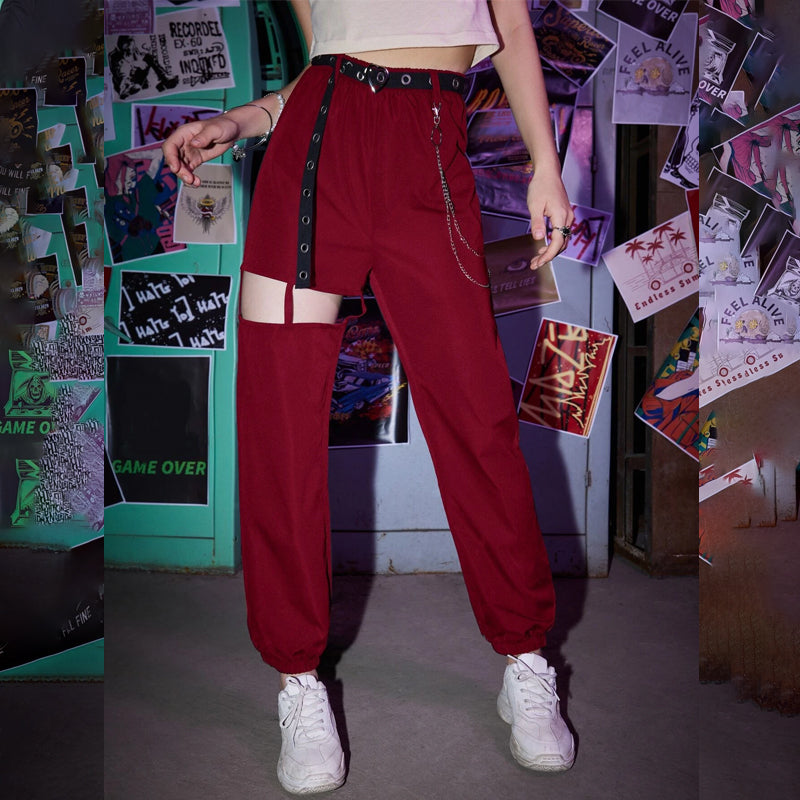 Grunge Punk Solid Belted Chain Cut-out Pants