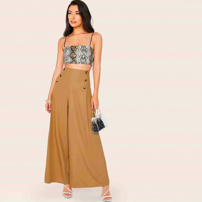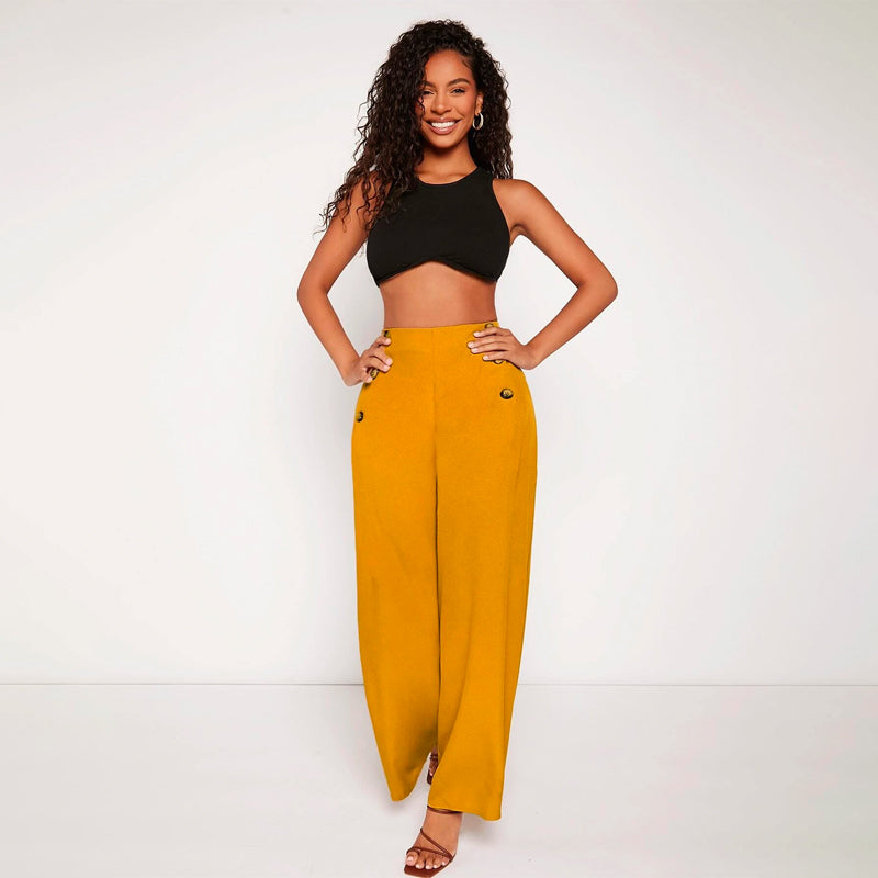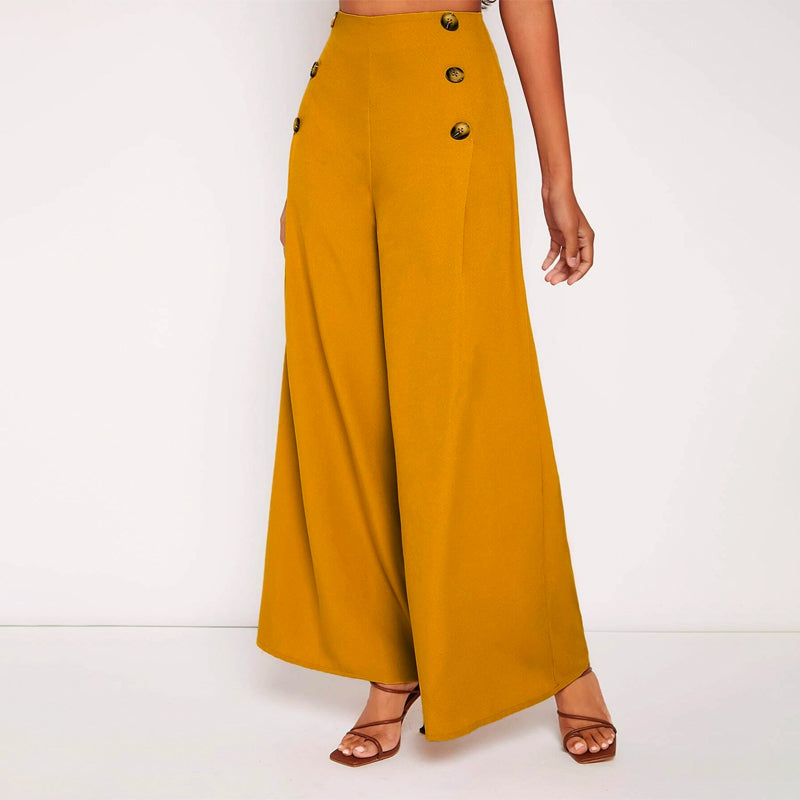 High Waist Buttoned Front Wide Leg Pants are comfortable and fashionable women's wide-leg pants that have a high waist, an elastic waistband, and front pockets. It is made from non-stretch fabric and features a plain pattern with elastic closing at the ankle. The loose fit and non-stretch fabric make them super comfortable.