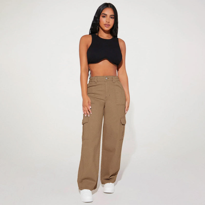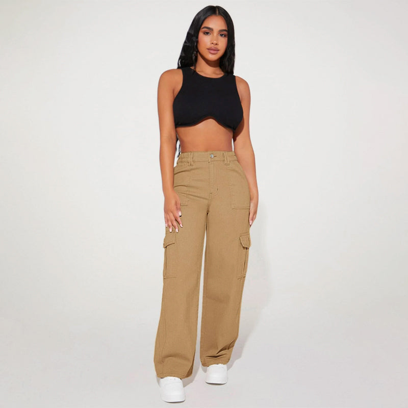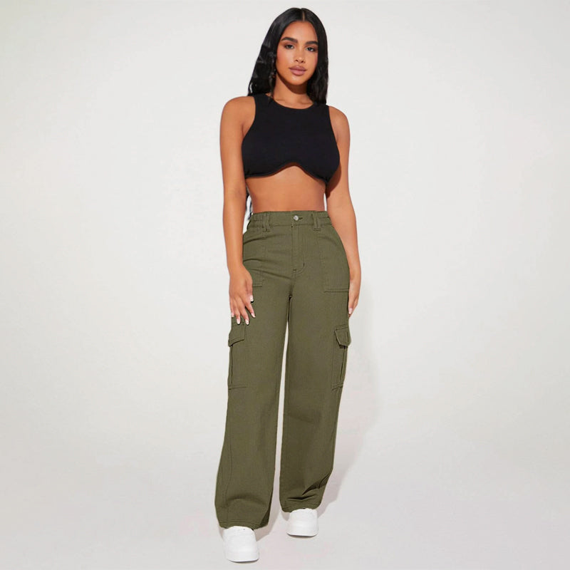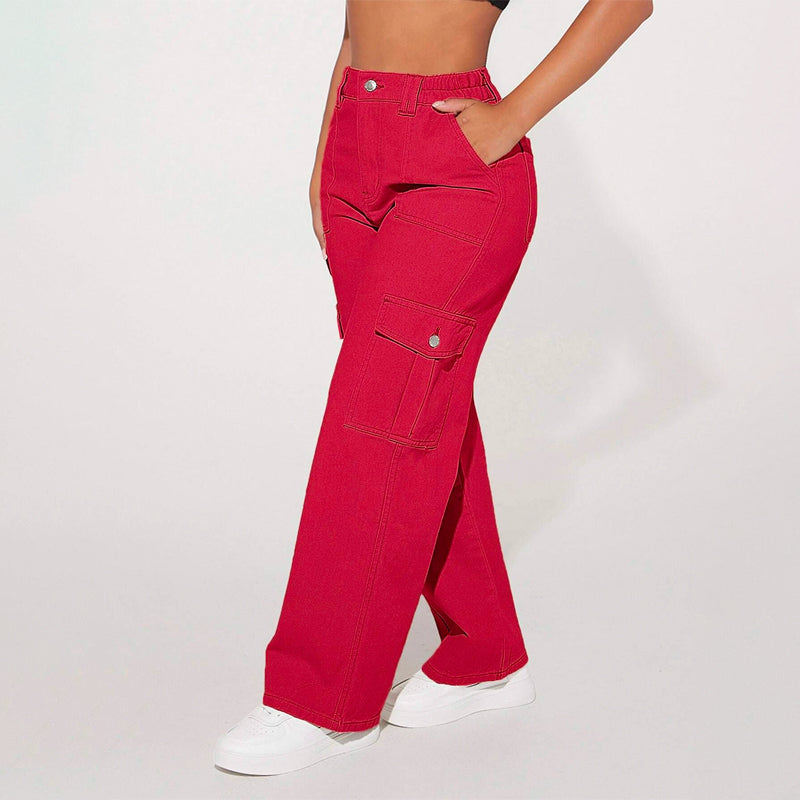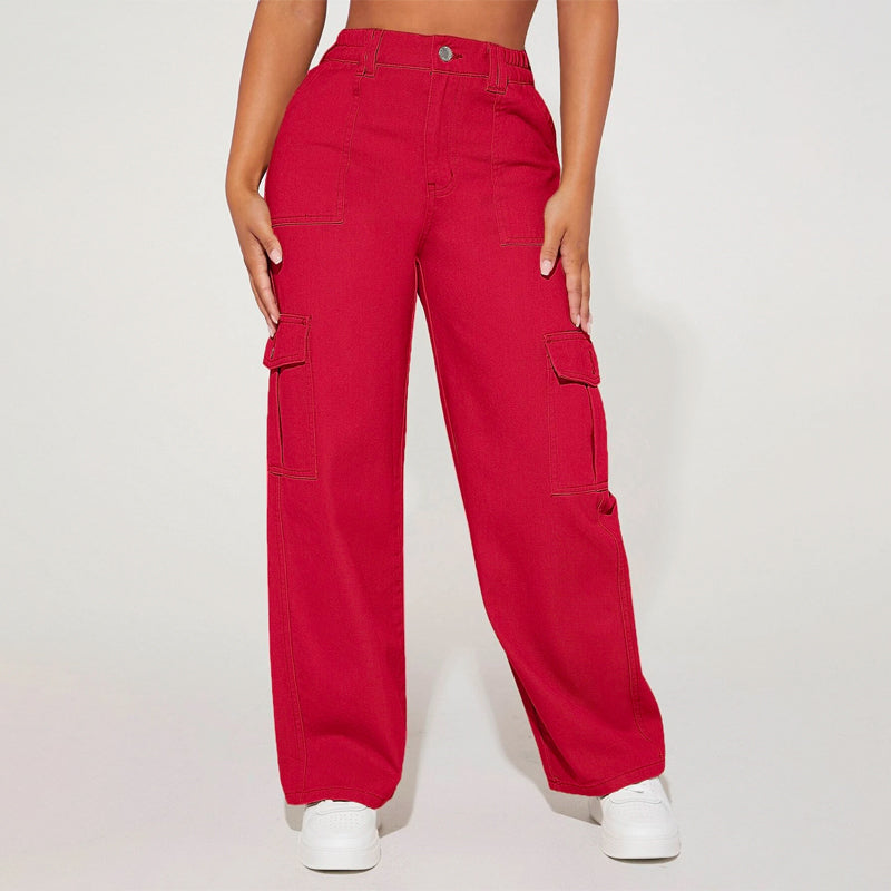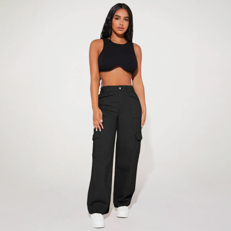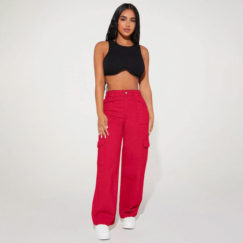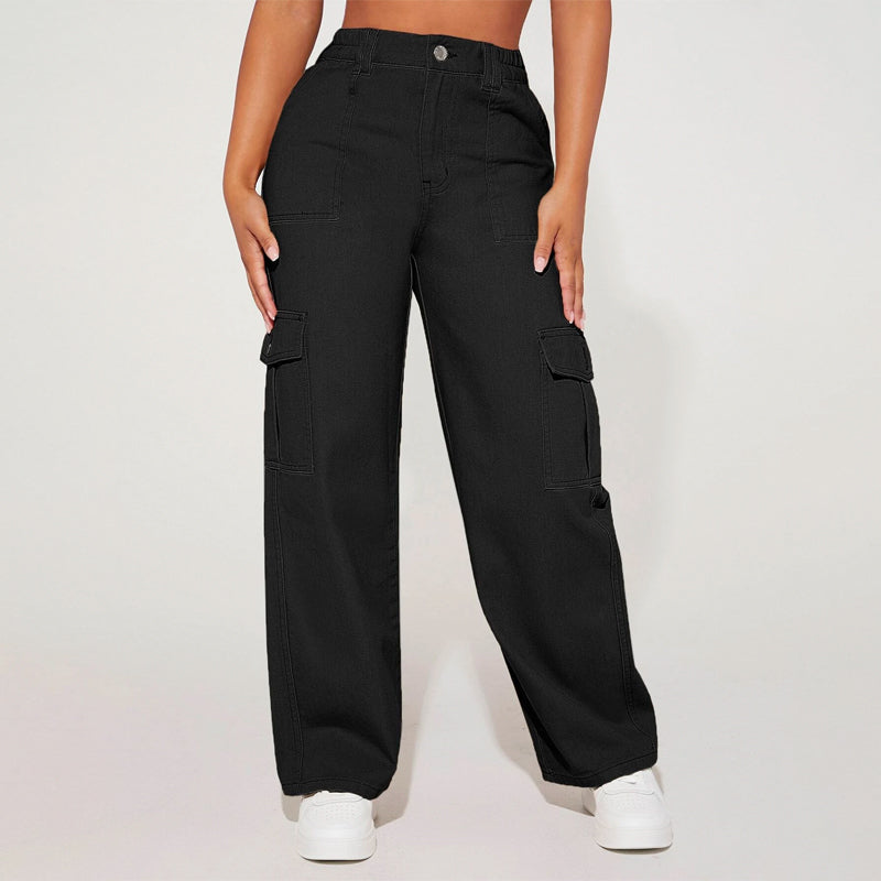 High Waist Flap Pocket Cargo Jeans have a non-stretch fabric and offer a loose fit type. These pocket cargo pants are made of pure cotton and can be easily washed in the machine. It also features buttons, pockets, and zippers making it very convenient to wear anywhere you go.