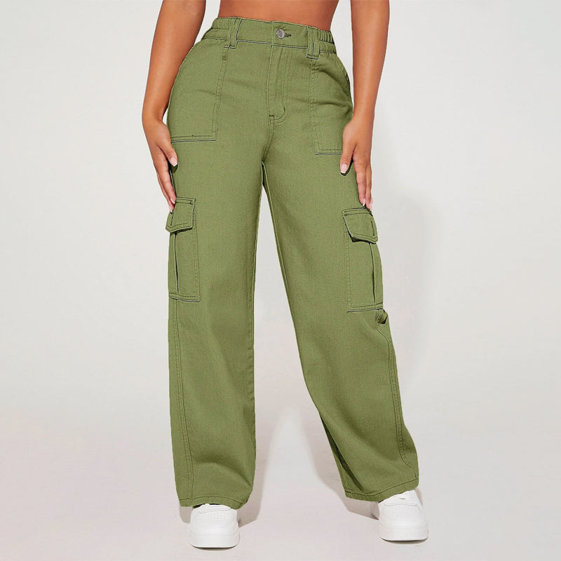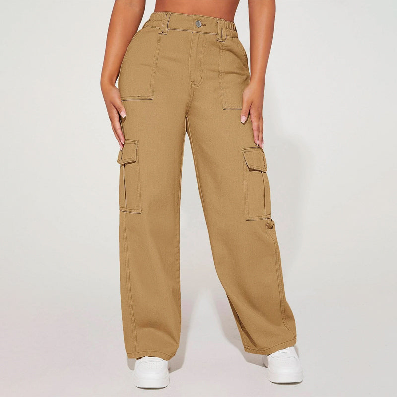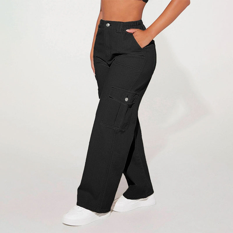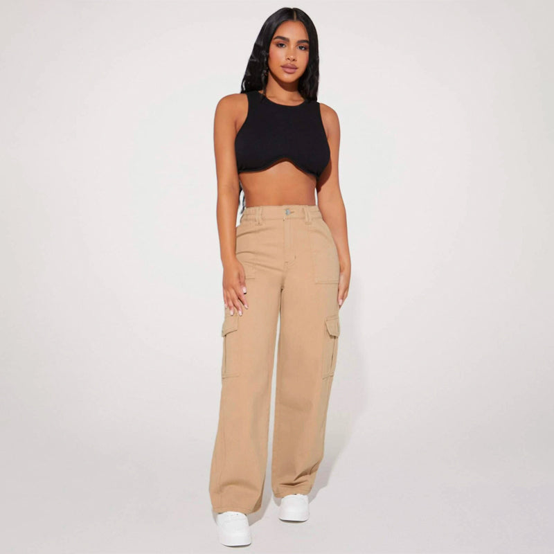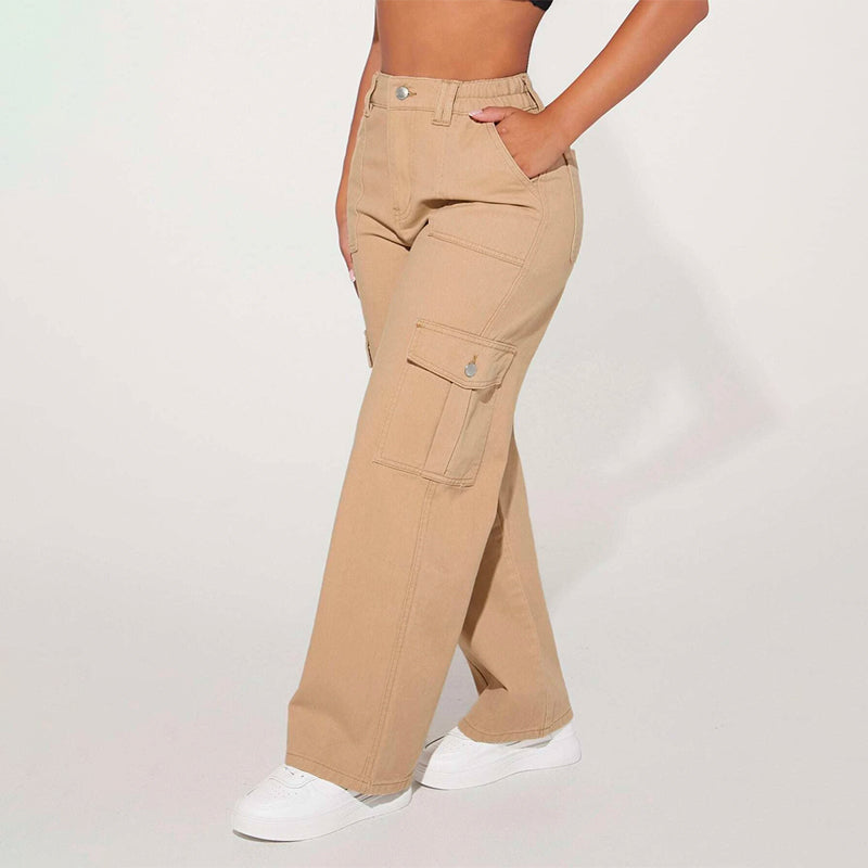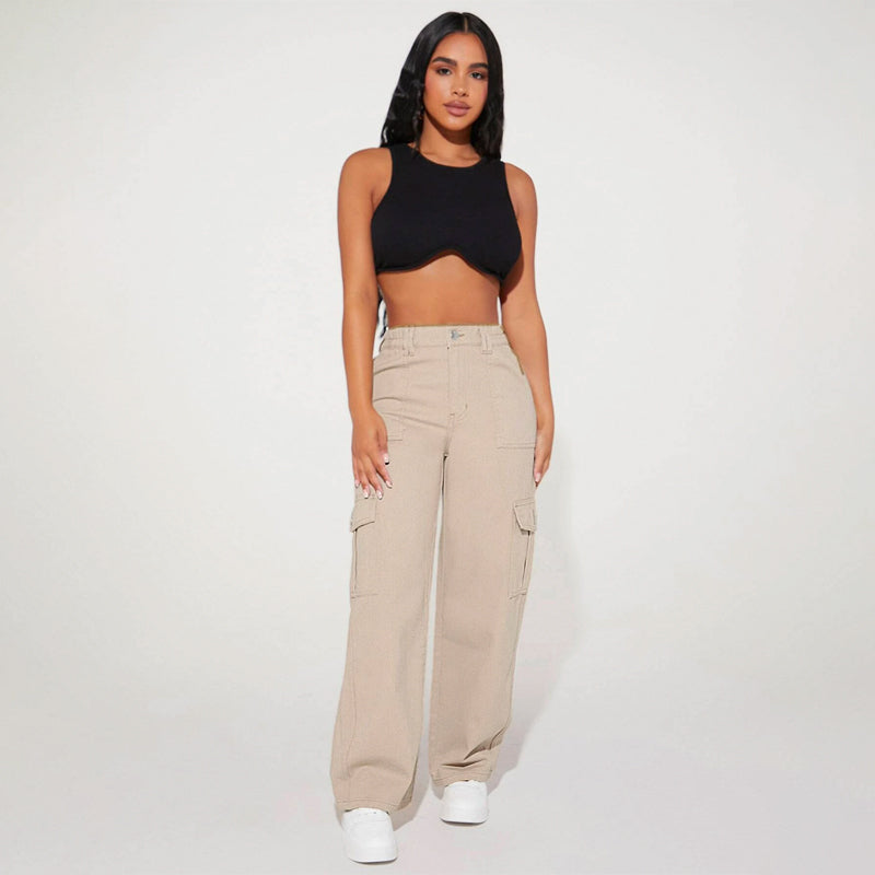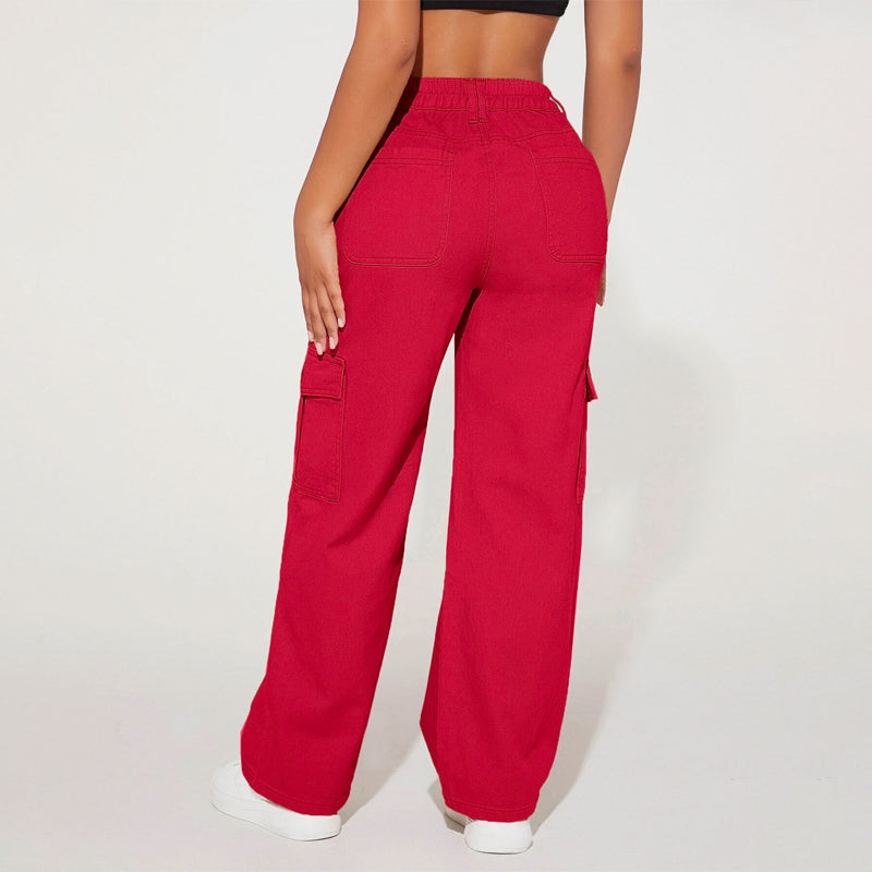 High Waist Flap Pocket Cargo Jeans have a non-stretch fabric and offer a loose fit type. These pocket cargo pants are made of pure cotton and can be easily washed in the machine. It also features buttons, pockets, and zippers making it very convenient to wear anywhere you go.
