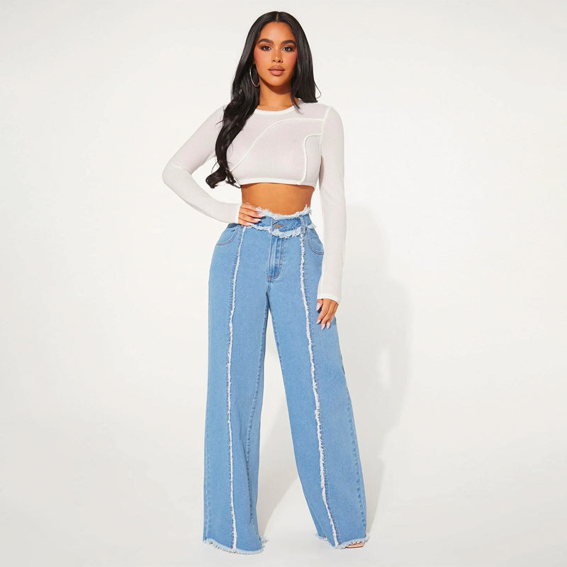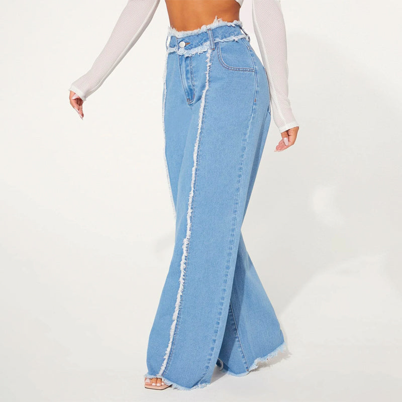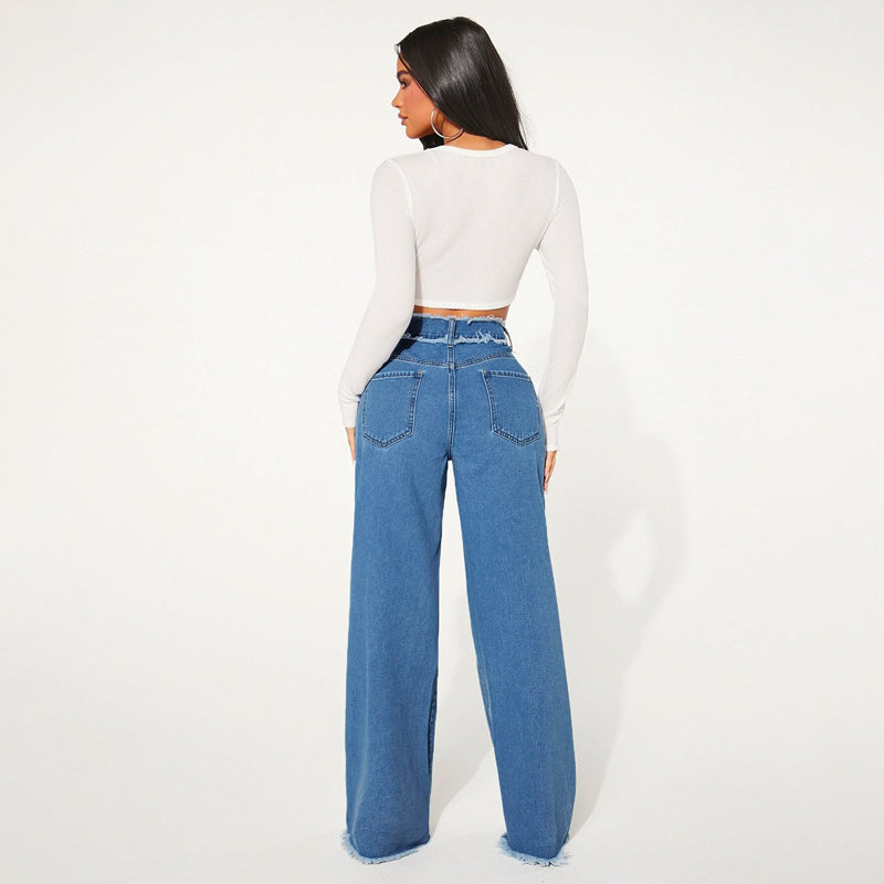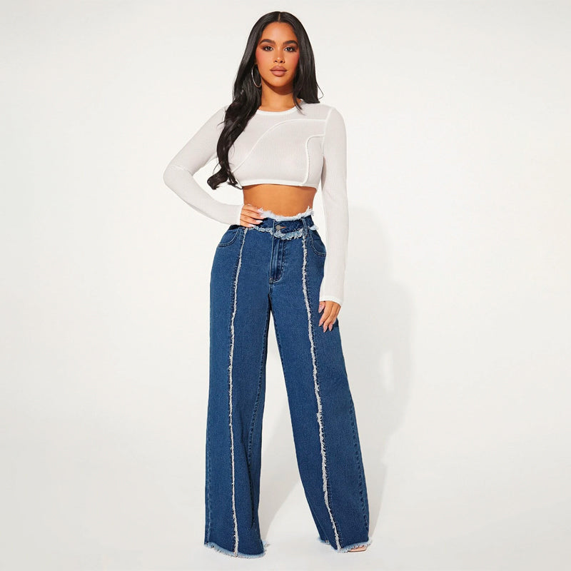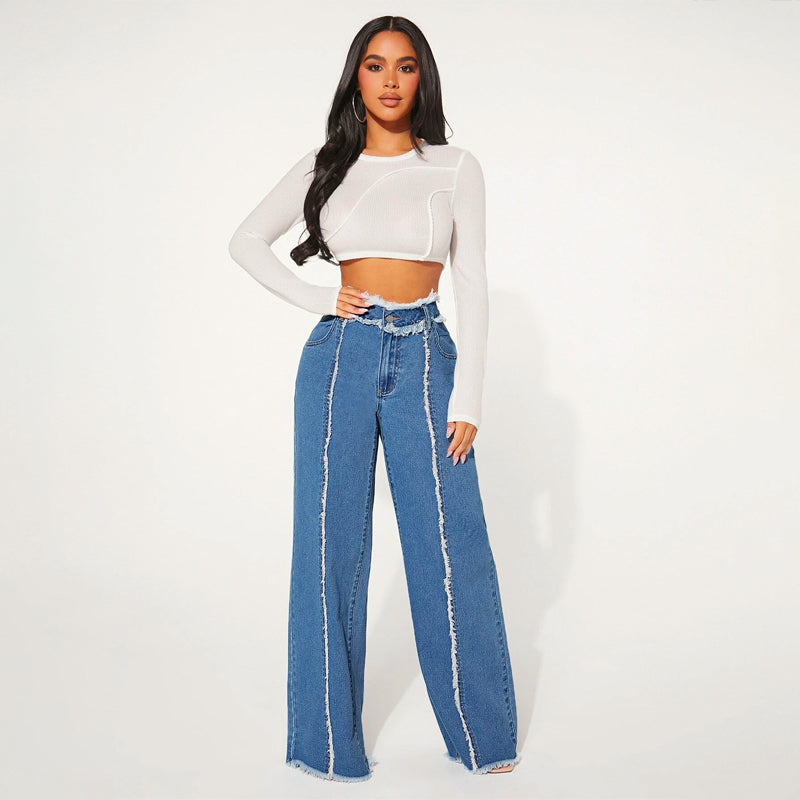 High Waist Frayed Trim Wide Leg Jeans