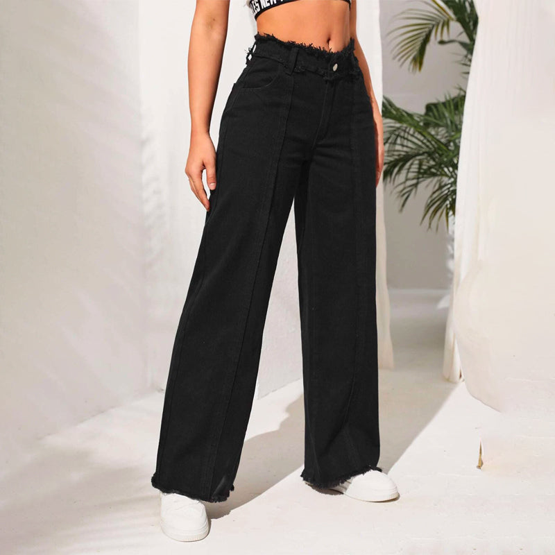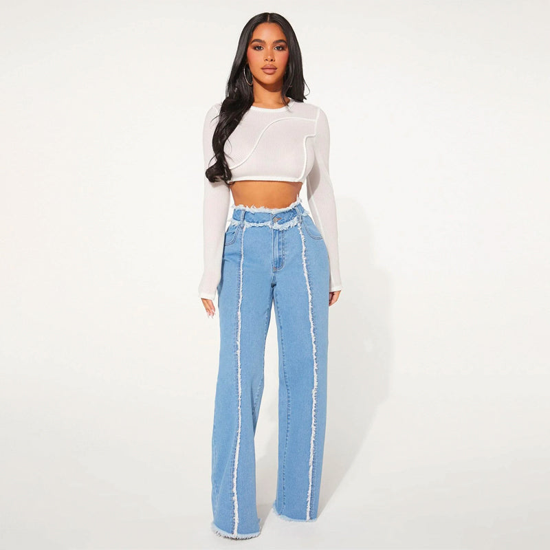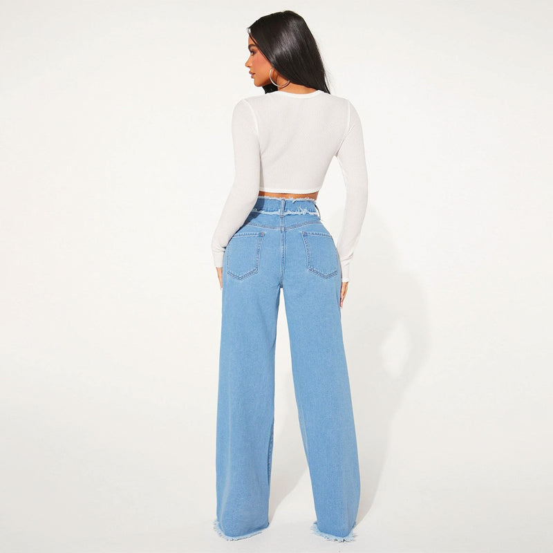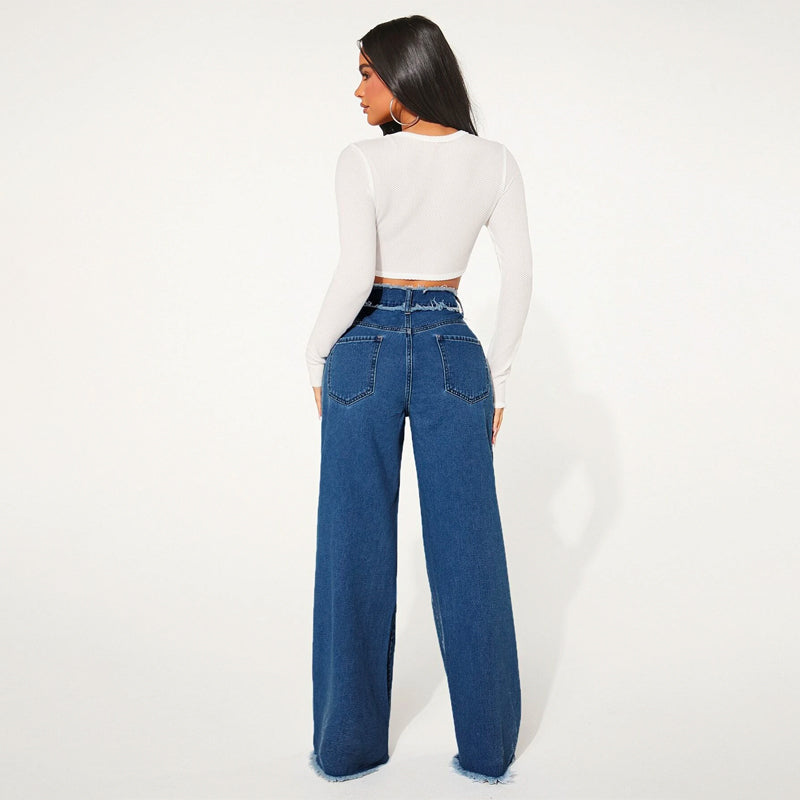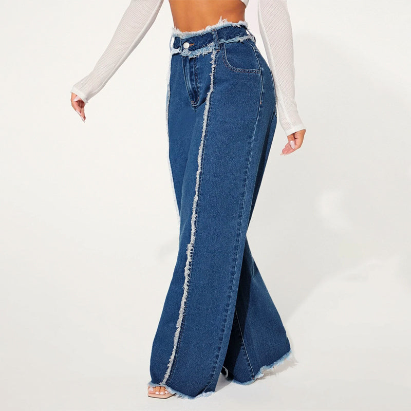 High Waist Frayed Trim Wide Leg Jeans