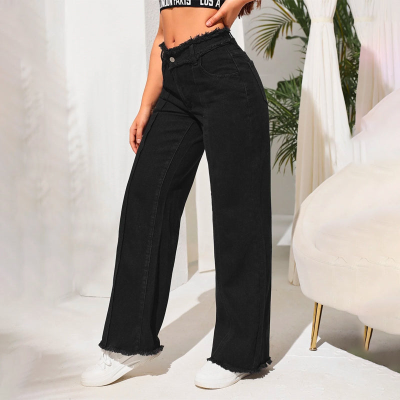 High Waist Frayed Trim Wide Leg Jeans have a plain pattern and a high waistline. The composition of cotton, polyester, and viscose gives them a fine texture. The long length and denim material make it very classy. You can maintain its quality by just washing it in the machine.