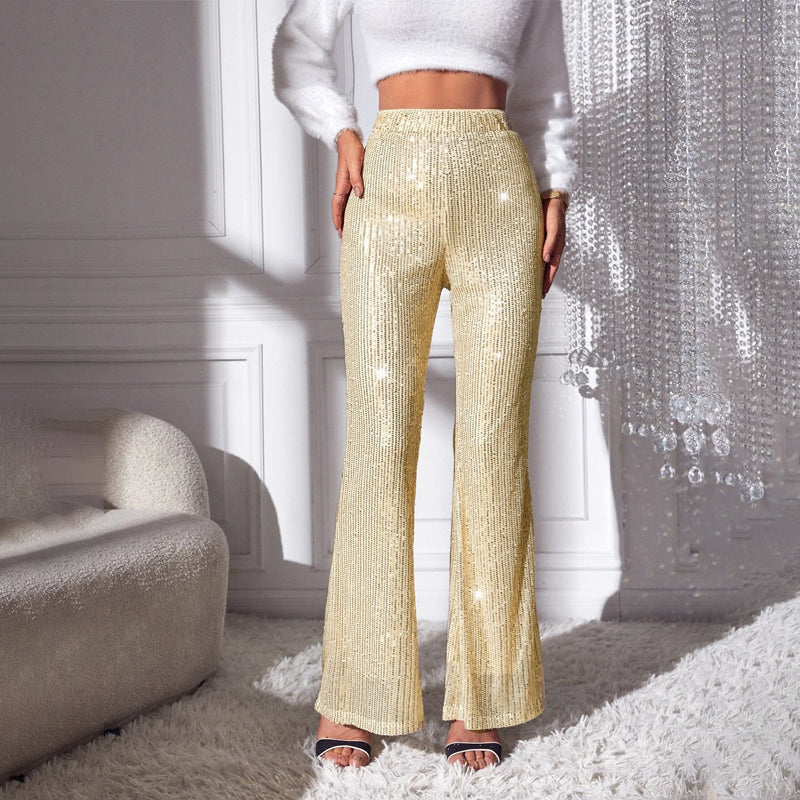 Looking for a pair of party pants but you're not quite sure what to wear? These High Waist Sequin Flare Leg Pants are perfect for all occasions. They feature a high waist and elastic waistband, making them easy to wear and very comfortable. The fabric offers minimal stretch so they look great on any body type.