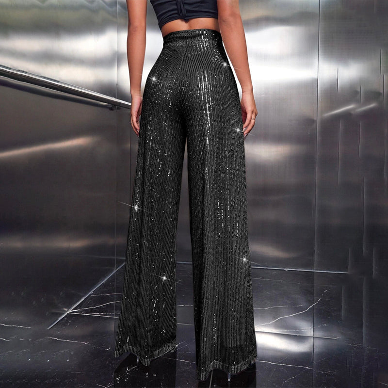 High Waist Sequin Wide Leg Pants feature a high-waist silhouette, with elastic around the side waistline for a fit that wraps you in comfort. Stay cool and comfortable next to a campfire, or even around the house with these versatile pants that can fit any occasion.  The plain wide-leg pants are medium stretch and are made of polyester.