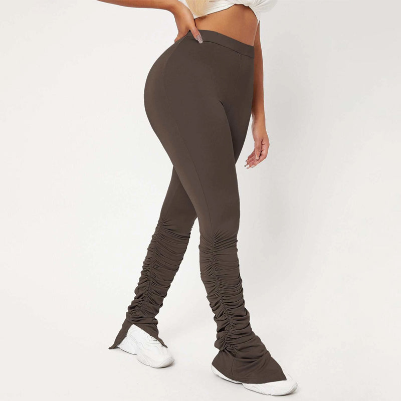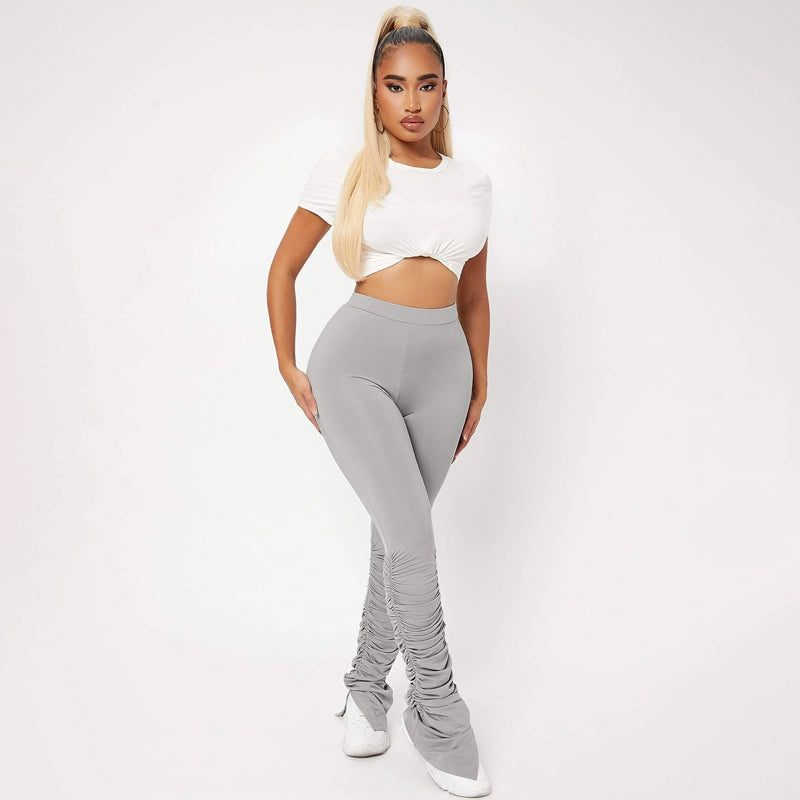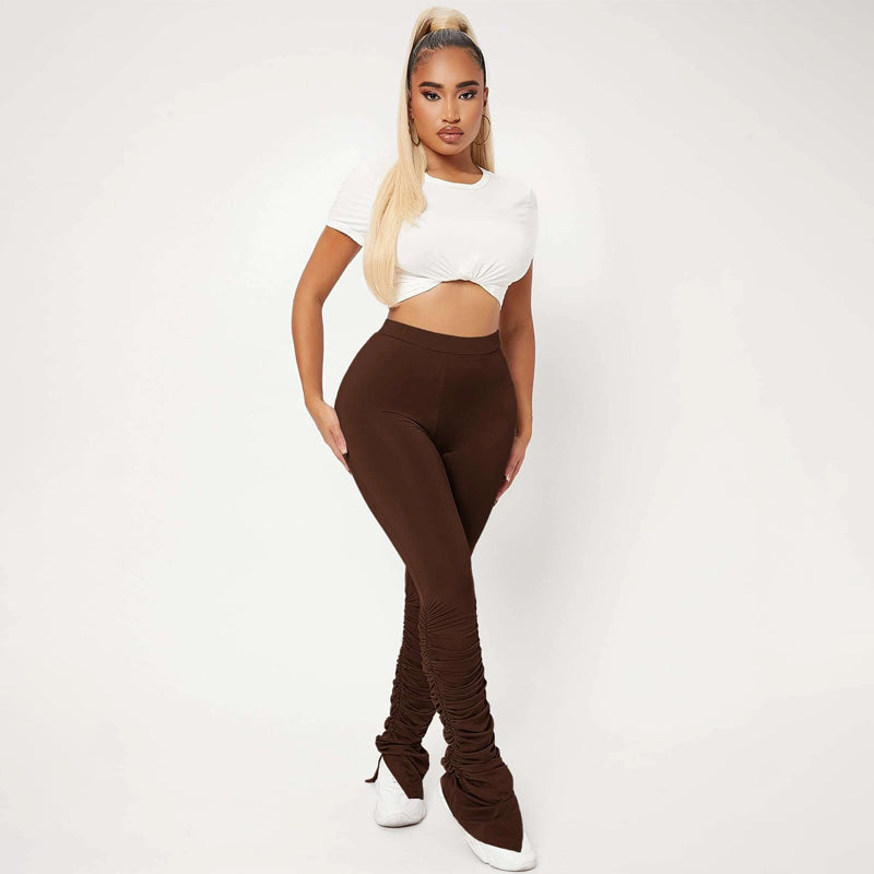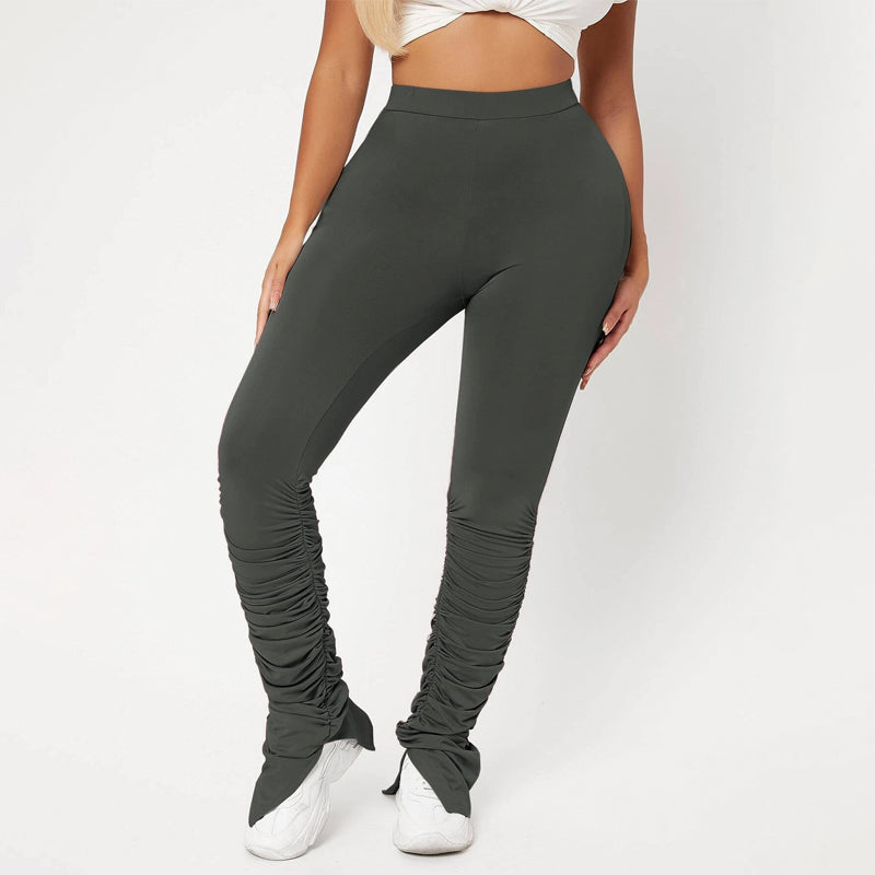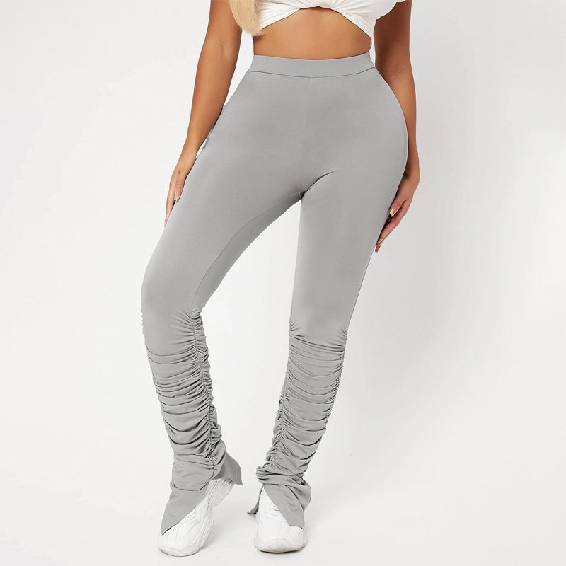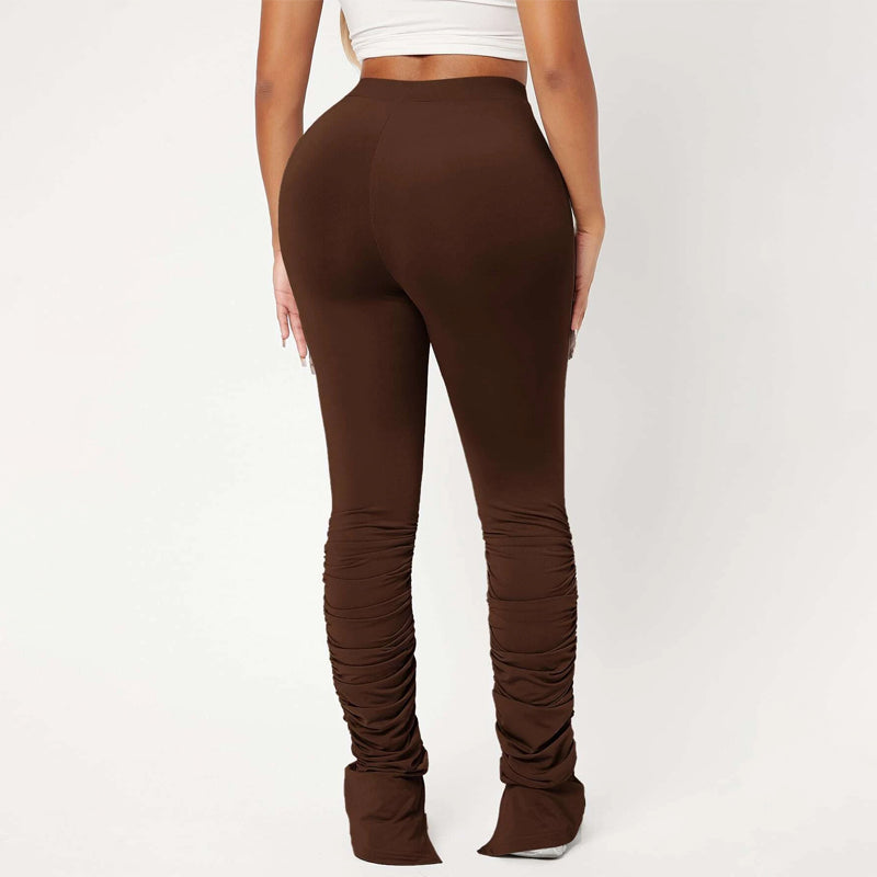 High Waist Skinny Stacked Pants are made from a lightweight, stretch fabric that feels comfortable and thermal. The high-waist pants give you a great style as they're versatile enough to be worn with shoes or boots. They also have an elastic waistband that provides an adjustable fit and ruched details which adds flare to these pants.