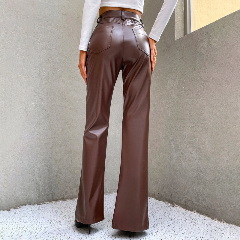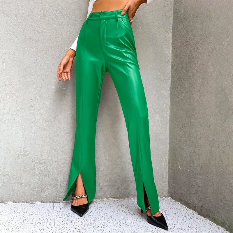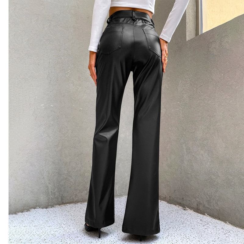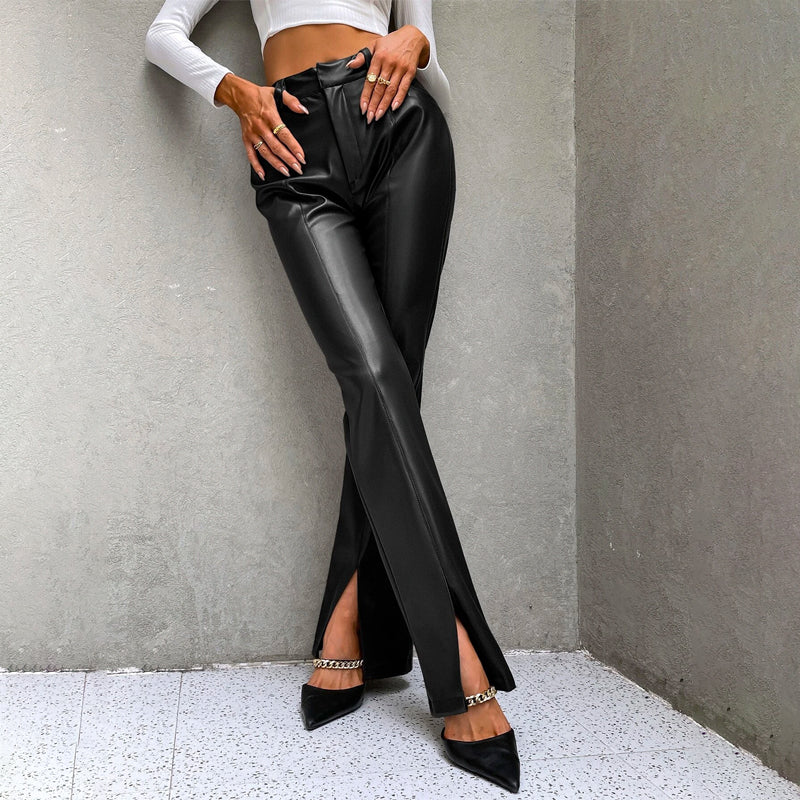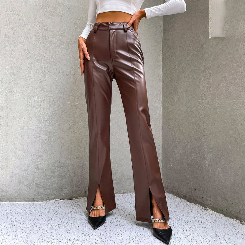High Waist Slit Hem PU Leather Flare Leg Pants