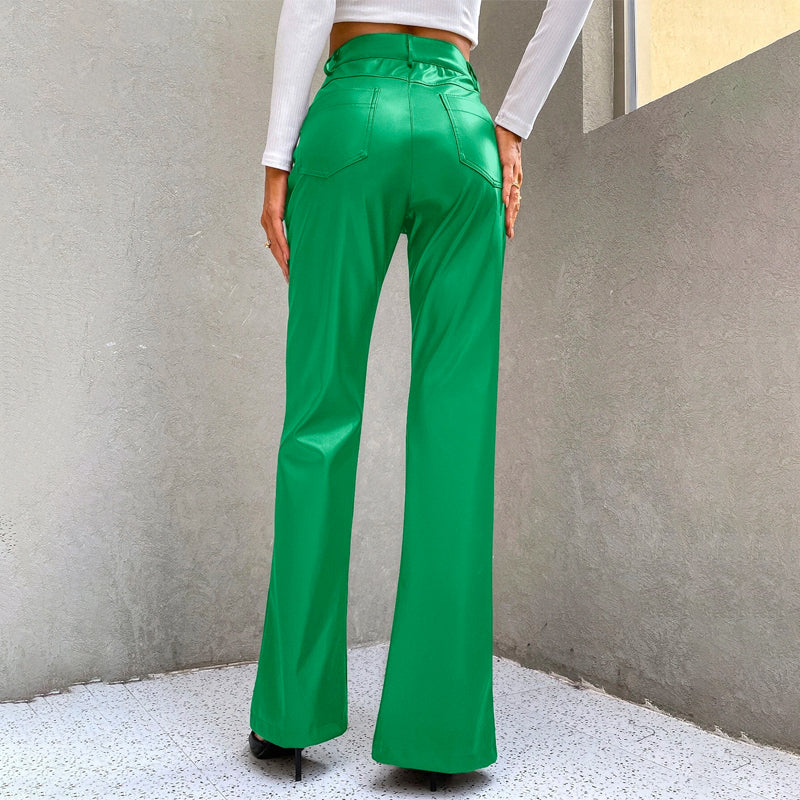 High Waist Slit Hem PU Leather Flare Leg Pants come with a comfortable and easy fit, these women's pants are made from a high-stretch fabric featuring a stretch waistband. The trousers feature an elastic waist and flare legs that make them stylish and comfortable. The knitted fabric provides you with comfort.