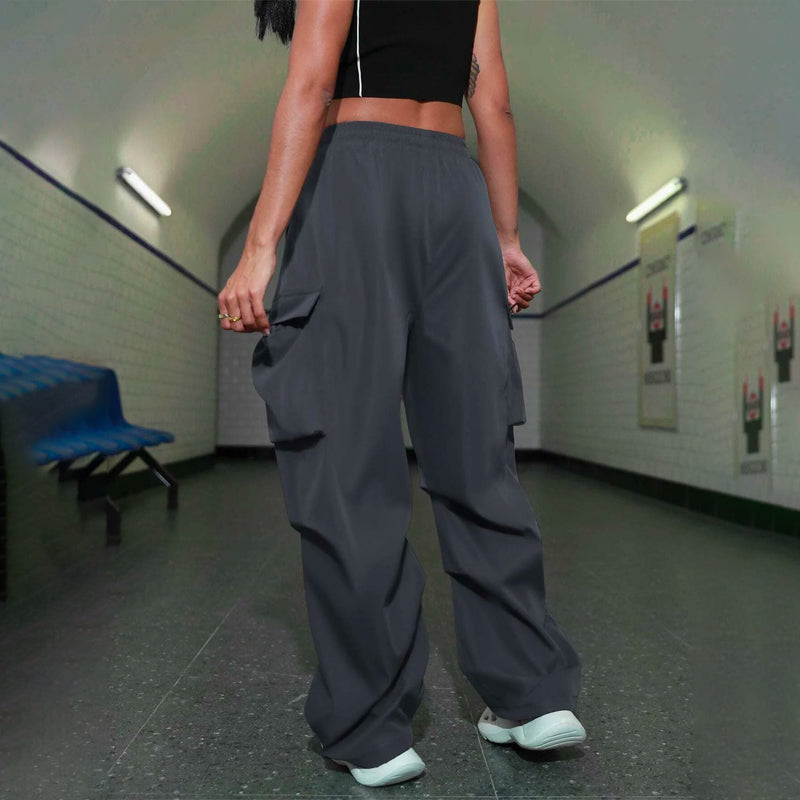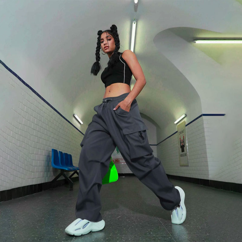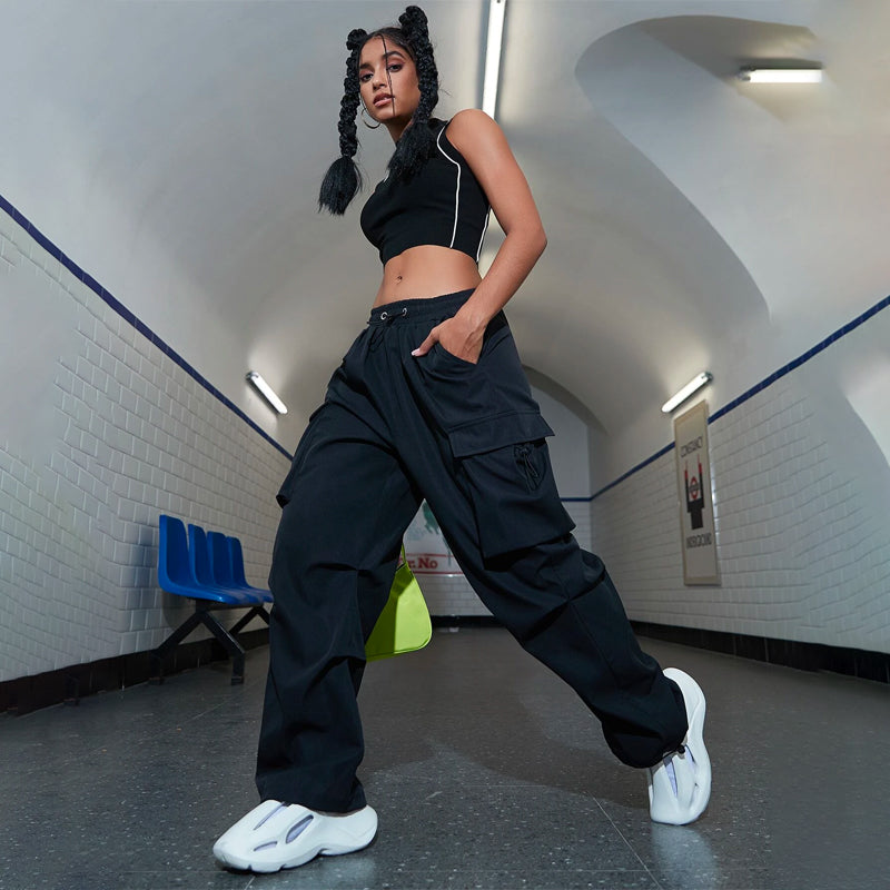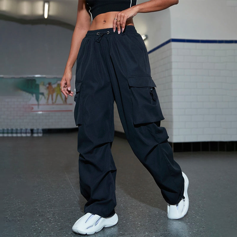 Hip Hop Wide Leg Flap Pocket Parachute Cargo Pants are a versatile pair of workout pants with a pocket and drawstring waist. These pants are designed for women on the go. The pants feature a comfortable fit and a unique design to spice up your wardrobe and keep you fashionable.