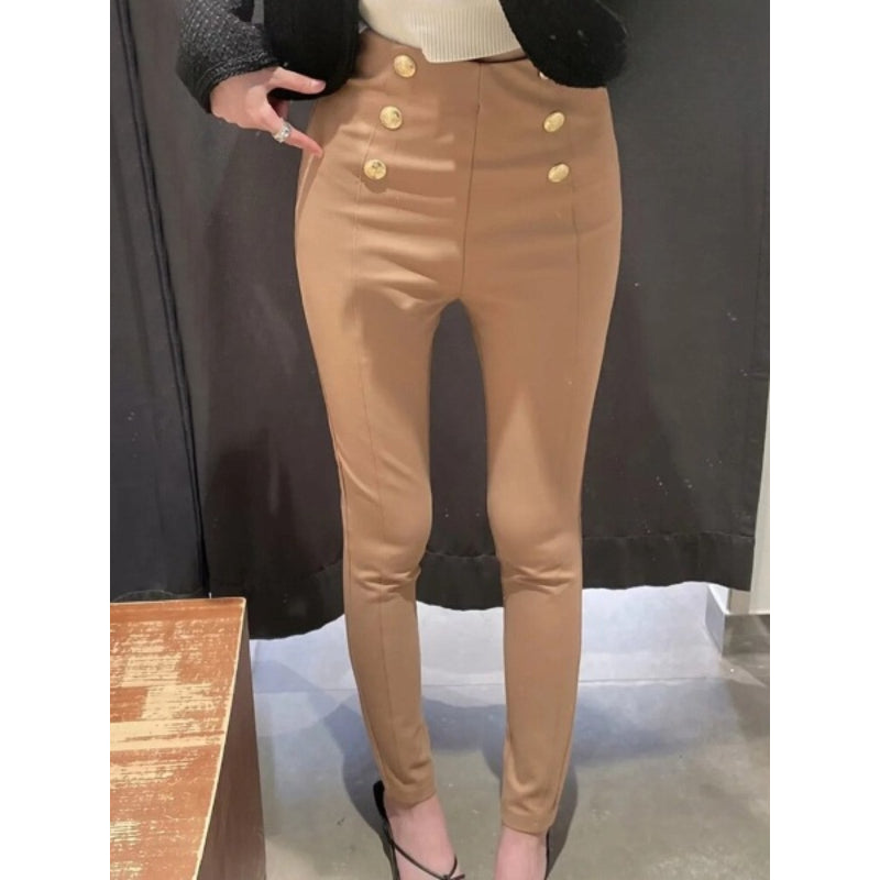 Khaki High Waist Gold Buttons Leggings Pant