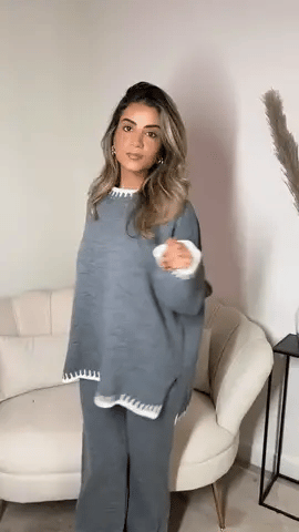 Embrace the cozy elegance of fall with our knitwear set. This ensemble pairs soft-knit trousers with a coordinated sweater featuring distinctive contrast stitching, offering an ideal blend of comfort and style.