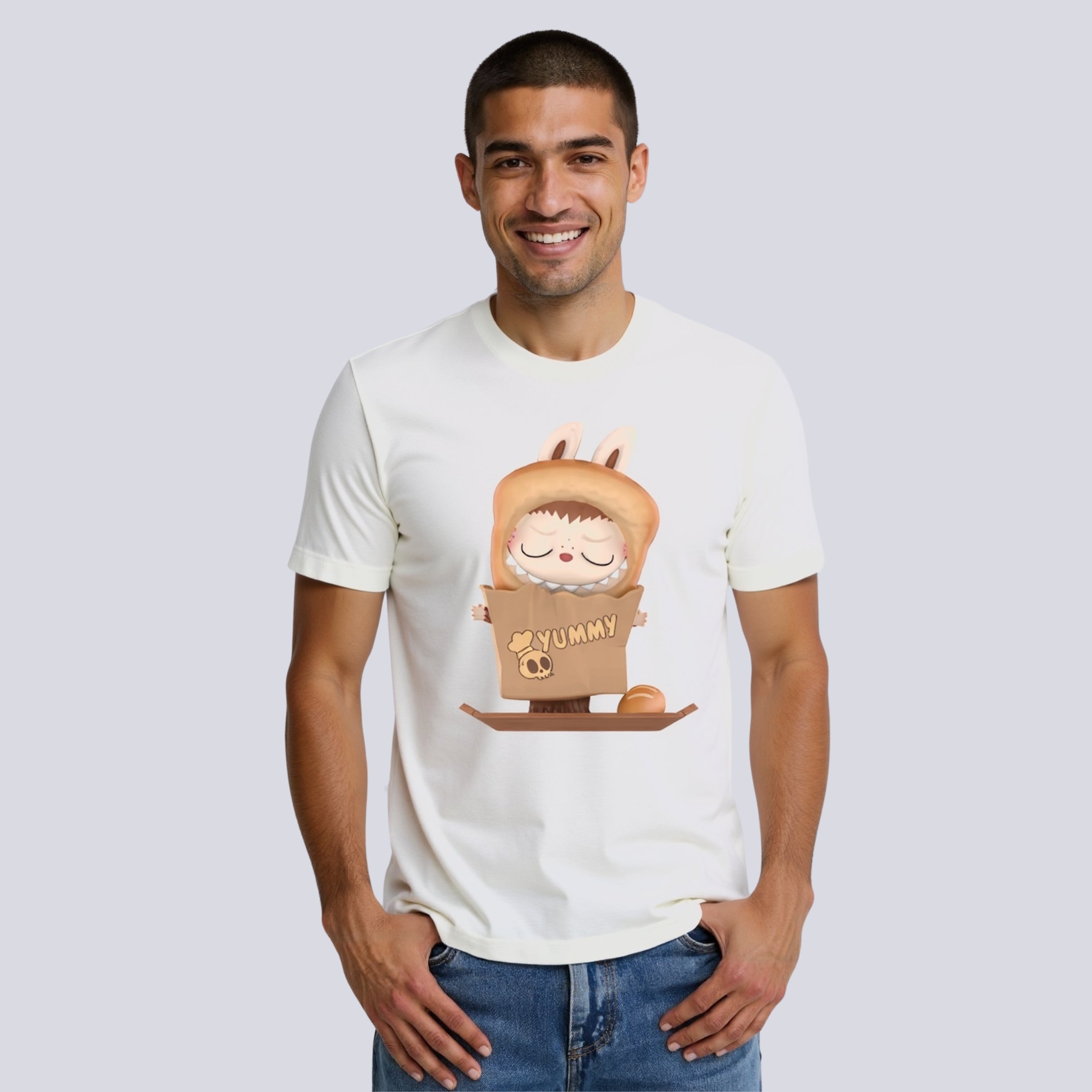 The Labubu Bunny Snack Tshirt brings story and style together. It features a bunny standing in a snack box with the word "YUMMY" on the front. The design adds visual charm while keeping your outfit easy and casual. This graphic shirt speaks to fans of character clothing. With a neutral base and warm tones, the shirt supports everyday wear while adding creative style.