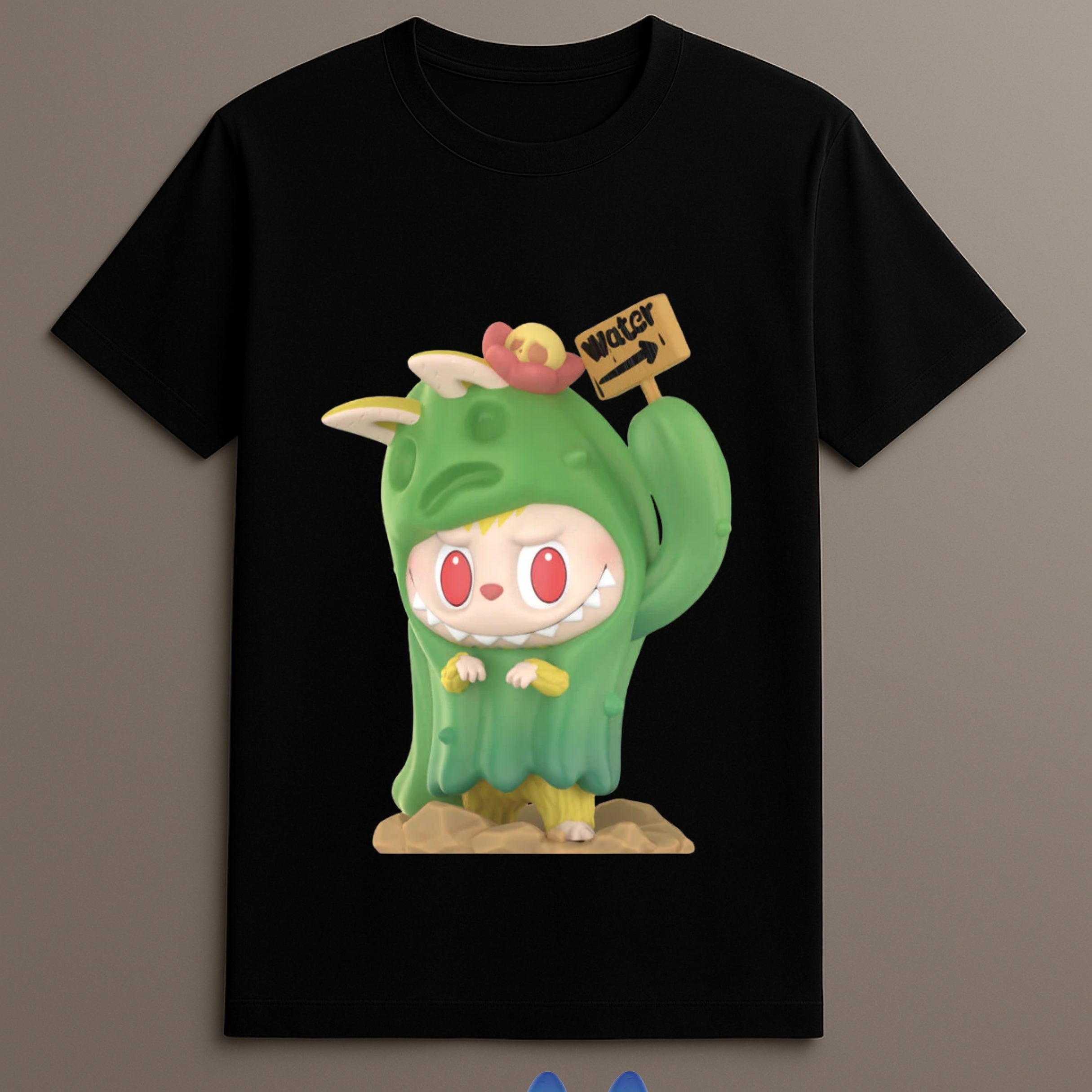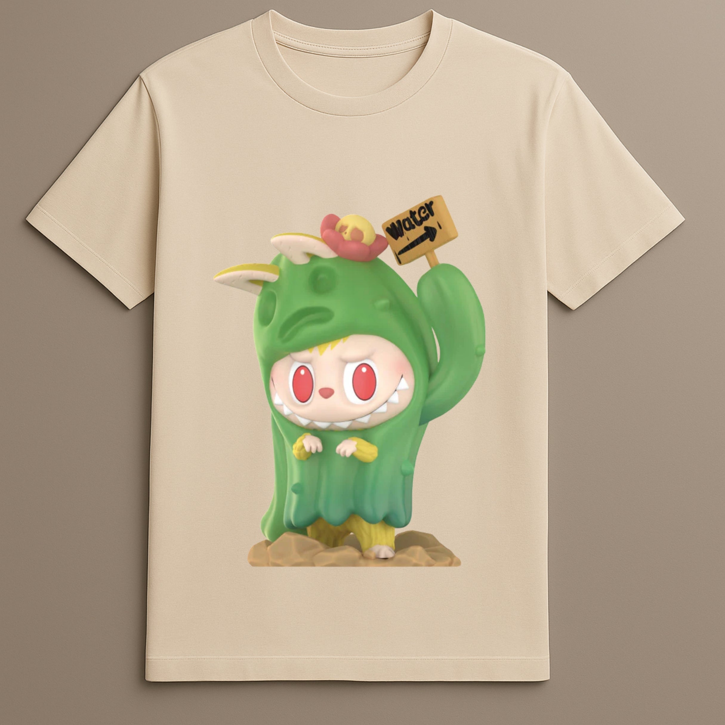 The Labubu Hidden Series Cactus Graphic Tee brings together nature-inspired character design and collectible-themed artwork in a wearable format. This shirt features Labubu dressed in a detailed cactus outfit, holding a wooden sign that says “Water.” Based on the popular Almost Hidden Series, the shirt showcases clear illustration, smooth composition, and a structure suitable for everyday outfits.