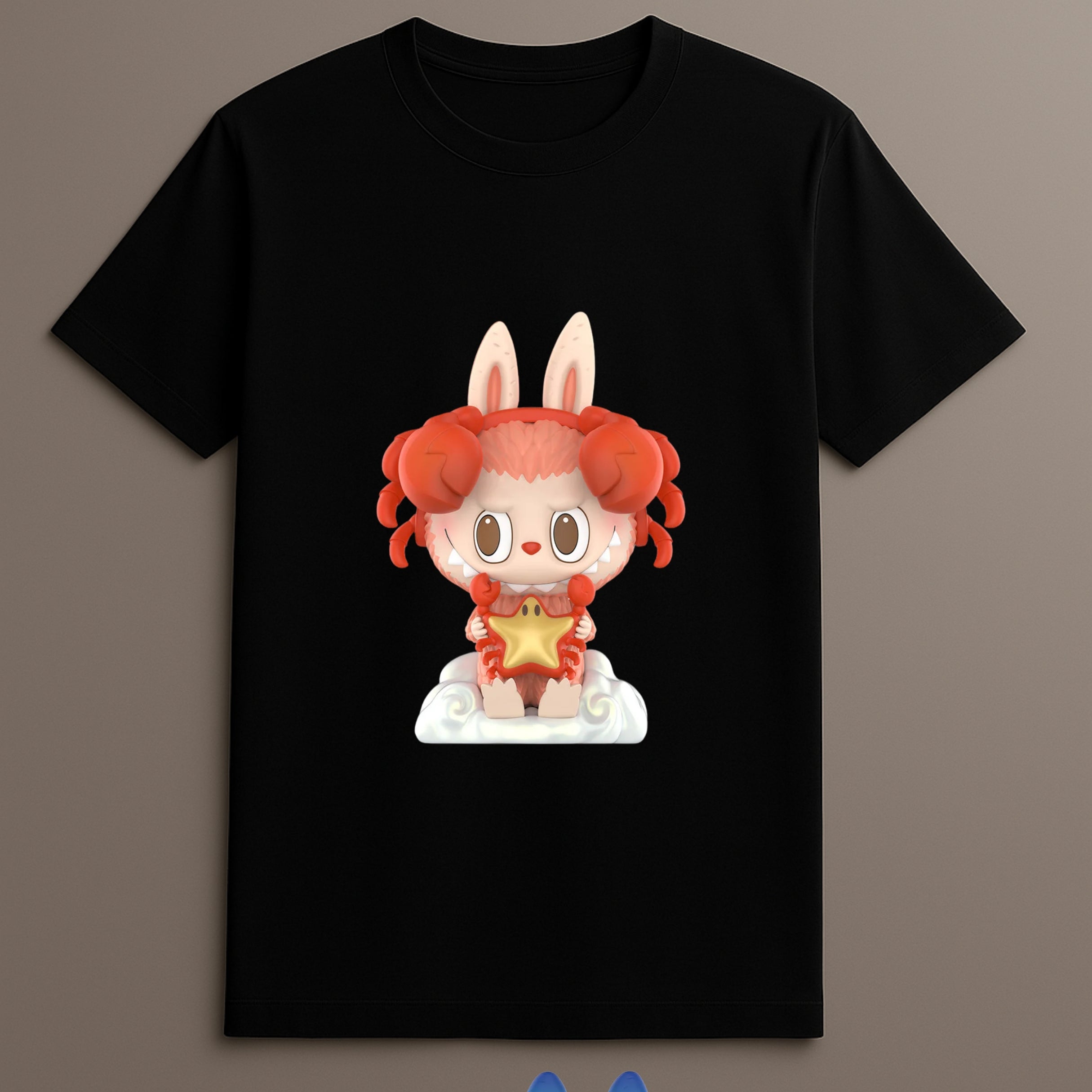 The Labubu Crab Bunny T Shirt with Star Design brings together playful design elements inspired by character illustration and zodiac storytelling. This casual top highlights a celestial scene featuring a red crab-themed figure holding a gold-colored star, seated on a swirling cloud. The background supports a peaceful atmosphere while offering rich visual interest.