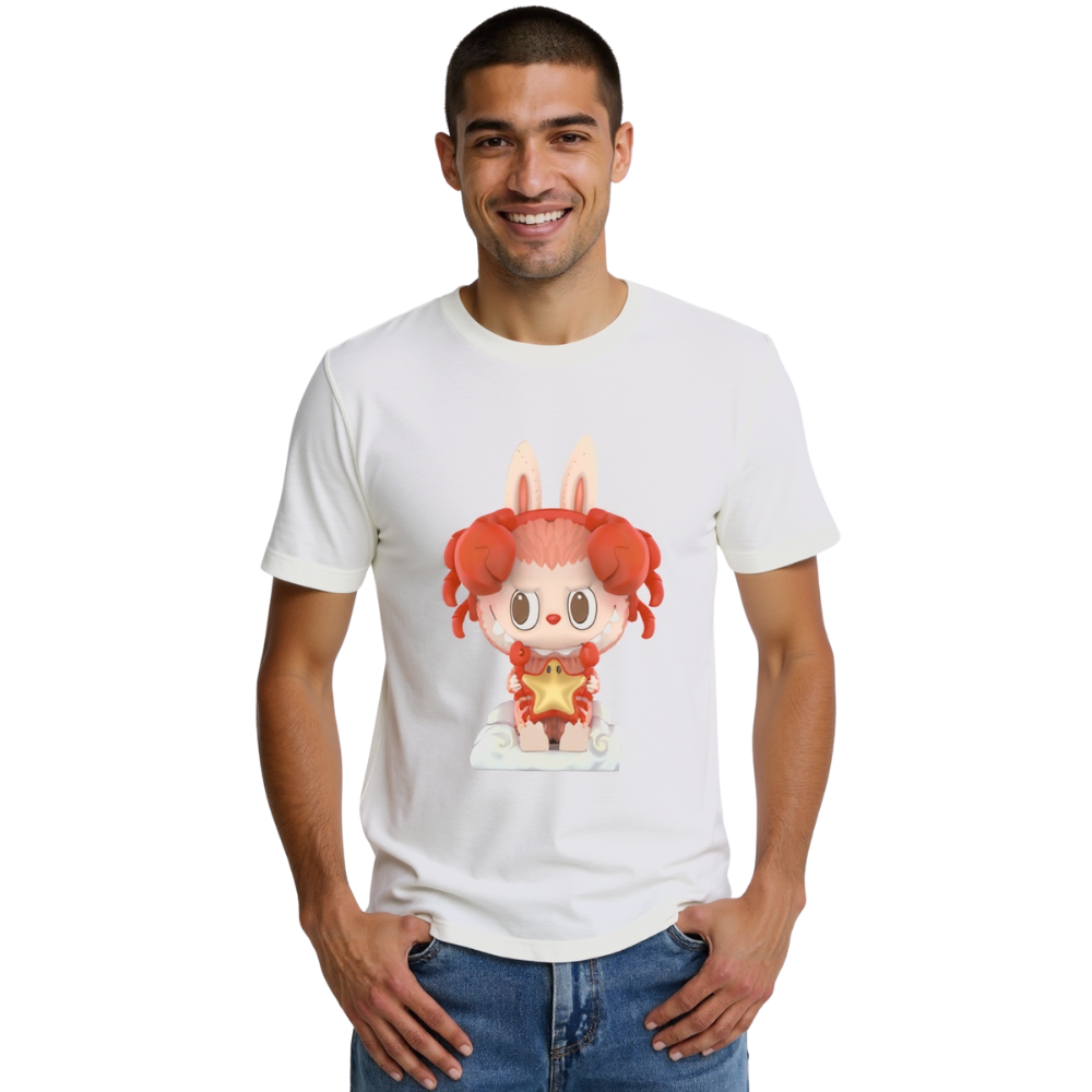 The Labubu Crab Bunny T Shirt with Star Design merges storytelling and character illustration into a compact wardrobe option. With its red zodiac outfit, golden star prop, and soft cloud elements, this piece captures symbolic visuals without added complexity.