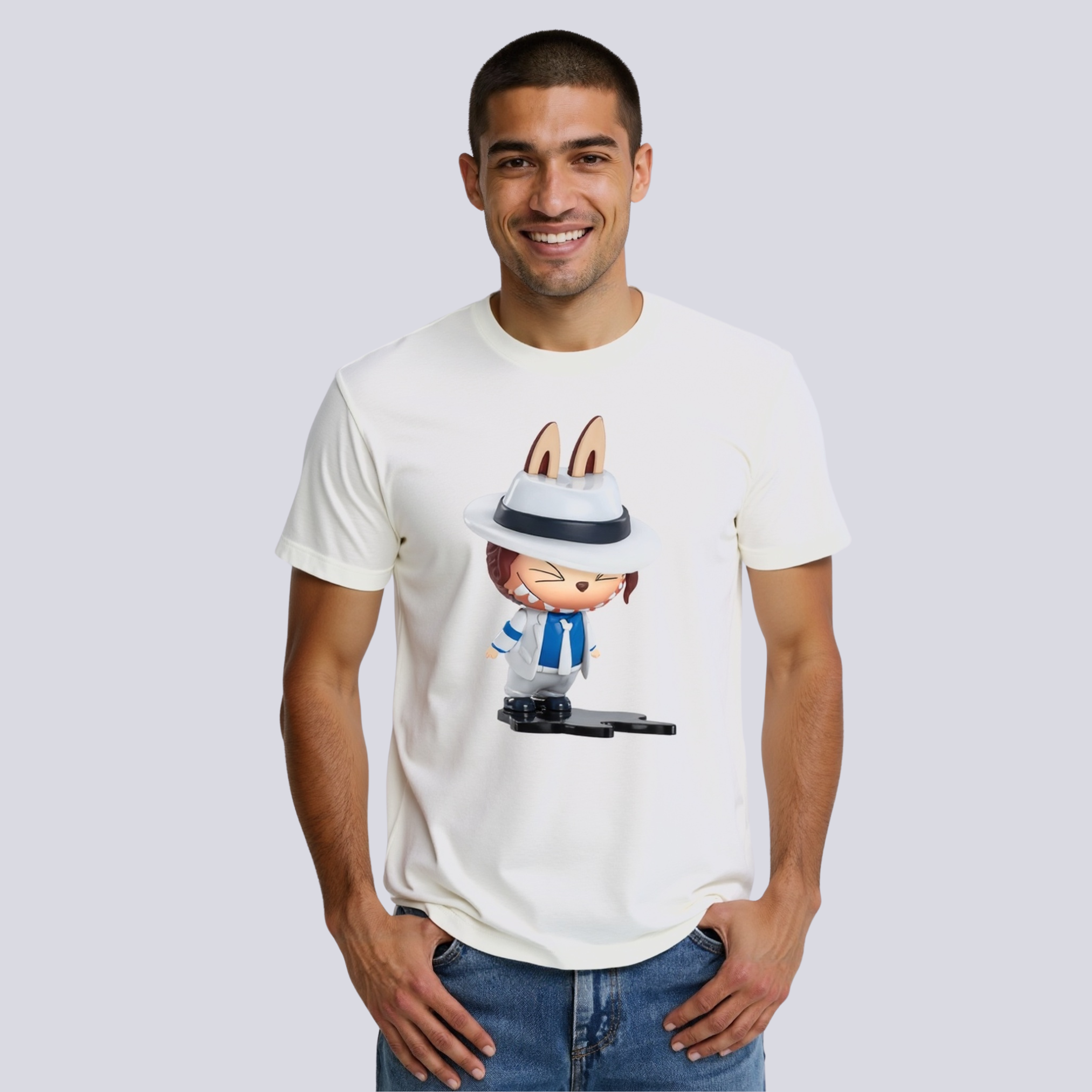 The shirt’s primary feature is a high-resolution Labubu graphic positioned on the front. Dressed in a dapper outfit with an expressive facial gesture, Labubu is shown mid-dance, capturing a snapshot of personality and motion. The clean lines, bold colors, and winking eye give it animated depth while remaining easy to style.