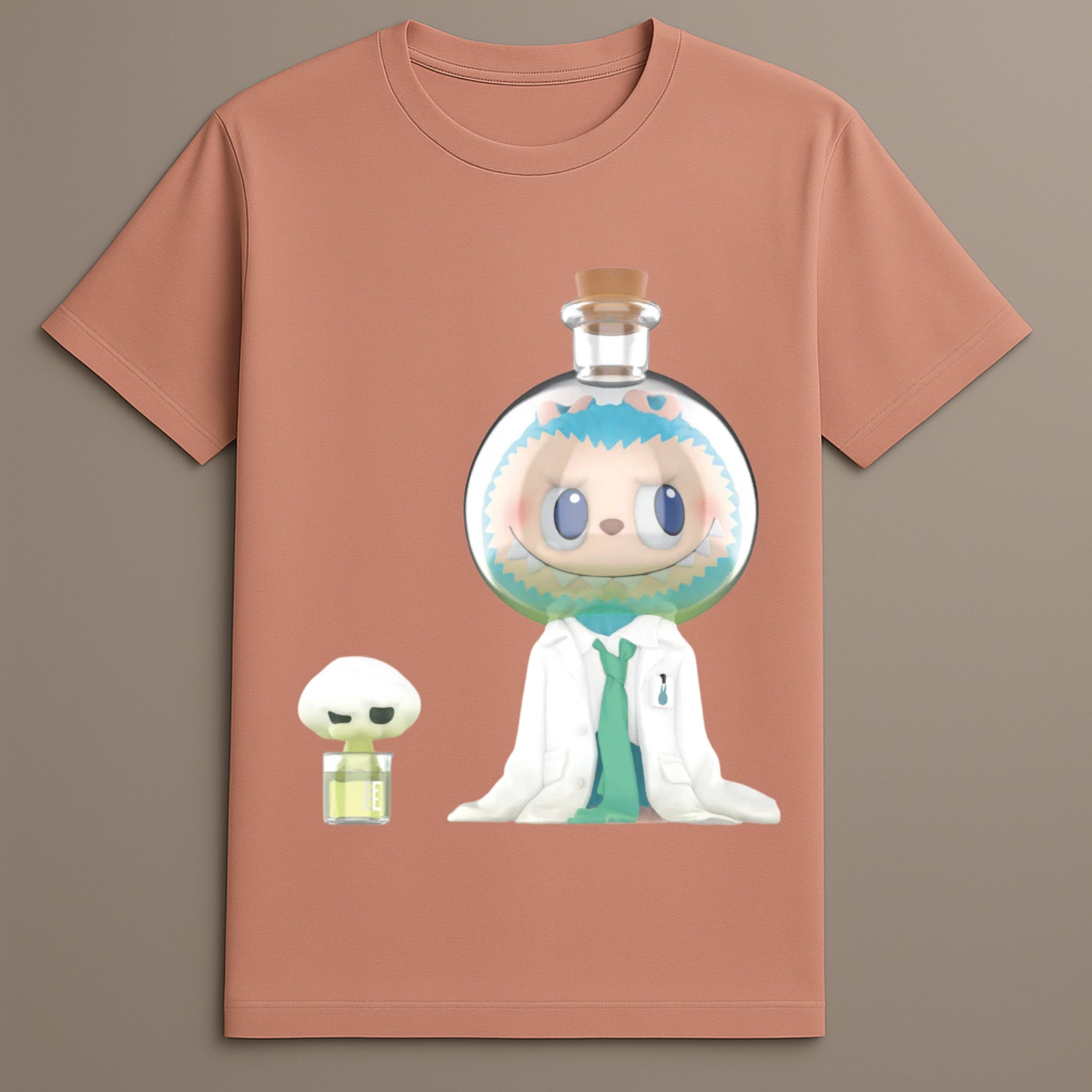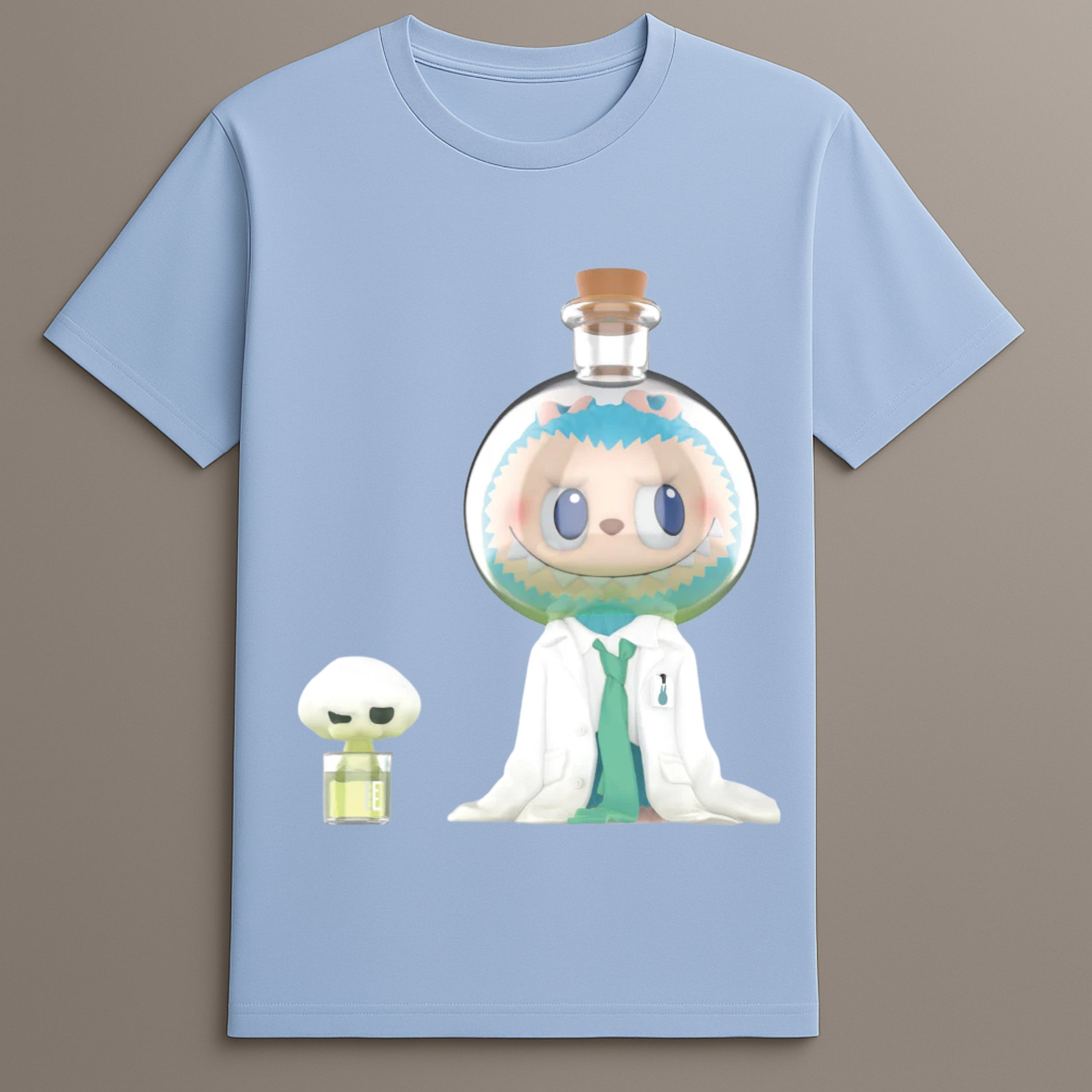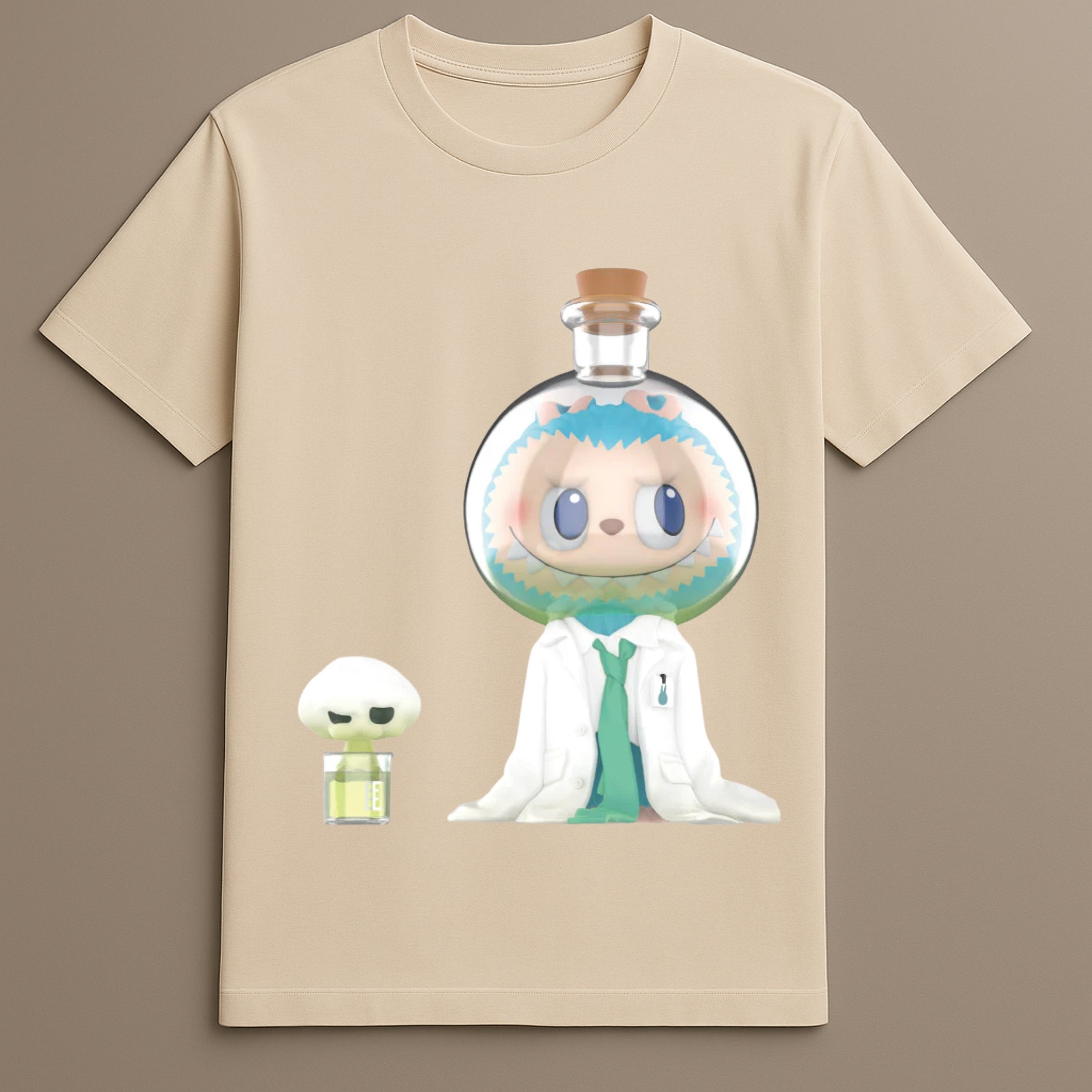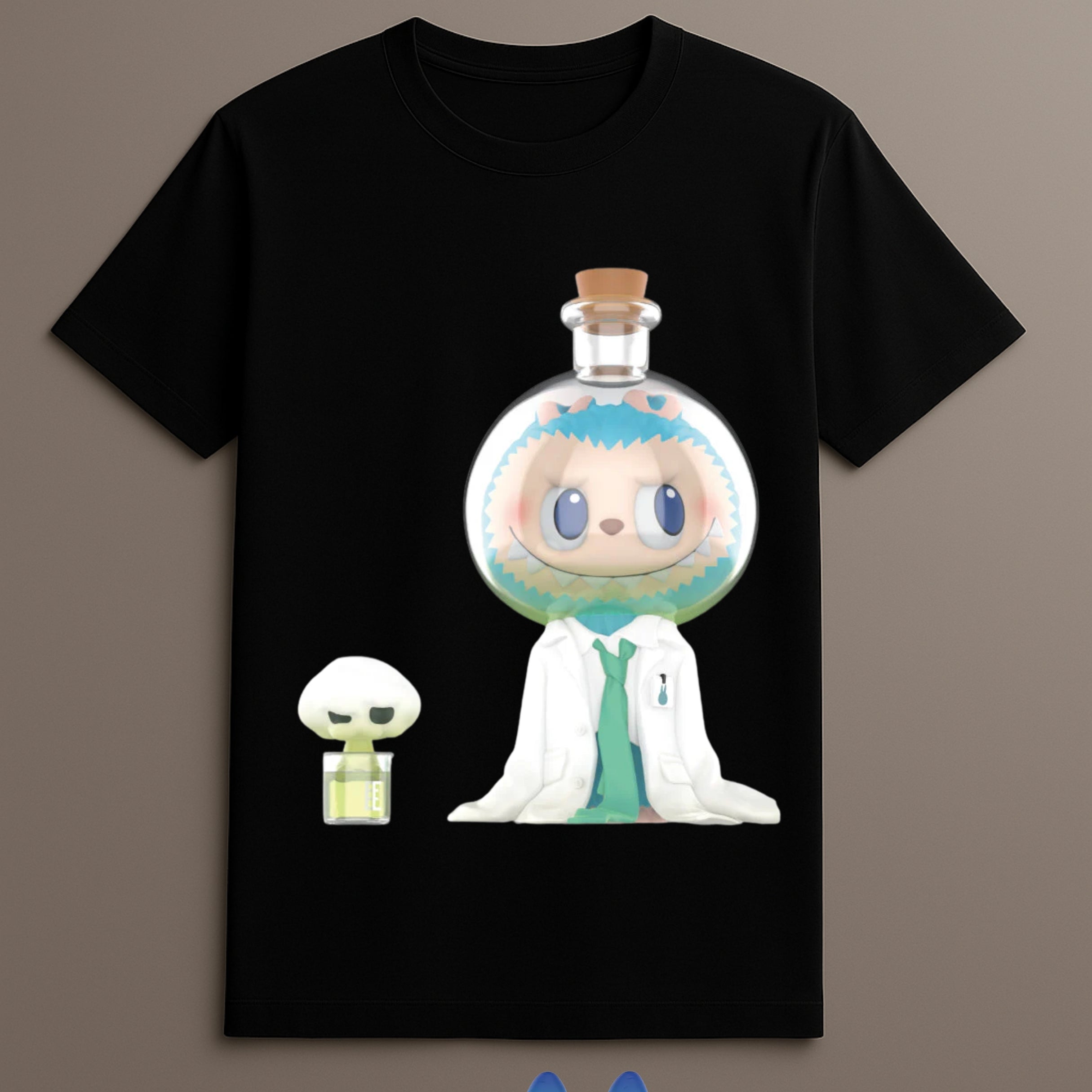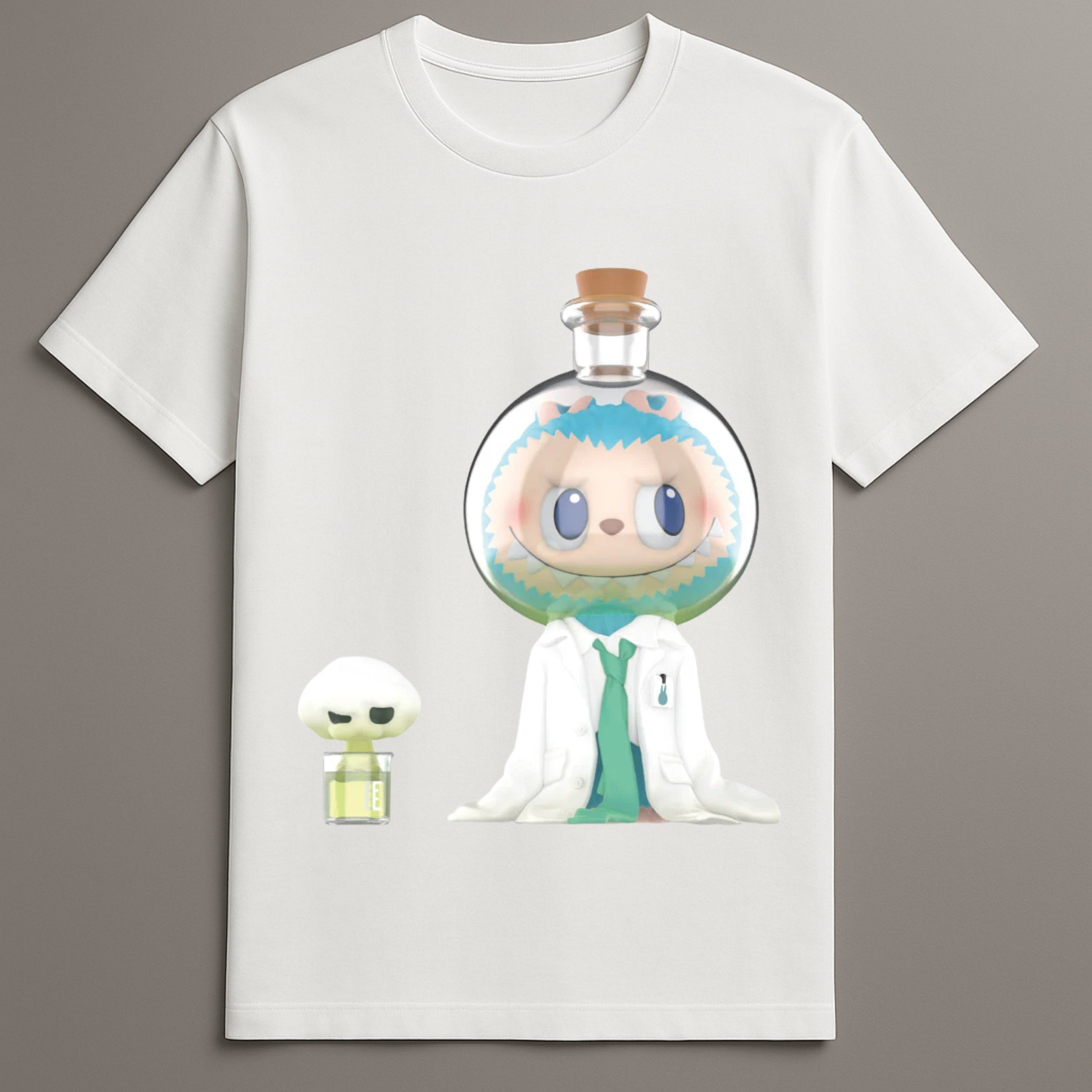 This Flask Figure Shirt highlights a playful scene of Labubu in a lab-themed setting, complete with flask enclosure and a cartoon lab coat for a distinct style.