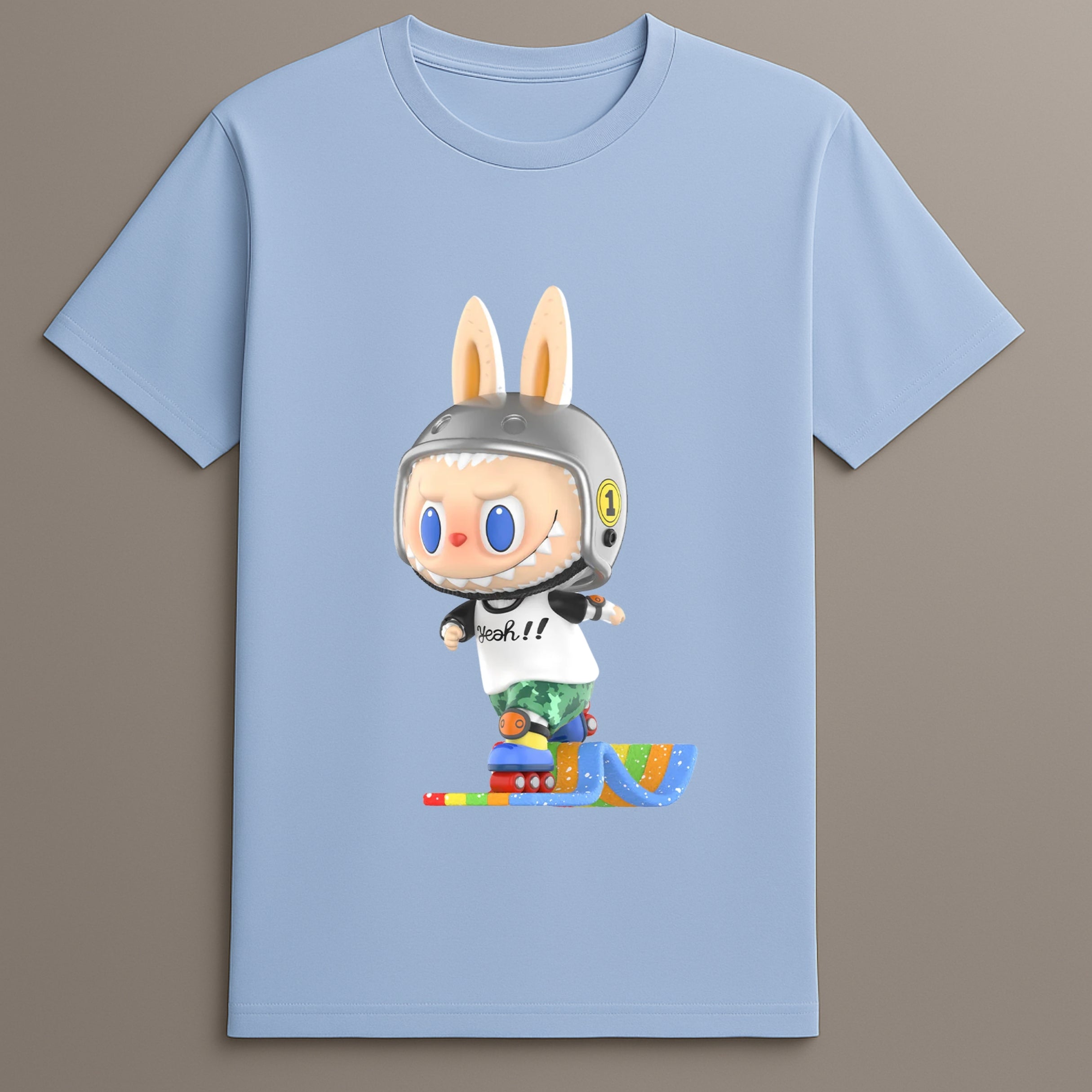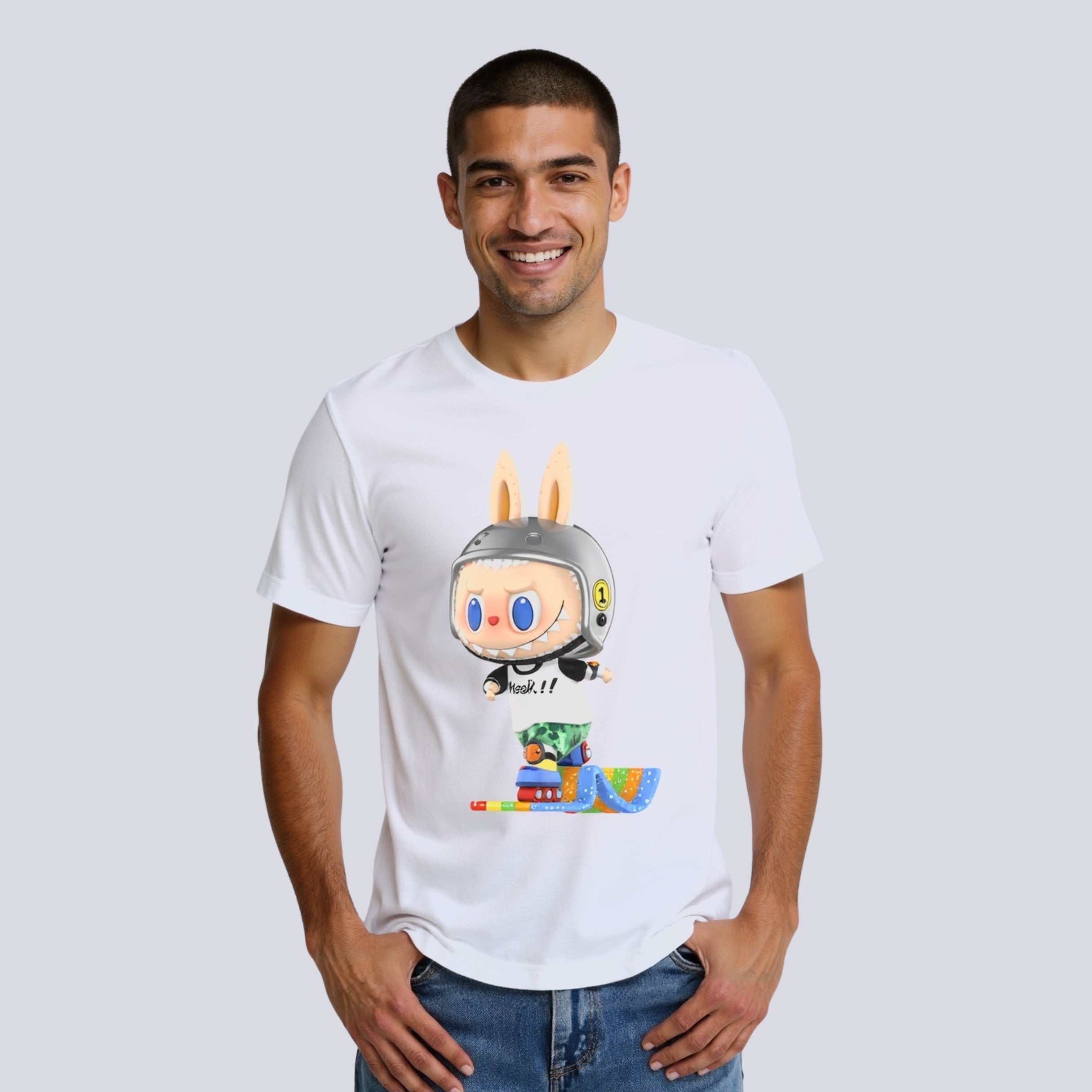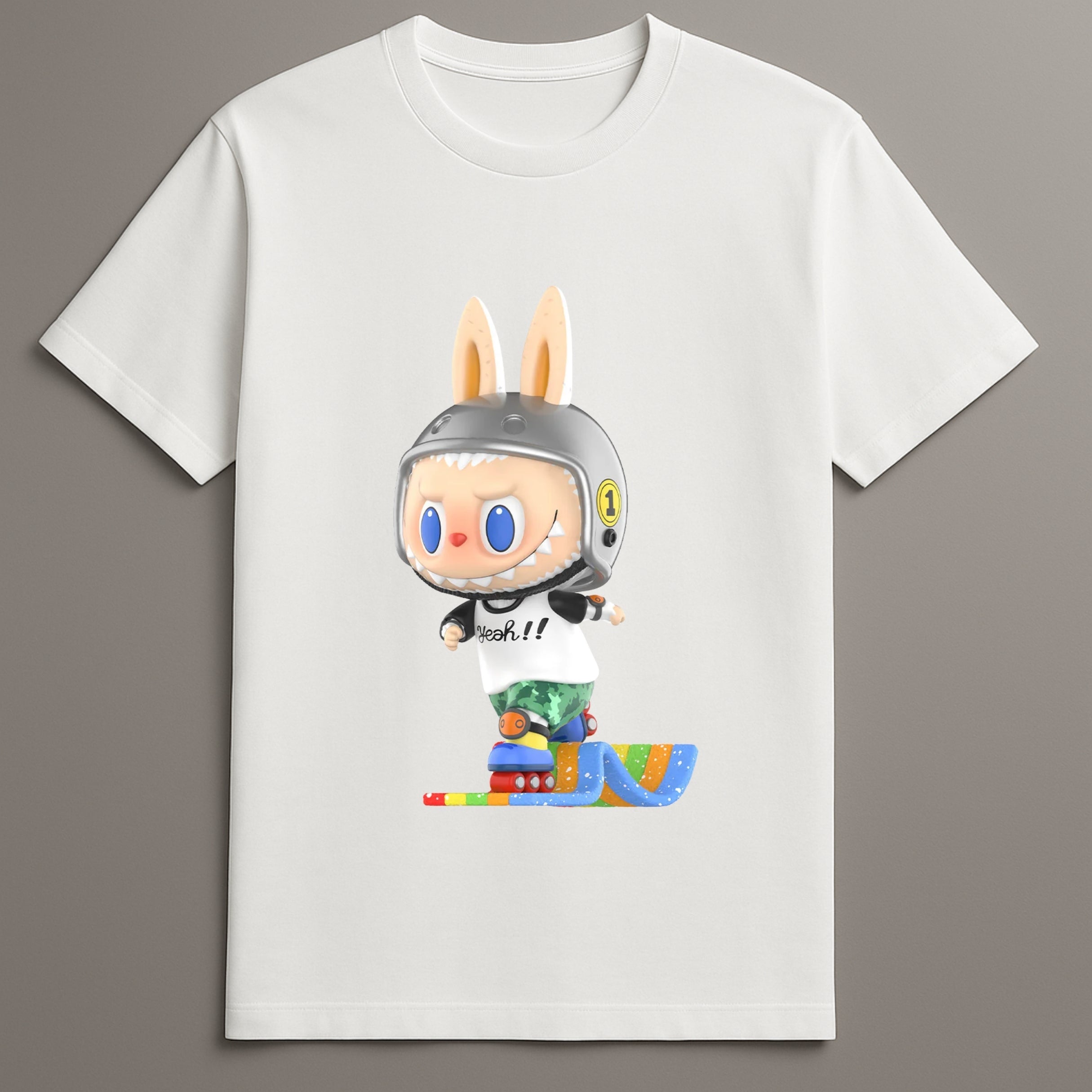 The Labubu Speed Skate Tshirt is designed for energy filled fashion. It features a dynamic bunny graphic in motion. Wearing a helmet and skate shoes the bunny captures action in a unique visual. This character themed tshirt brings fast motion and fun design together. Ideal for casual use it blends bold graphic style with practical wearability. The print feels fresh and expressive.