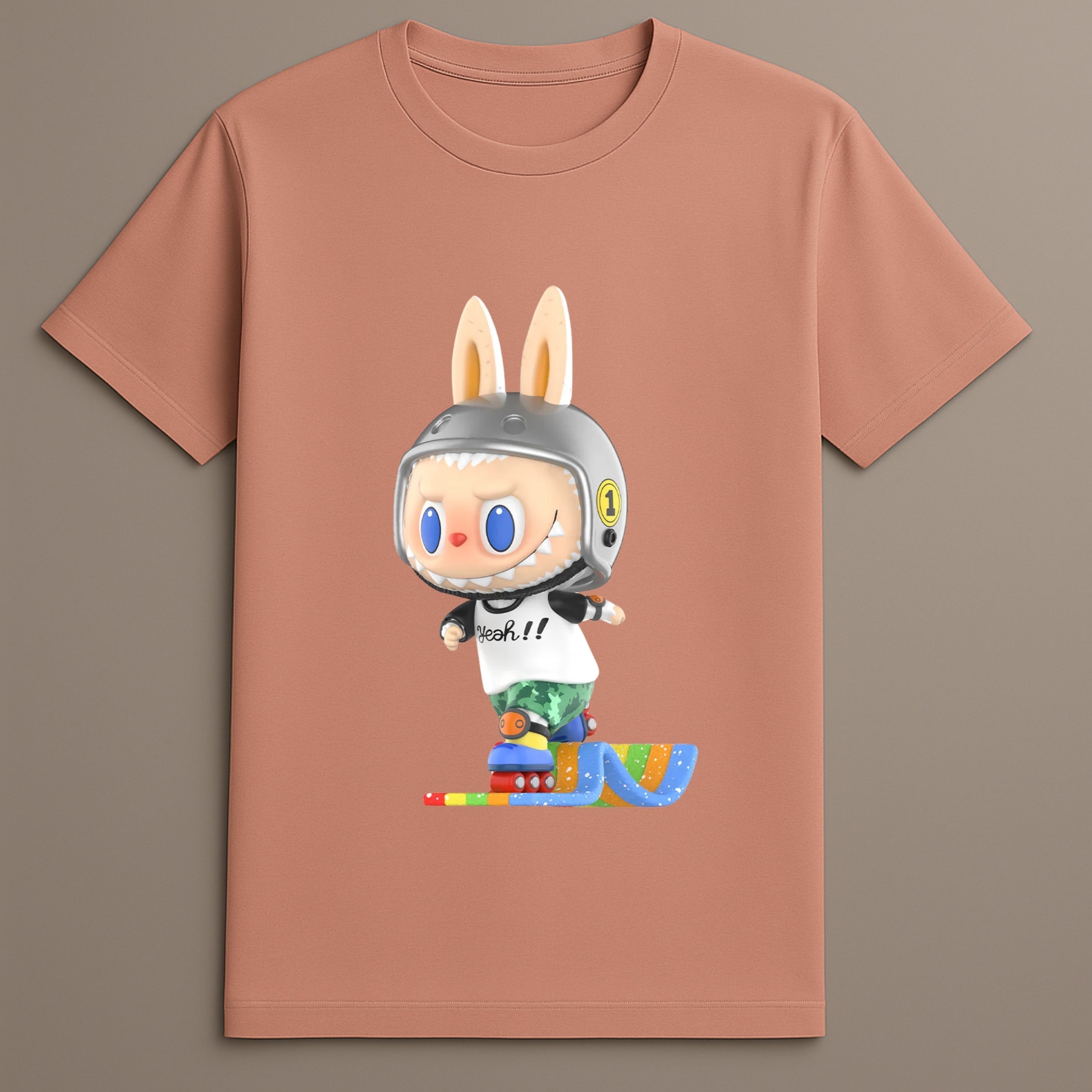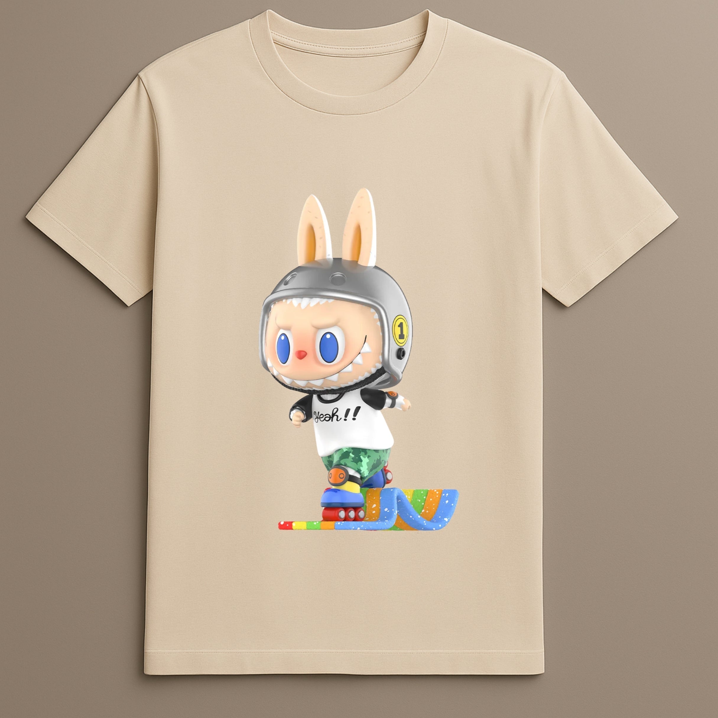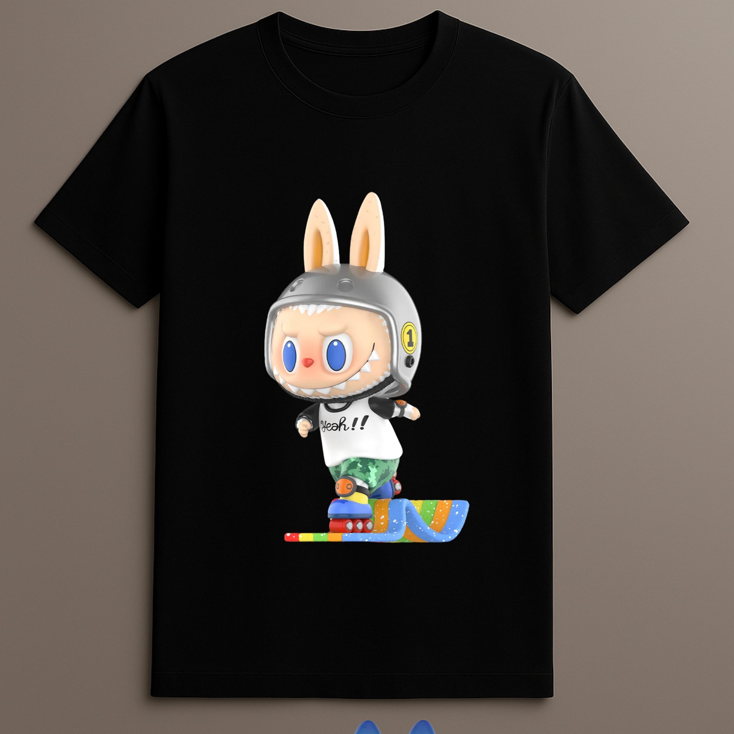 The Labubu Speed Skate Tshirt is designed for energy filled fashion. It features a dynamic bunny graphic in motion. Wearing a helmet and skate shoes the bunny captures action in a unique visual. This character themed tshirt brings fast motion and fun design together. Ideal for casual use it blends bold graphic style with practical wearability. The print feels fresh and expressive.