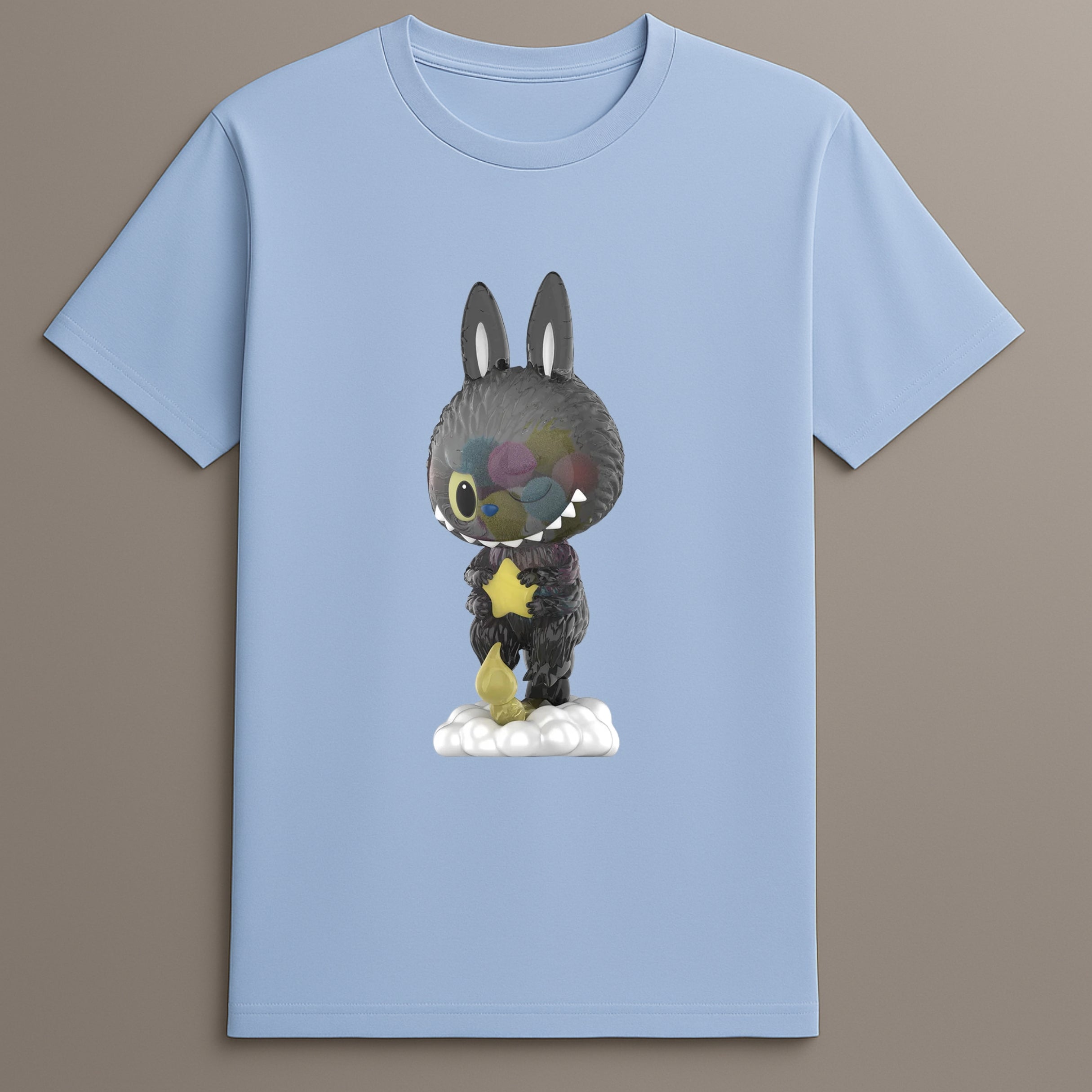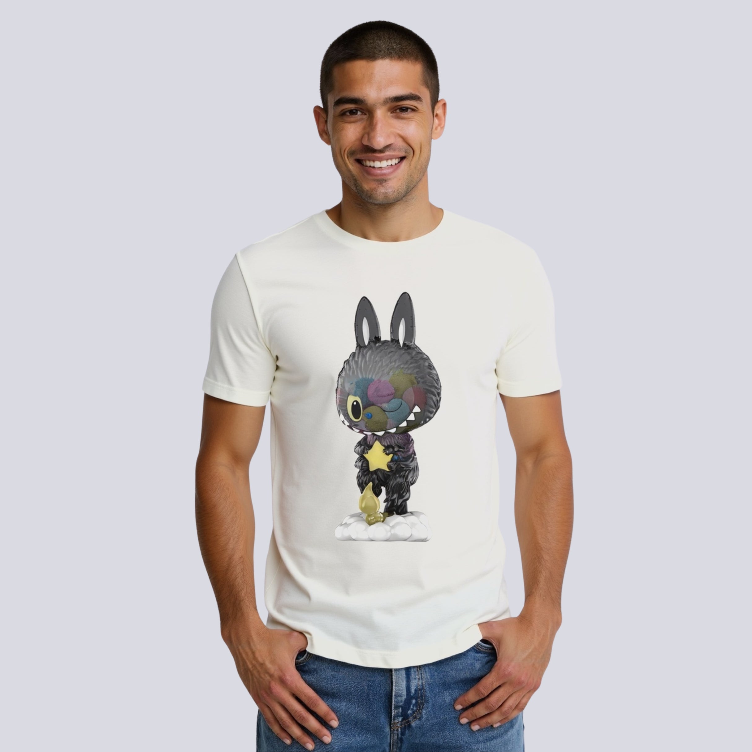 The Labubu Star Graphic T Shirt with Shadow Bunny Design merges visual narrative with graphic styling in a wearable format. The dark bunny, glowing star, and resting cloud give the print a calm yet story-rich feel. This shirt works for art-driven individuals who appreciate design with intention.