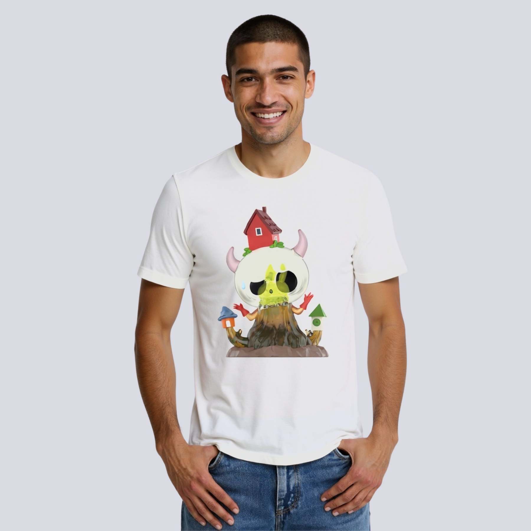 This shirt features a creature with horns and a pale mask. Small house elements sit at the base and top. It feels both grounded and curious.