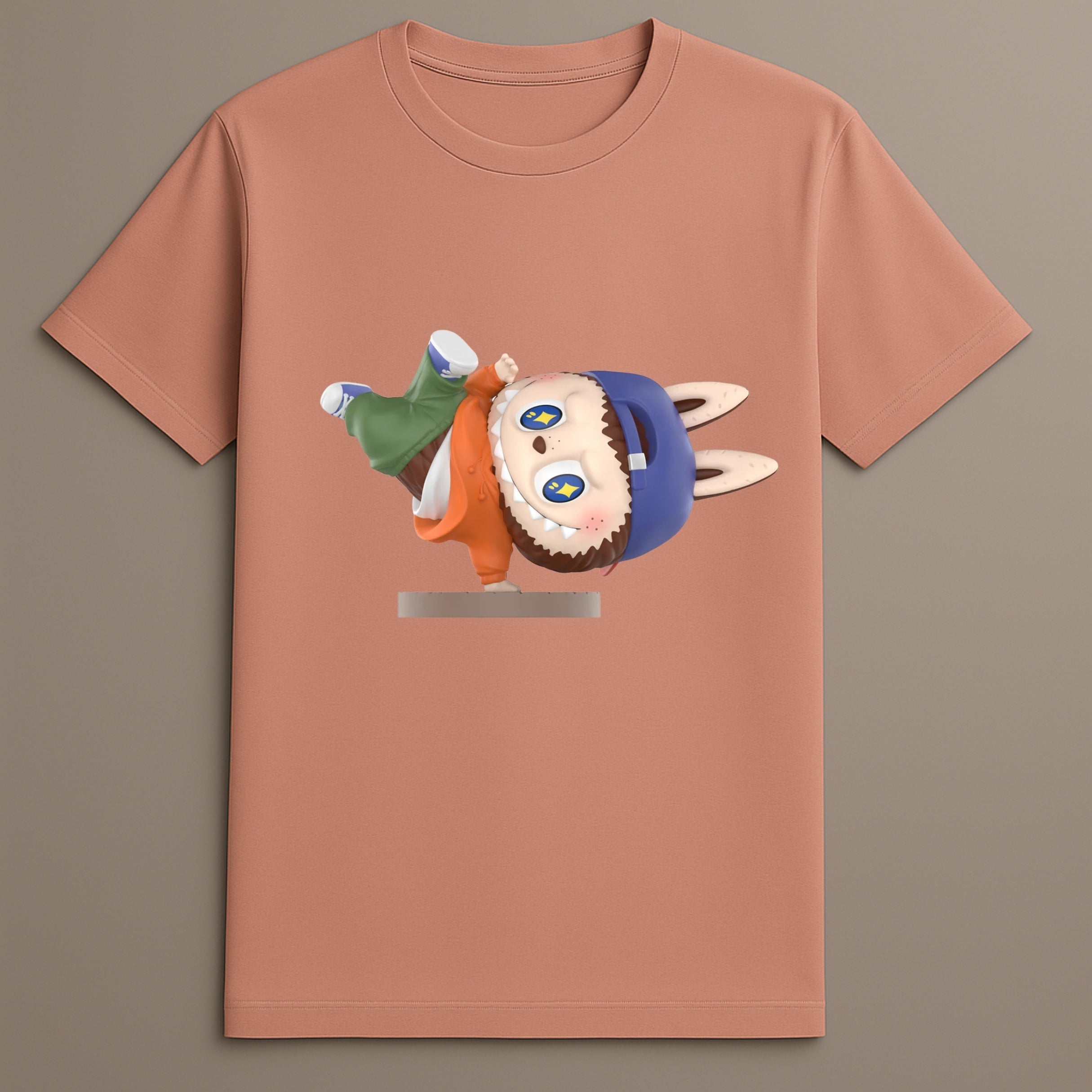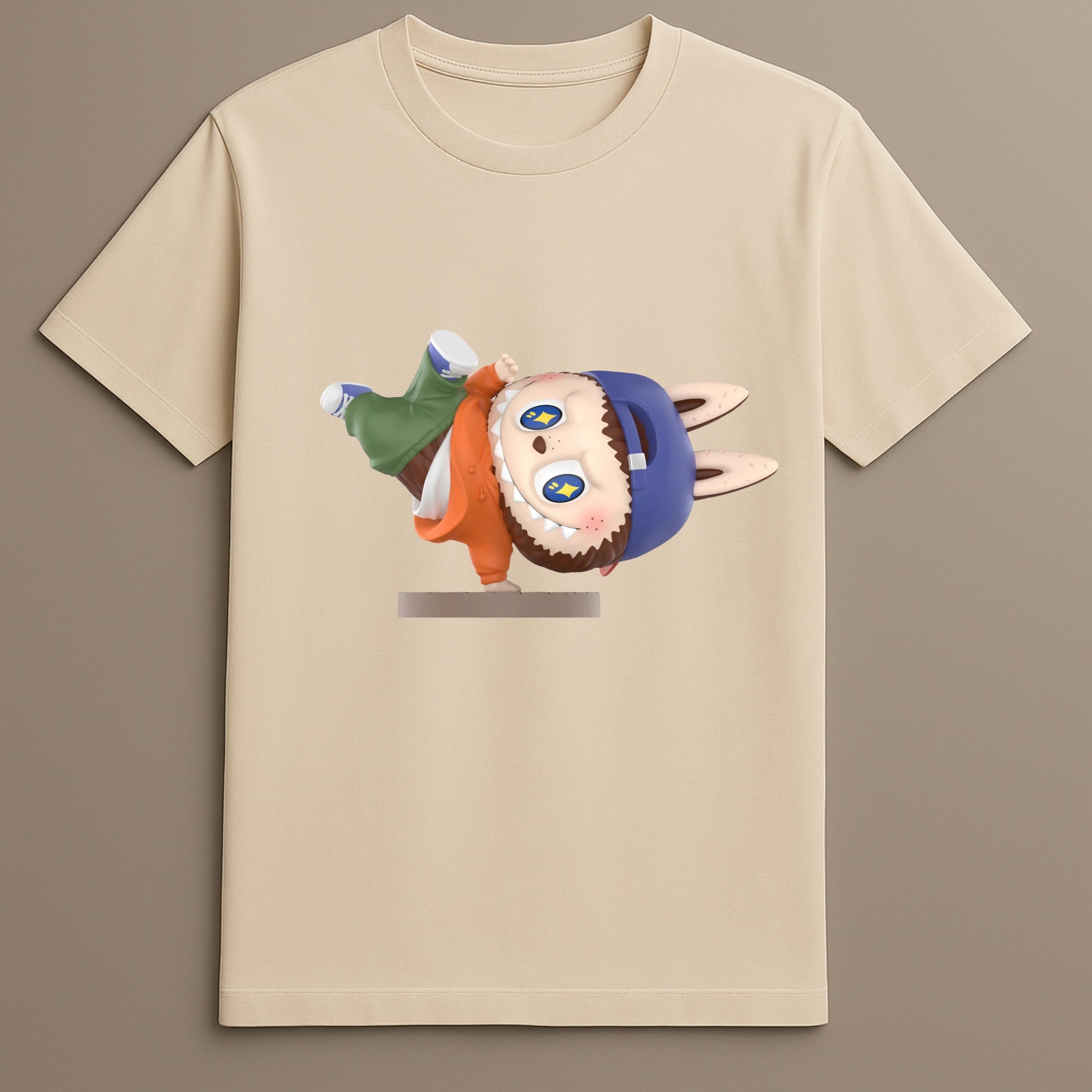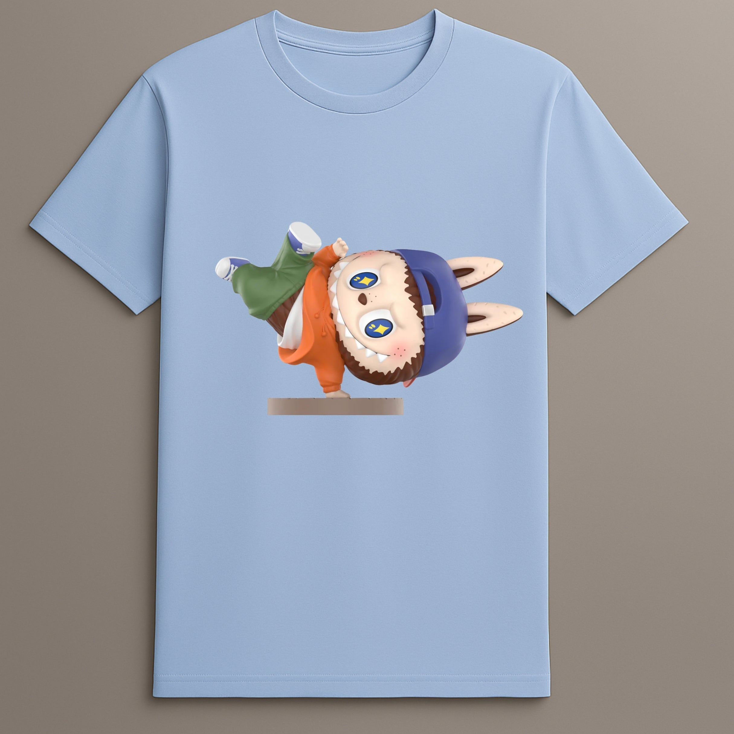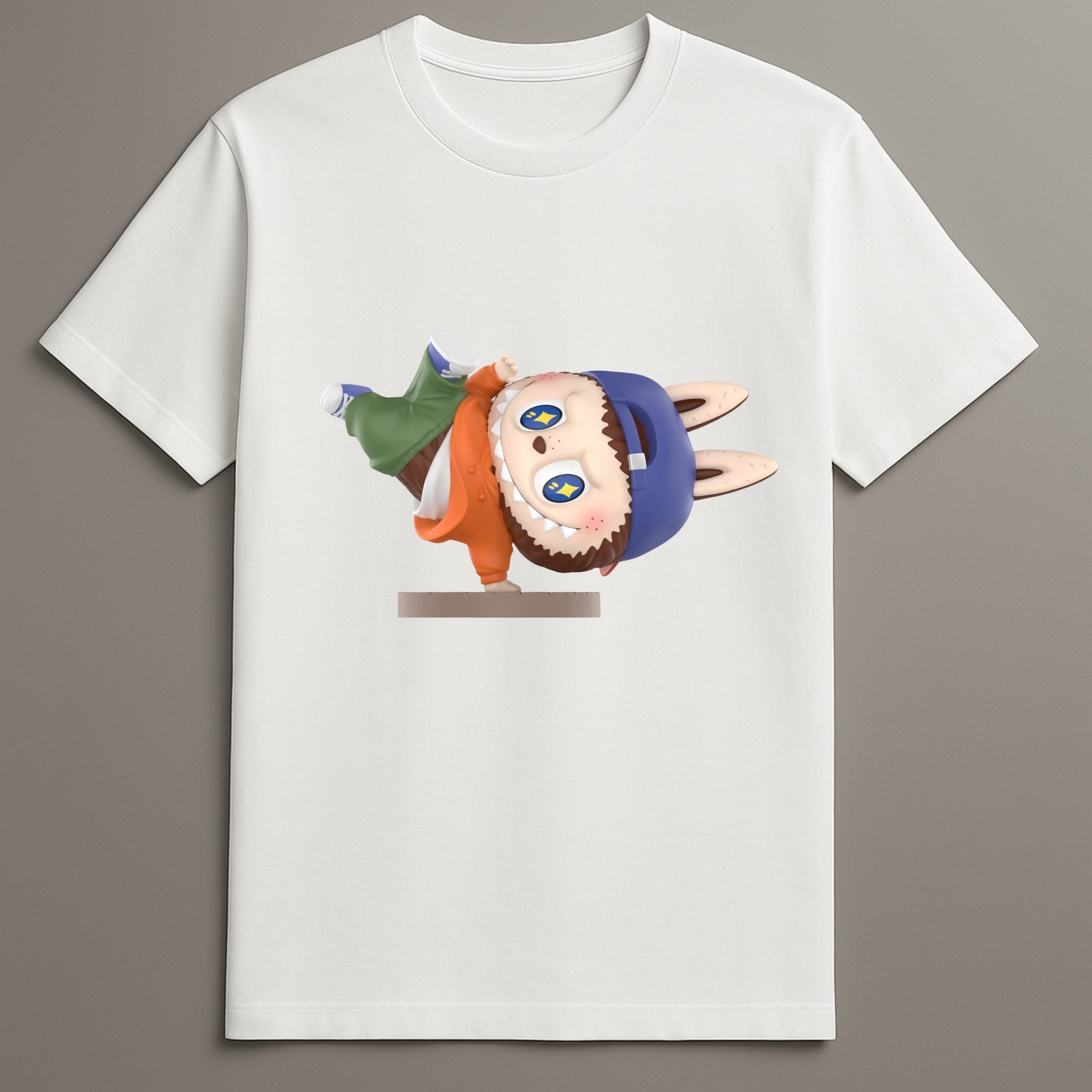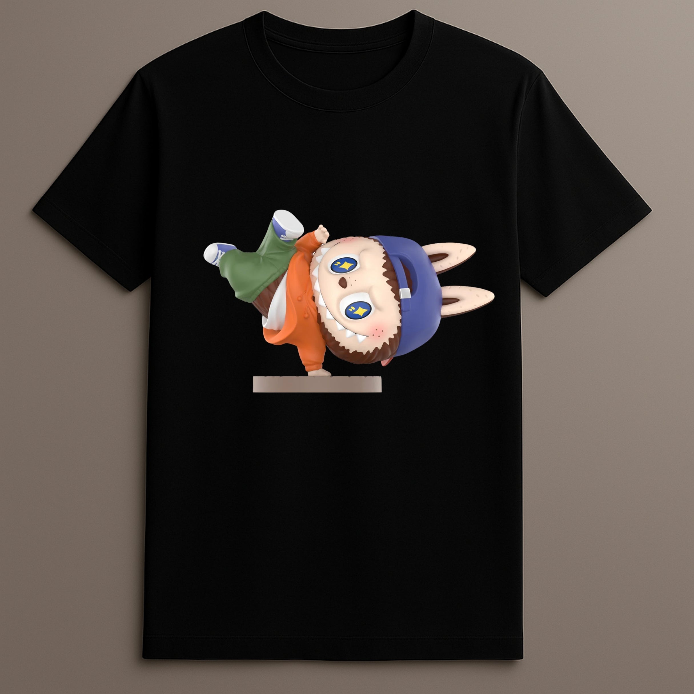 The Labubu Street Dance T-Shirt brings animation, rhythm, and streetwear together in a printed vinyl graphic format. This tee features Labubu in a dynamic breakdancing pose, complete with street-inspired styling and a playful twist. Positioned on a clean base with a matte finish and graphic vinyl overlay, the artwork captures movement and bold color that defines the energy of urban street fashion.