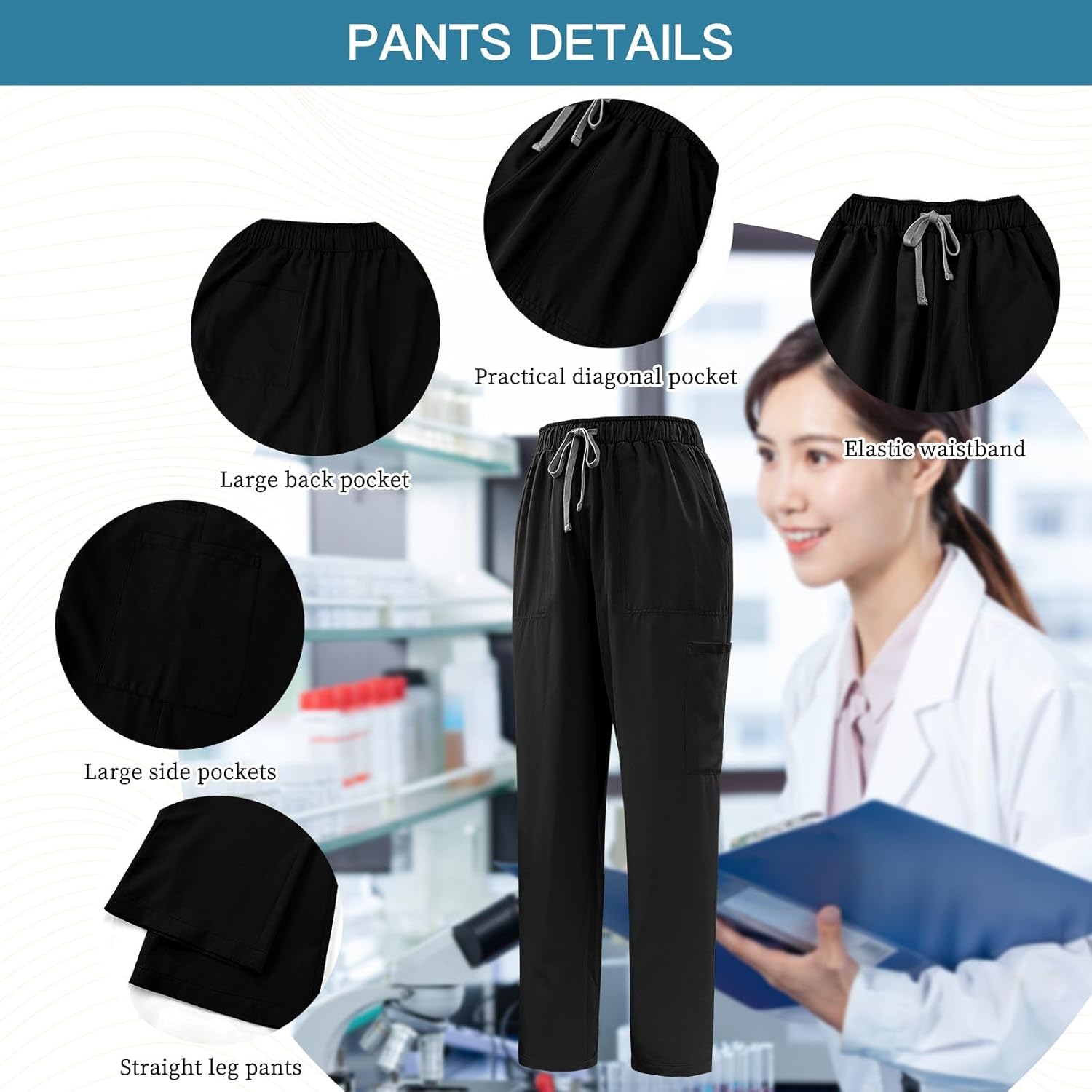 The included pants feature an adjustable Drawstring Scrub Pants design. The waistband adapts comfortably to varying waistlines while maintaining stability throughout active movement.