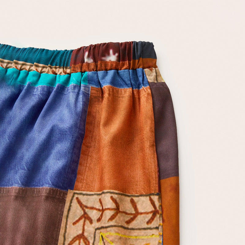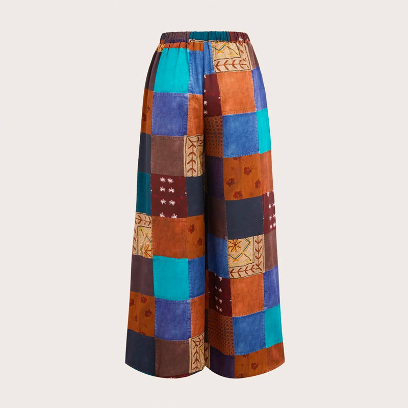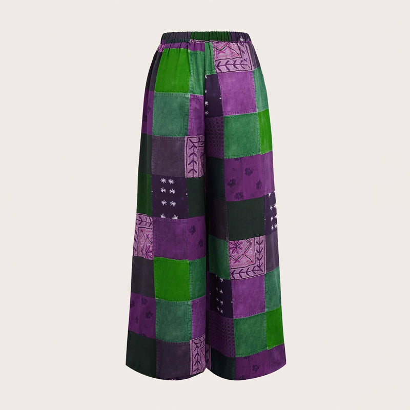 Patchwork Print Wide Leg Pants are an essential staple for any woman's wardrobe. These stylish women's pants are designed for flattering looks and comfortable wear, whether paired with a polo shirt or a blouse. The color block and patchwork pattern make these pants perfect for party wear.