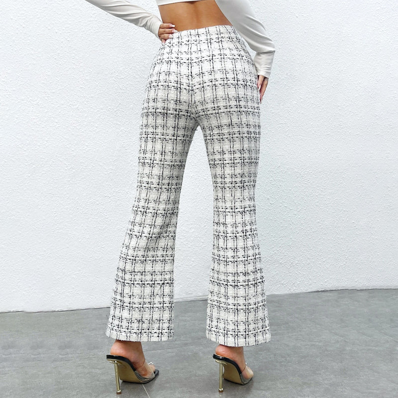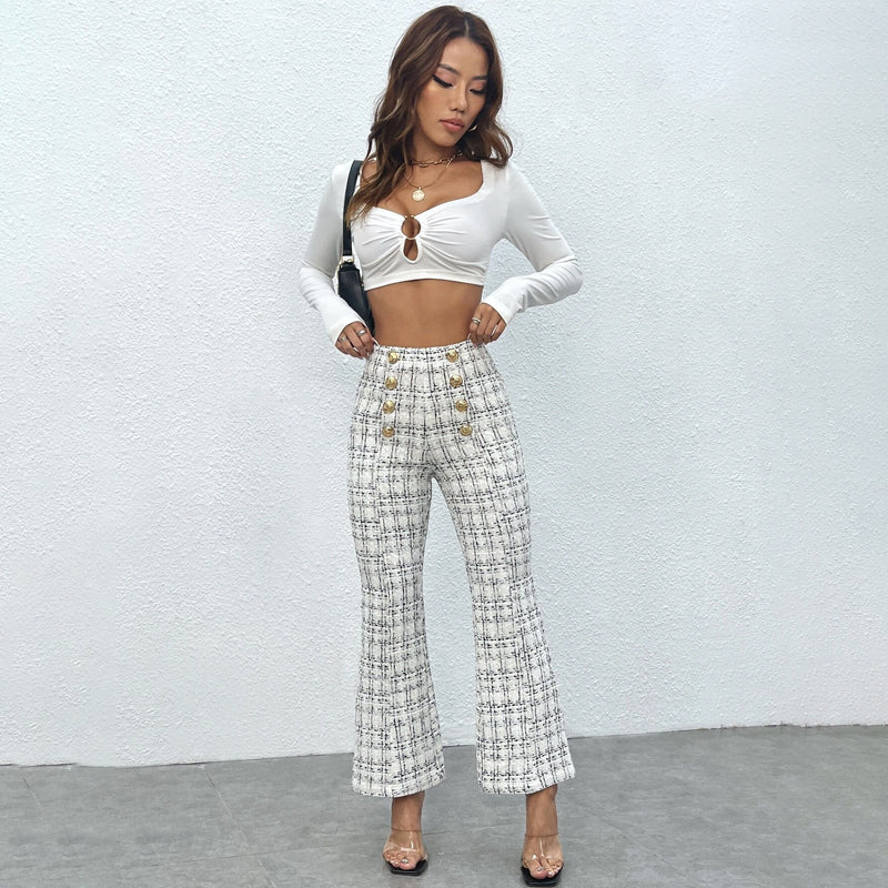 Elegant and stylish, these Plaid Button Tweed Flare Leg Pants are perfect for any occasion. The zipped fly closure helps make them a favorite of women who want to look polished and professional, while the plaid pattern makes them perfect for an elegant office look. The high waist and regular-fit woven fabric make them perfect for an everyday look.