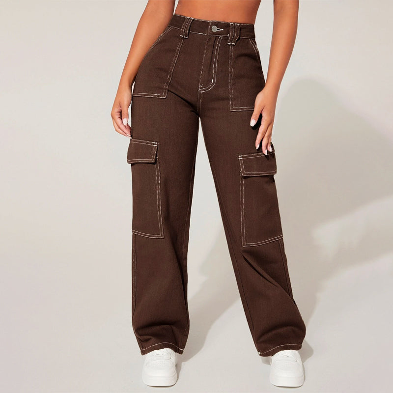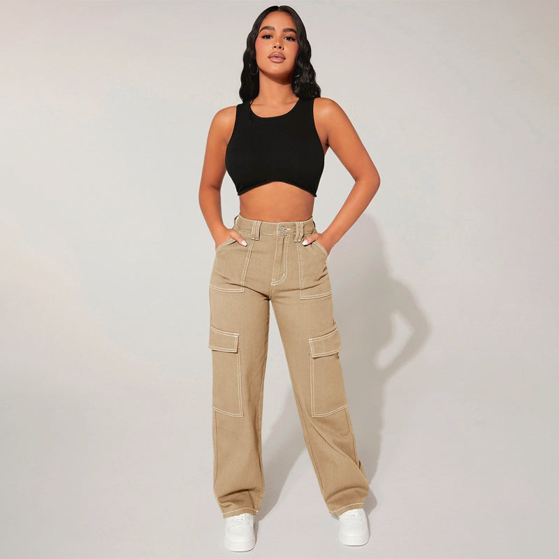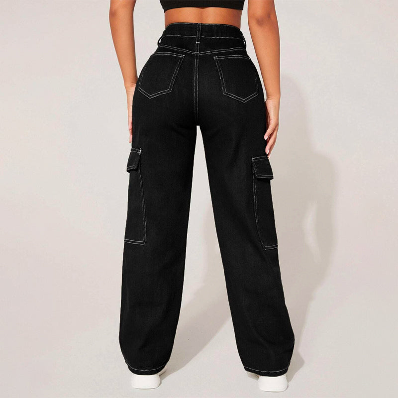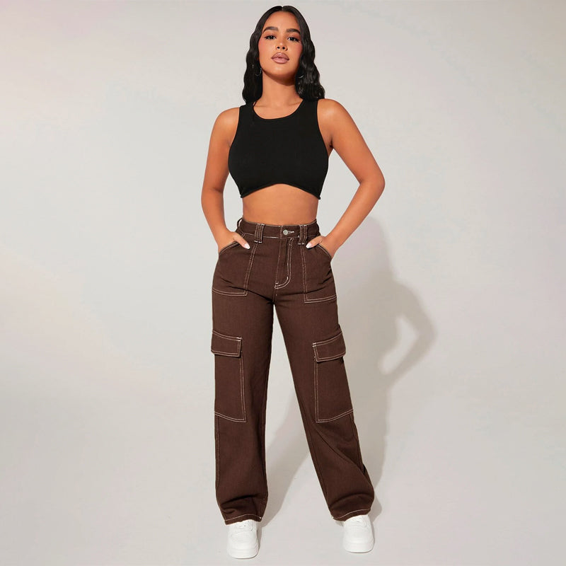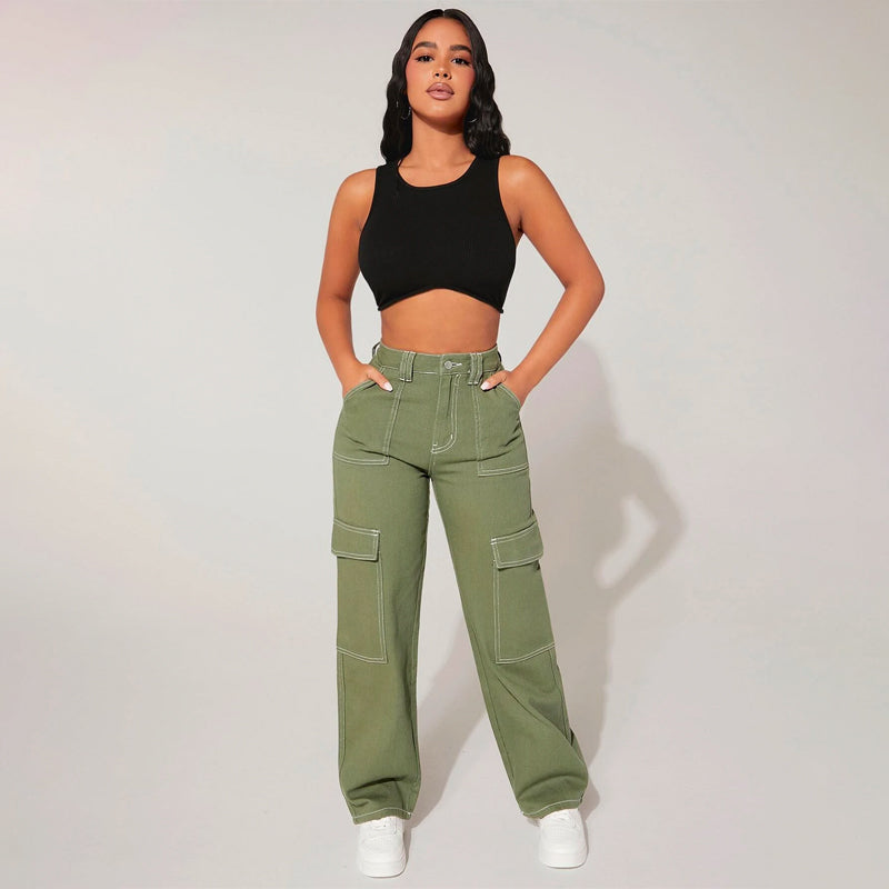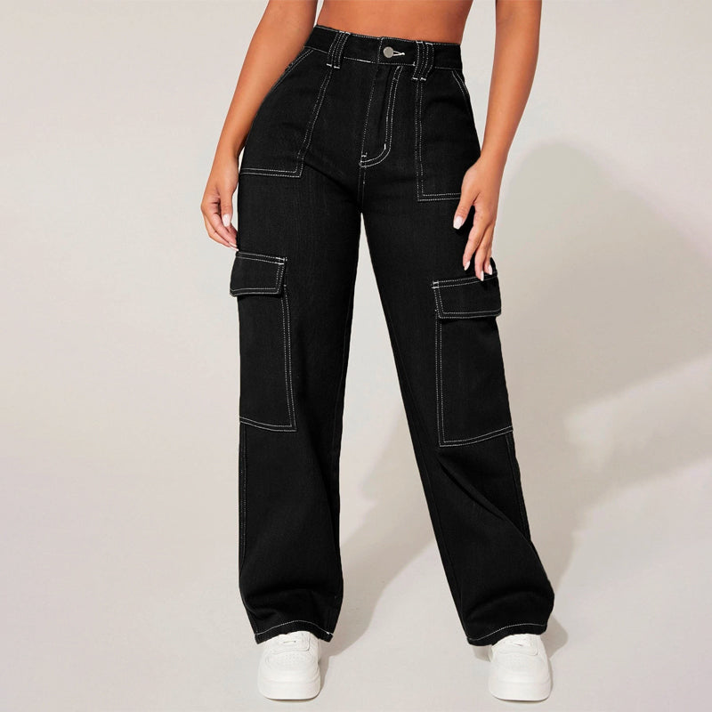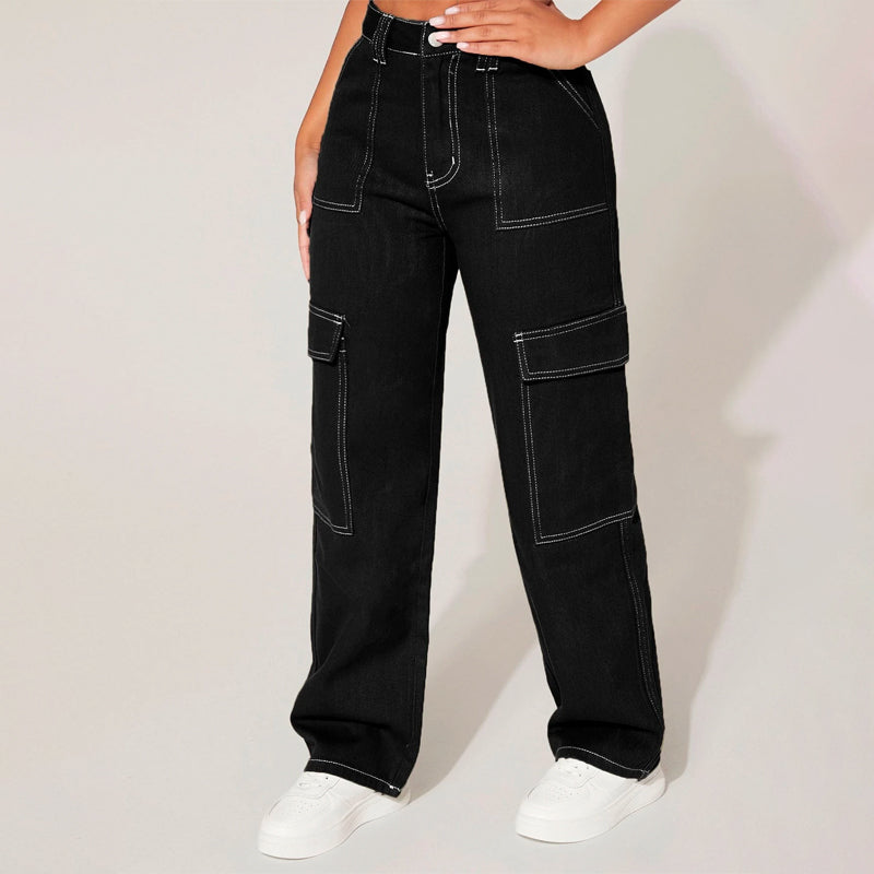 Plain High Waist Flap Pocket Cargo Jeans