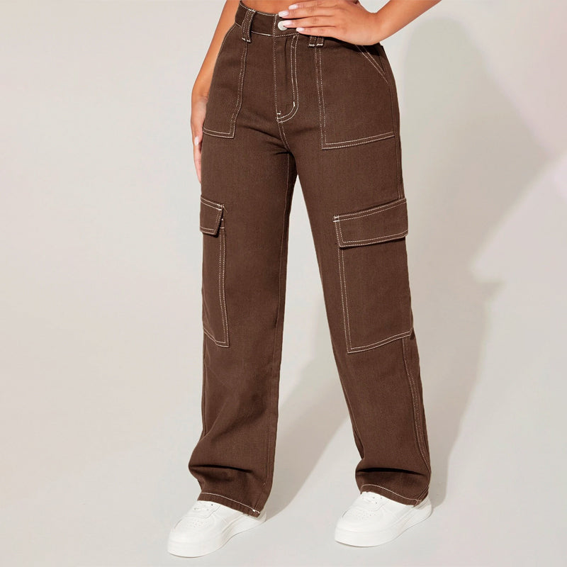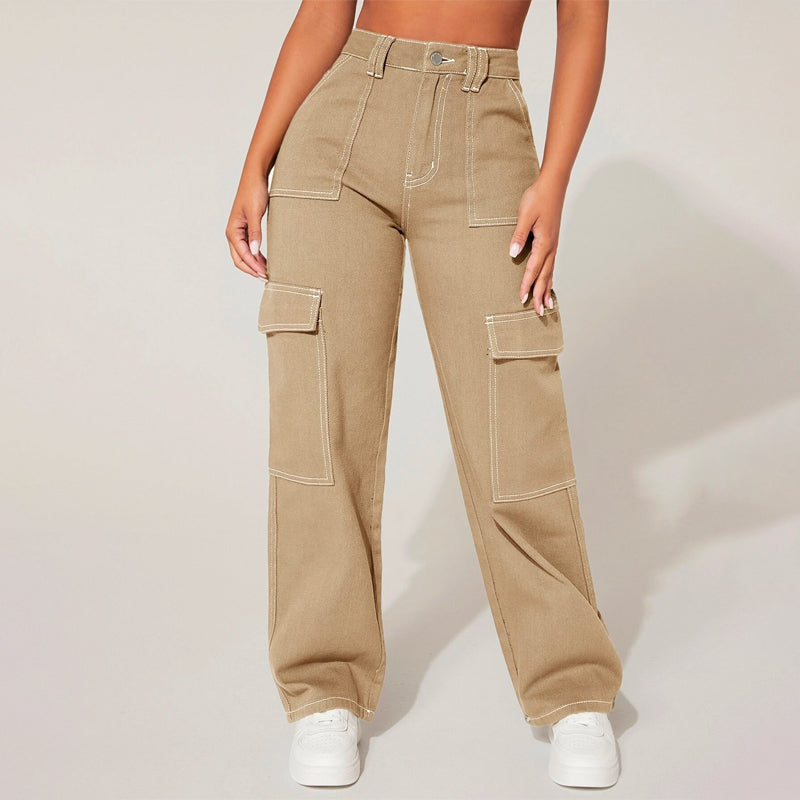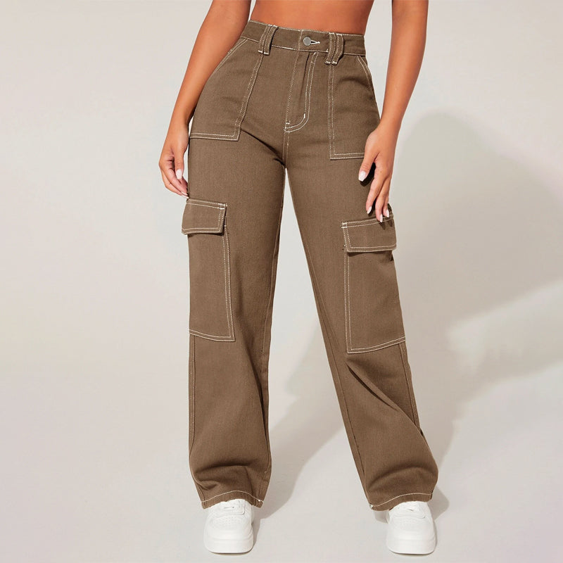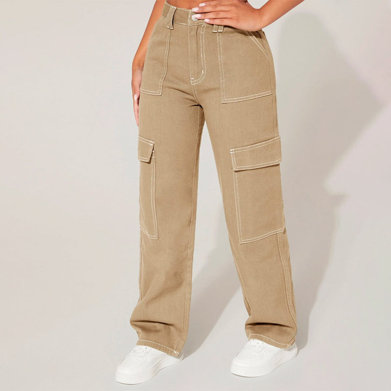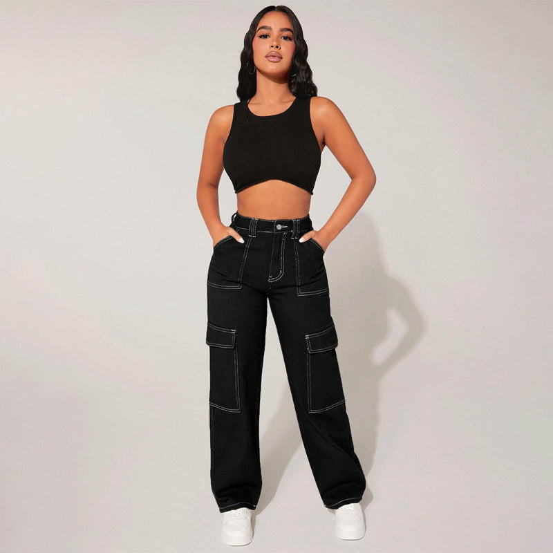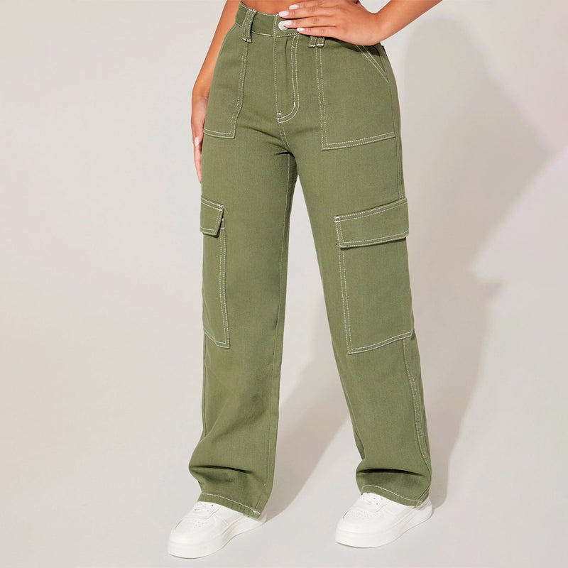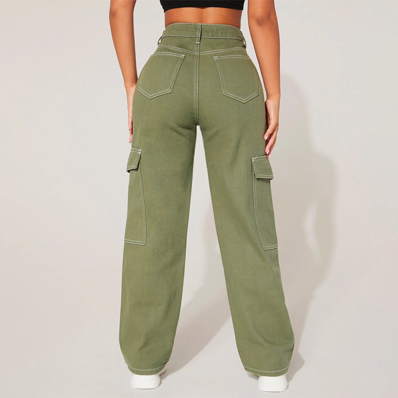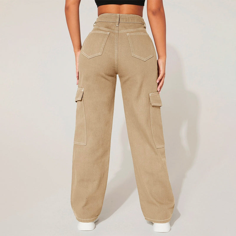 Plain High Waist Flap Pocket Cargo Jeans